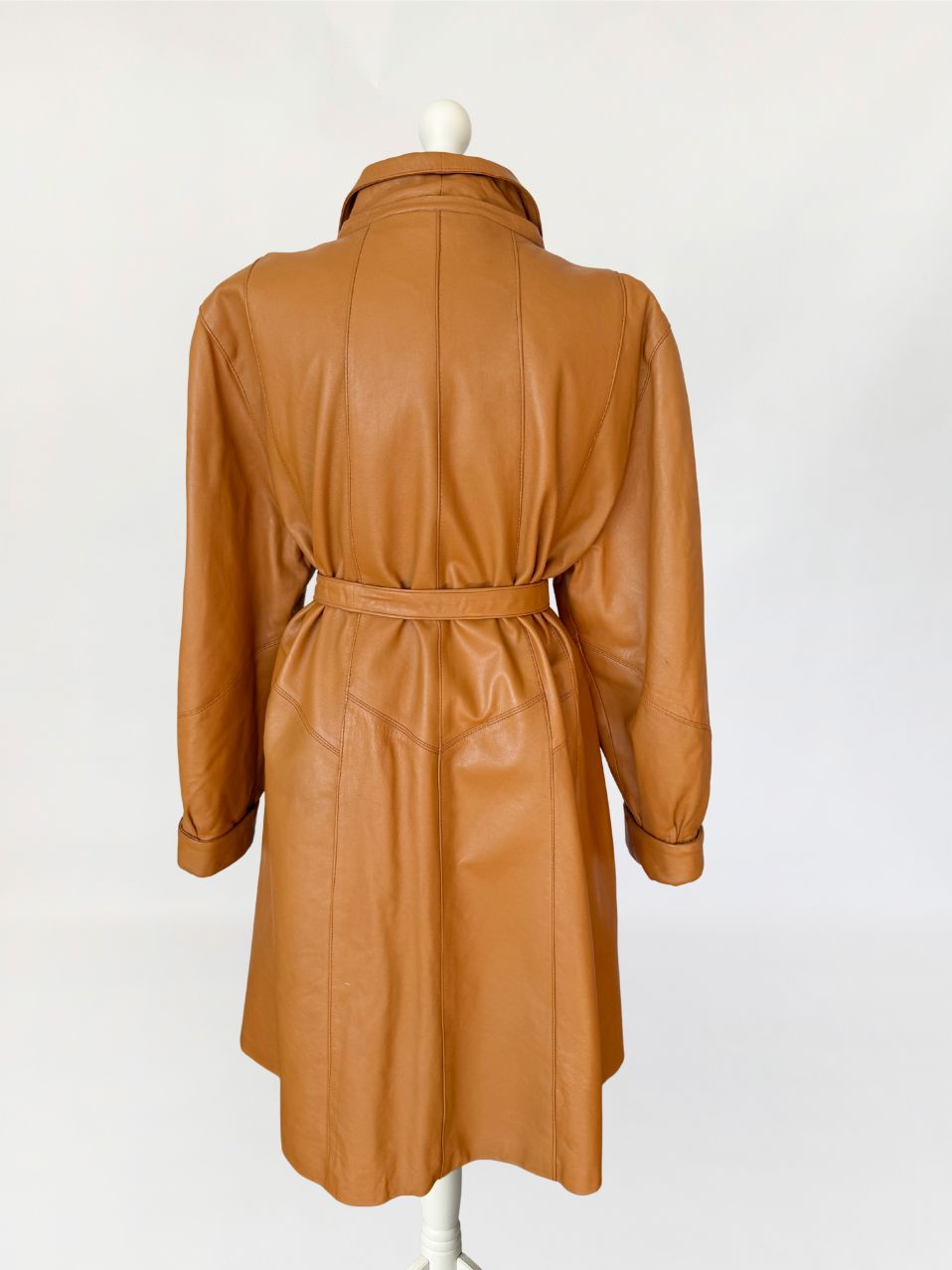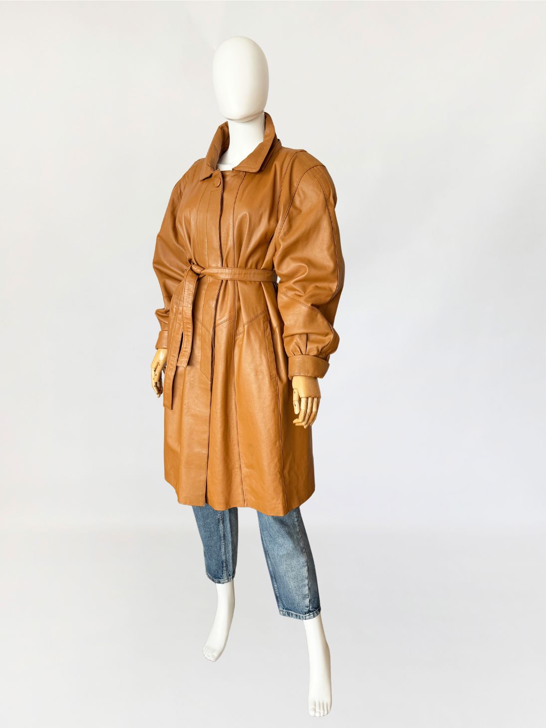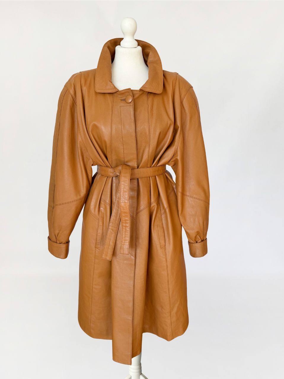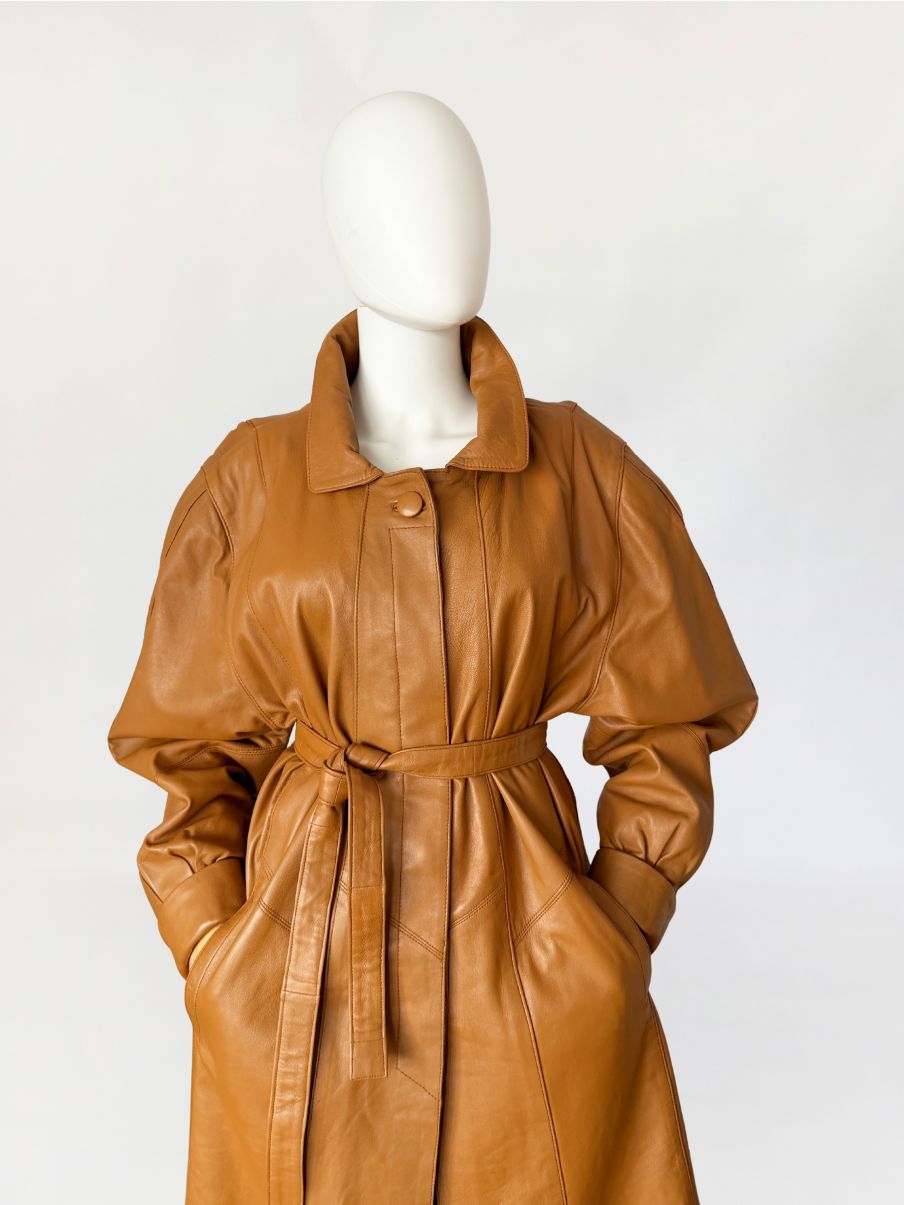 Płaszcz vintage z lat 80-tych wykonany z naturalnej skóry licowej w odcieniu ciepłego camelu. Skóra miękka, plastyczna, o gładkiej powierzchni. Model o długości do kolan, z wyraźnie zaakcentowaną linią ramion z watowaniem. Talia regulowana za pomocą paska. Zapięcie kryte listwą z widocznym pojedynczym guzikiem przy kołnierzu. Kołnierz klasyczny, wykładany, o zaokrąglonych krawędziach. Rękawy obszerne w górnej części, zwężane ku dołowi, zakończone szerokimi mankietami. Kieszenie wpuszczane, osadzone w ukośnych cięciach modelujących. Fason lekko poszerzany do dołu. Wewnątrz wszyty suwak przeznaczony do mocowania podpinki, co wskazuje na pierwotną konstrukcję z odpinaną warstwą ocieplającą.