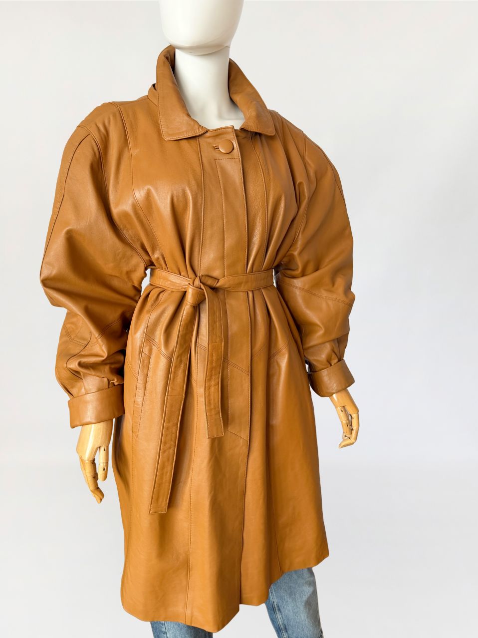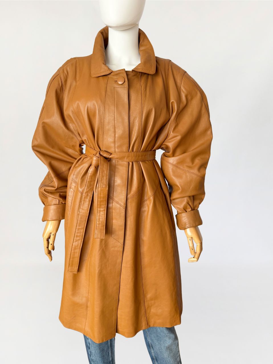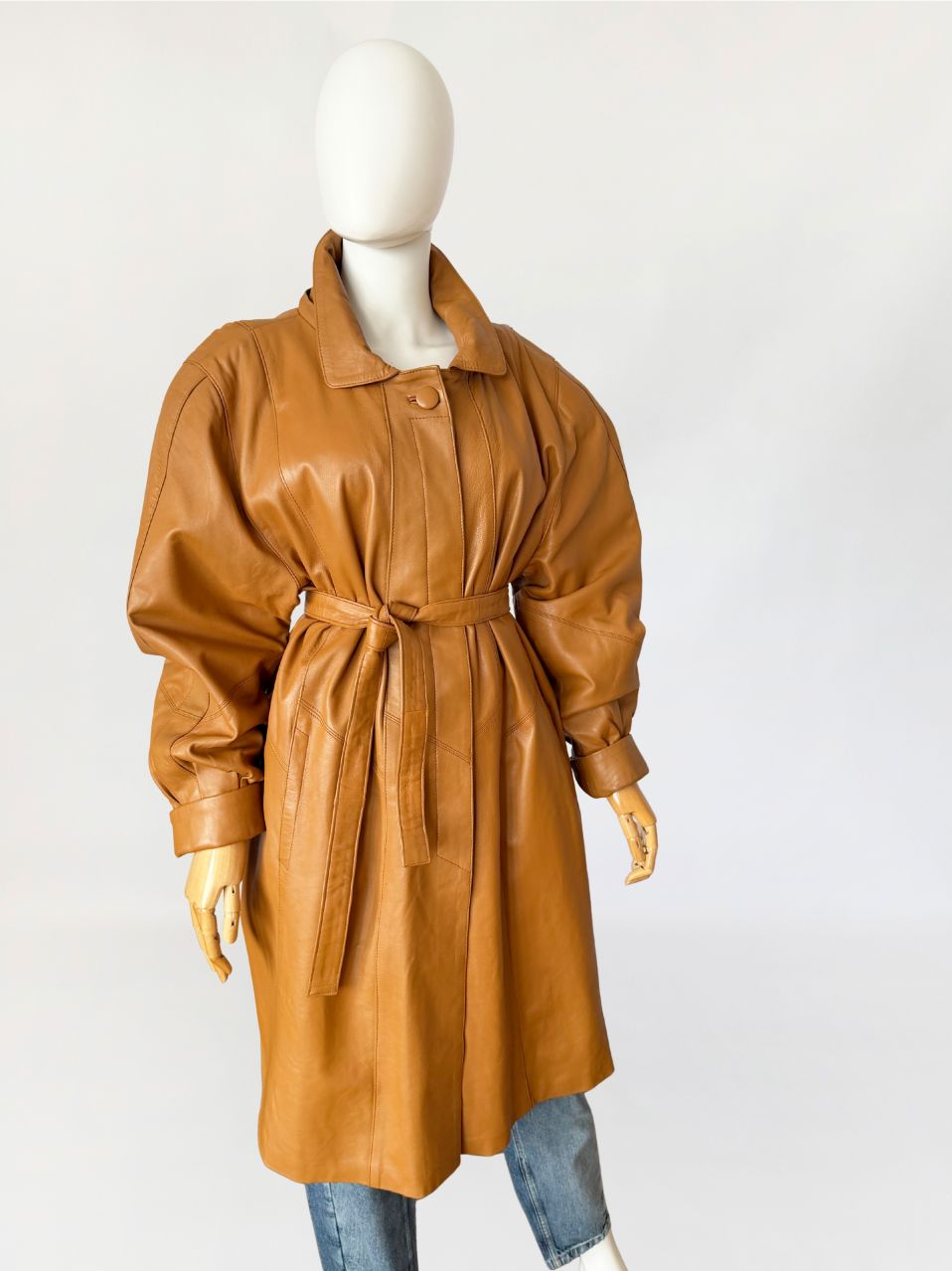 Płaszcz vintage z lat 80-tych wykonany z naturalnej skóry licowej w odcieniu ciepłego camelu. Skóra miękka, plastyczna, o gładkiej powierzchni. Model o długości do kolan, z wyraźnie zaakcentowaną linią ramion z watowaniem. Talia regulowana za pomocą paska. Zapięcie kryte listwą z widocznym pojedynczym guzikiem przy kołnierzu. Kołnierz klasyczny, wykładany, o zaokrąglonych krawędziach. Rękawy obszerne w górnej części, zwężane ku dołowi, zakończone szerokimi mankietami. Kieszenie wpuszczane, osadzone w ukośnych cięciach modelujących. Fason lekko poszerzany do dołu. Wewnątrz wszyty suwak przeznaczony do mocowania podpinki, co wskazuje na pierwotną konstrukcję z odpinaną warstwą ocieplającą.