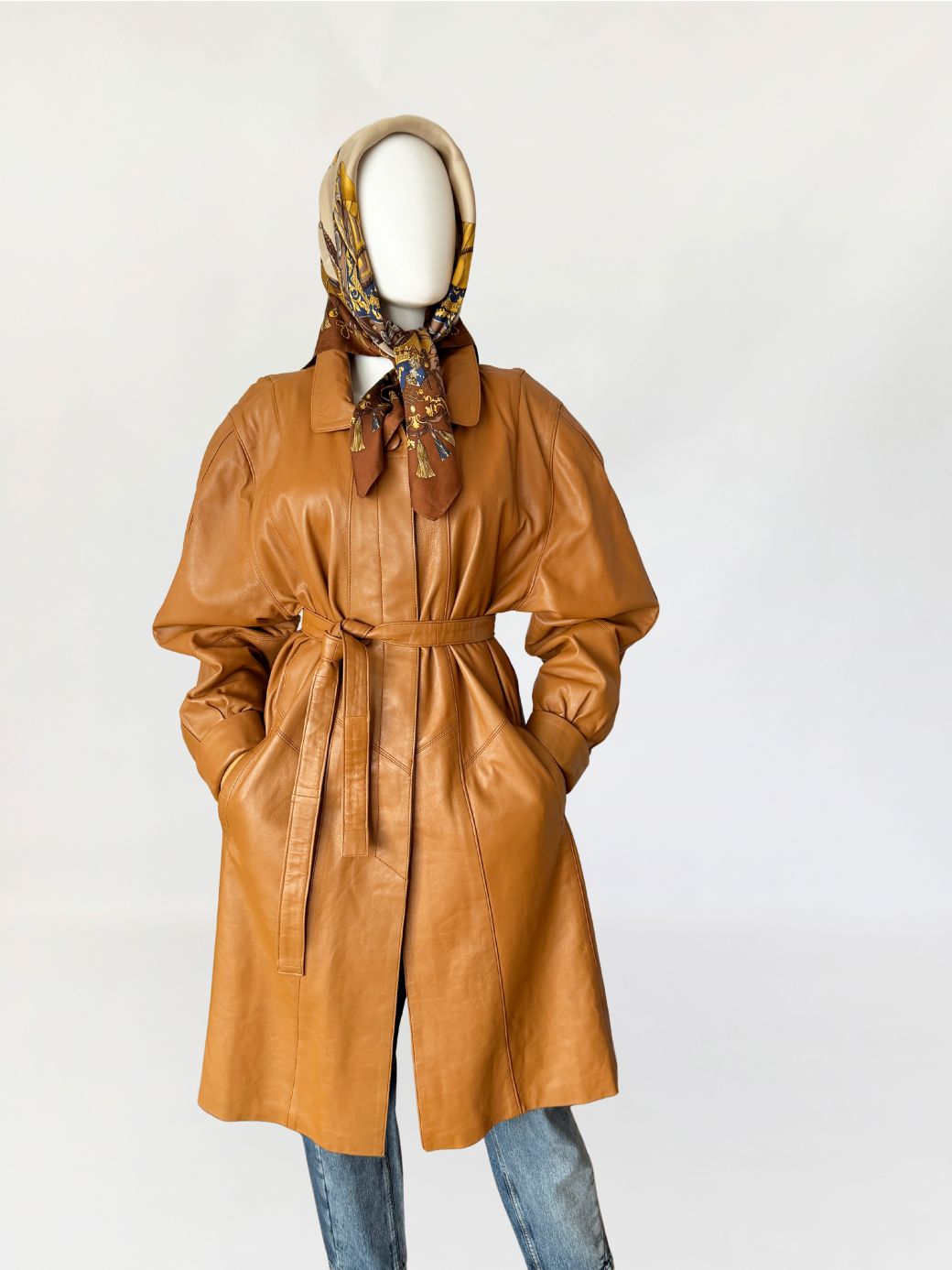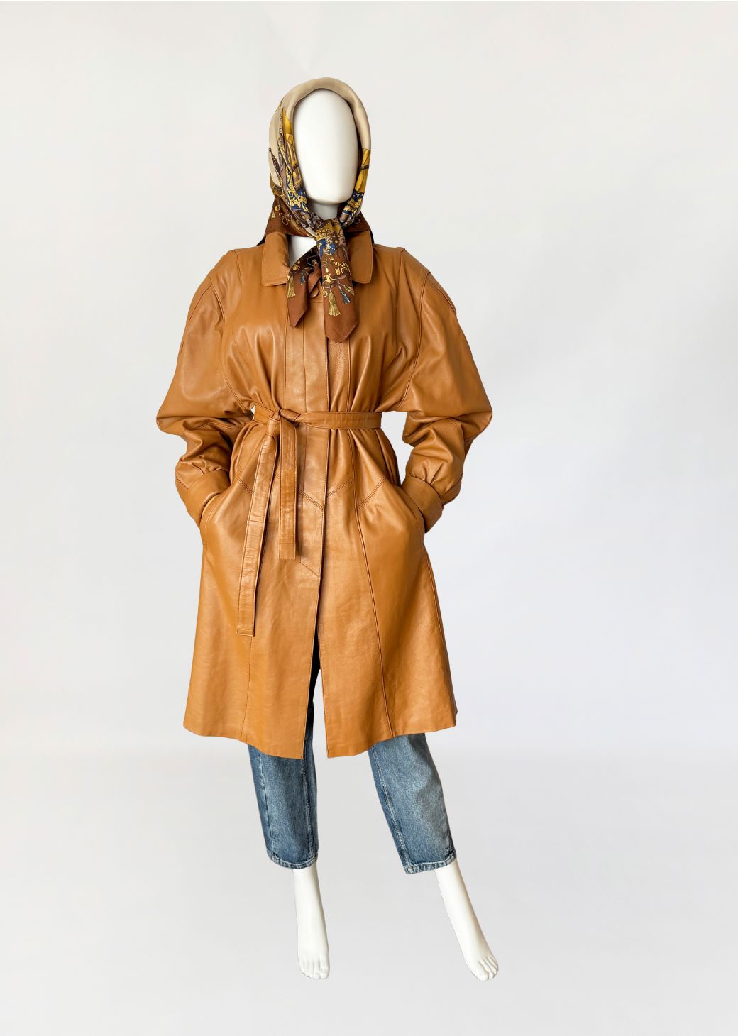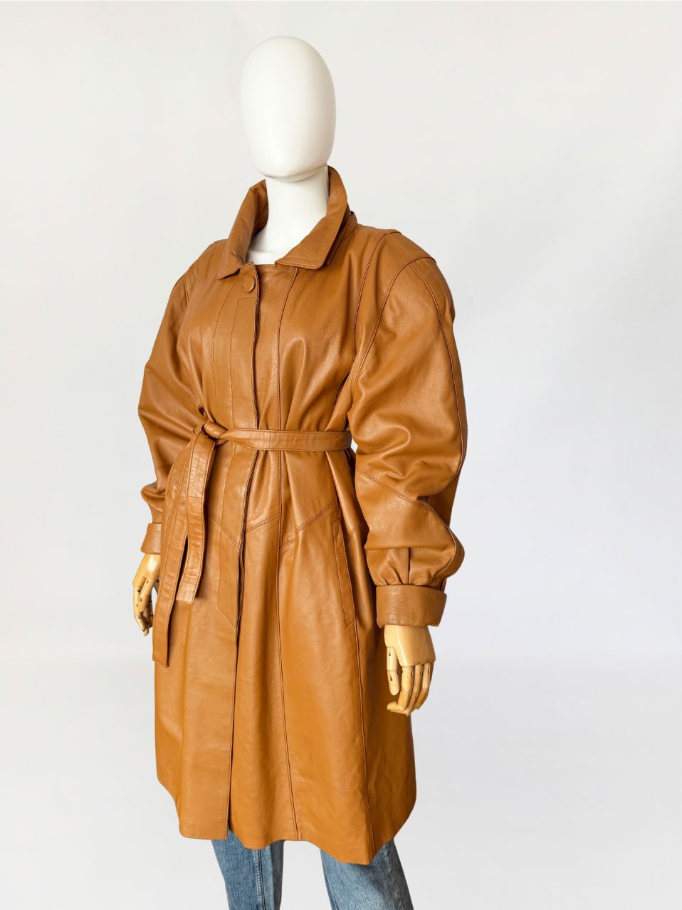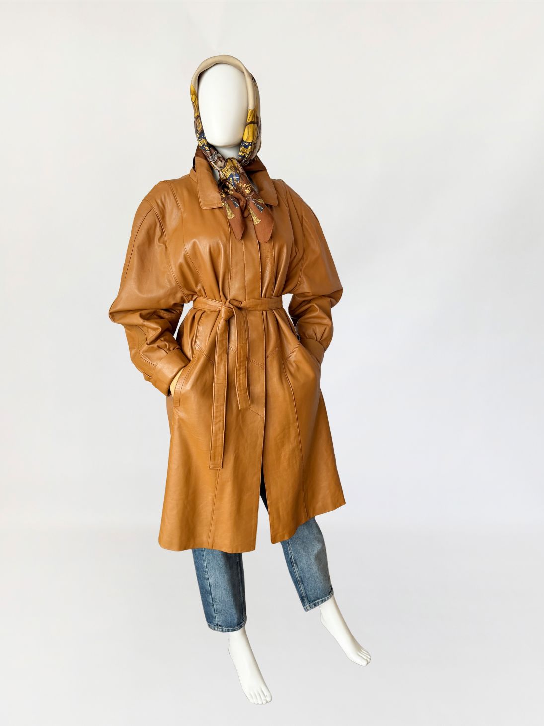 Płaszcz vintage z lat 80-tych wykonany z naturalnej skóry licowej w odcieniu ciepłego camelu. Skóra miękka, plastyczna, o gładkiej powierzchni. Model o długości do kolan, z wyraźnie zaakcentowaną linią ramion z watowaniem. Talia regulowana za pomocą paska. Zapięcie kryte listwą z widocznym pojedynczym guzikiem przy kołnierzu. Kołnierz klasyczny, wykładany, o zaokrąglonych krawędziach. Rękawy obszerne w górnej części, zwężane ku dołowi, zakończone szerokimi mankietami. Kieszenie wpuszczane, osadzone w ukośnych cięciach modelujących. Fason lekko poszerzany do dołu. Wewnątrz wszyty suwak przeznaczony do mocowania podpinki, co wskazuje na pierwotną konstrukcję z odpinaną warstwą ocieplającą.