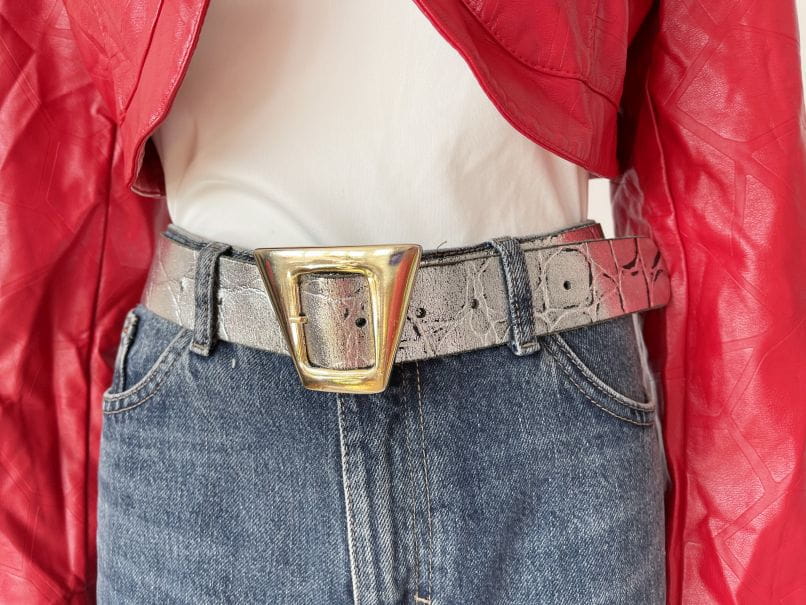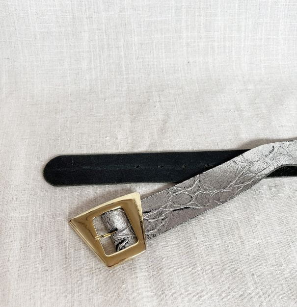Stylowy pasek vintage wykonany ze skóry naturalnej w kolorze srebrnym. Spora złota trapezowa klamra. Regulowany obwód.