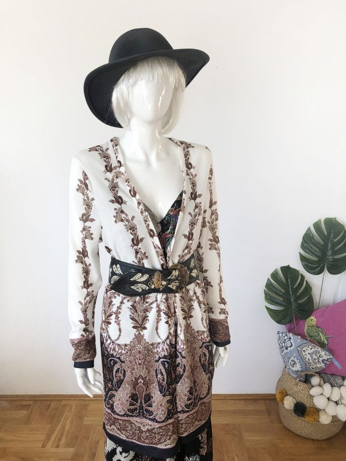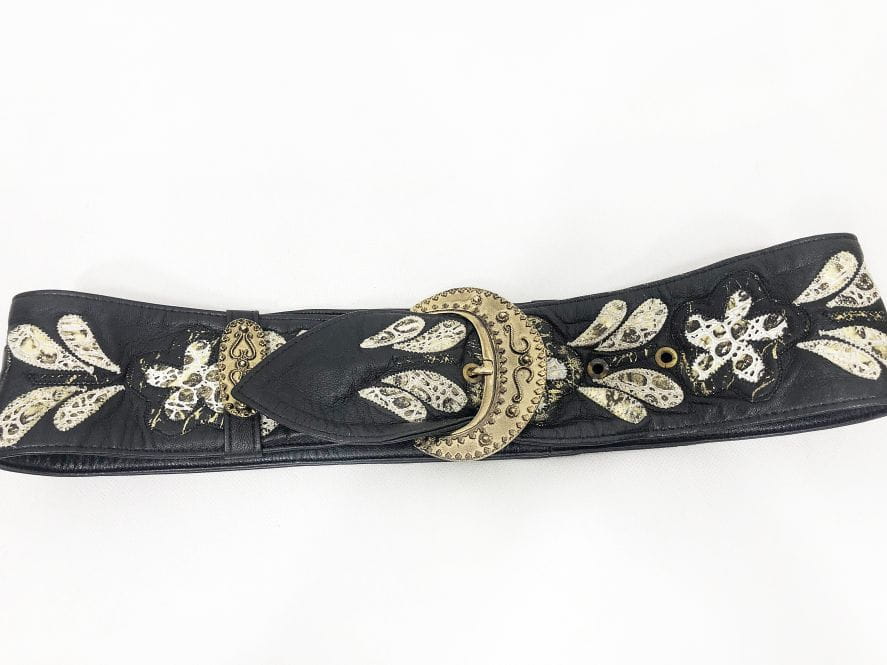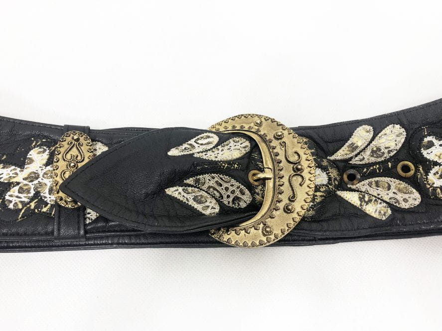 Szeroki pas vintage z ozdobnymi obszyciami malowanymi aplikacjami. Wykonany z miękkiej skóry naturalnej w kolorze czarnym. Ozdobna duża klamra.