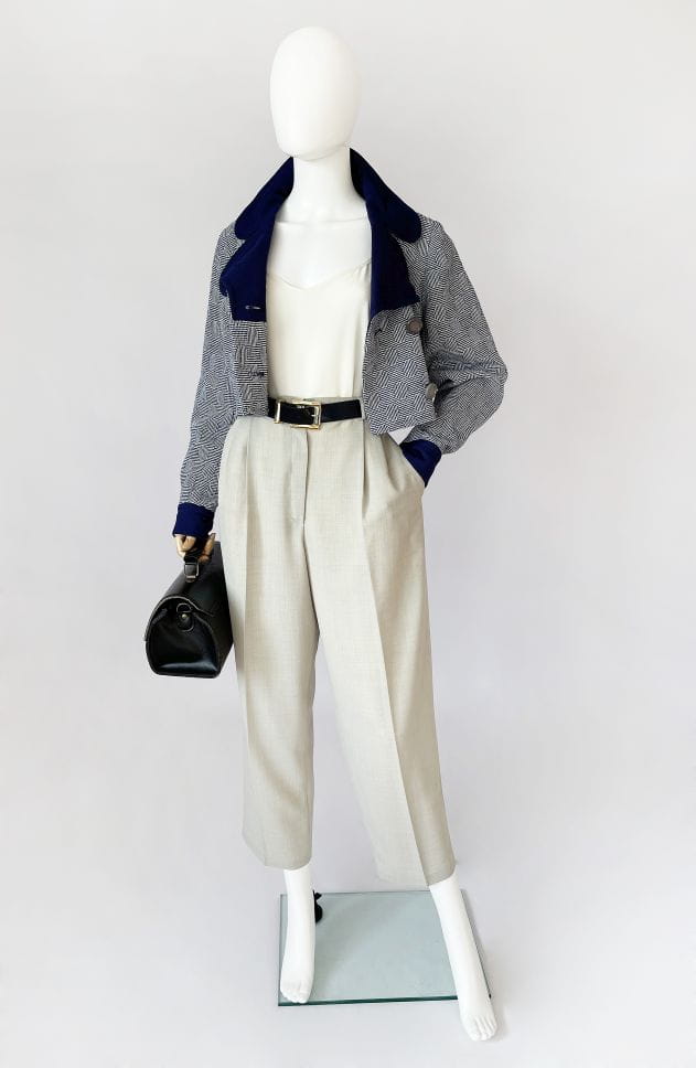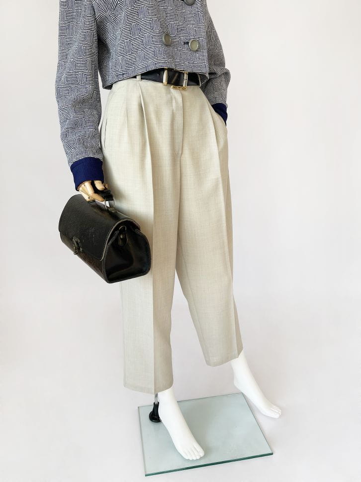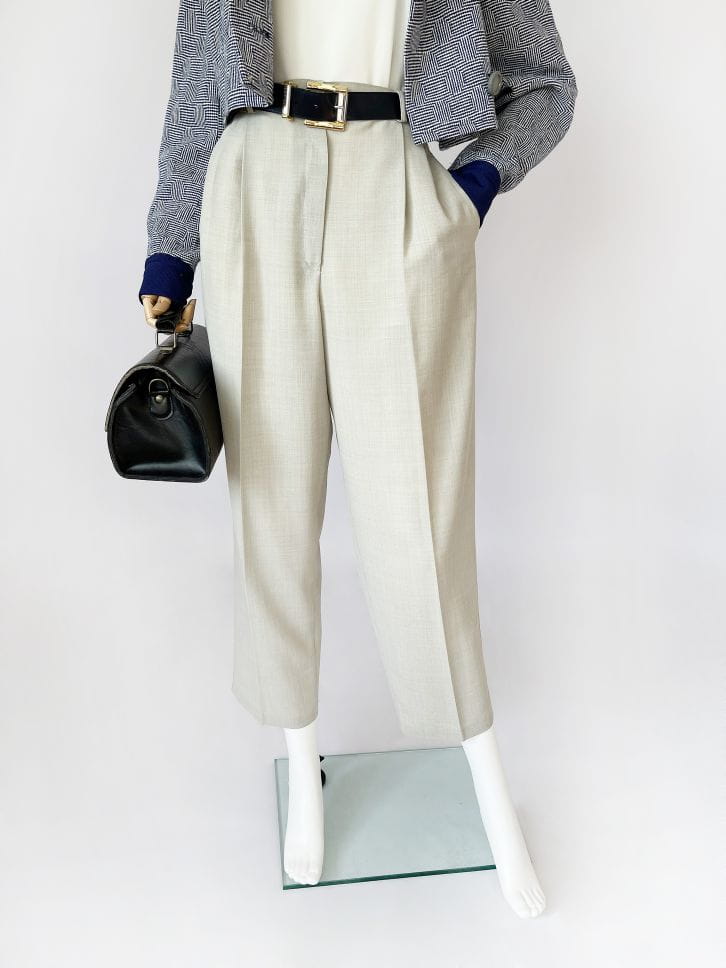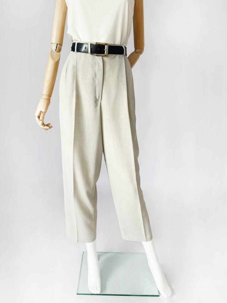 Spodnie vintage wykonane z lekkiej tkaniny w surowym beżowo-szarym odcieniu. Model z wyższym stanem i nogawkami w kant, które sięgają do kostek. Po bokach wsuwane kieszenie. Uniwersalny model, pasujący zarówno do szpilek jak i sneakersów.