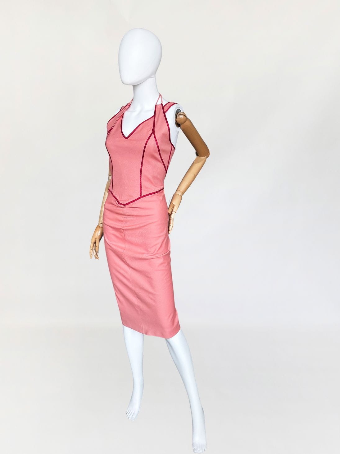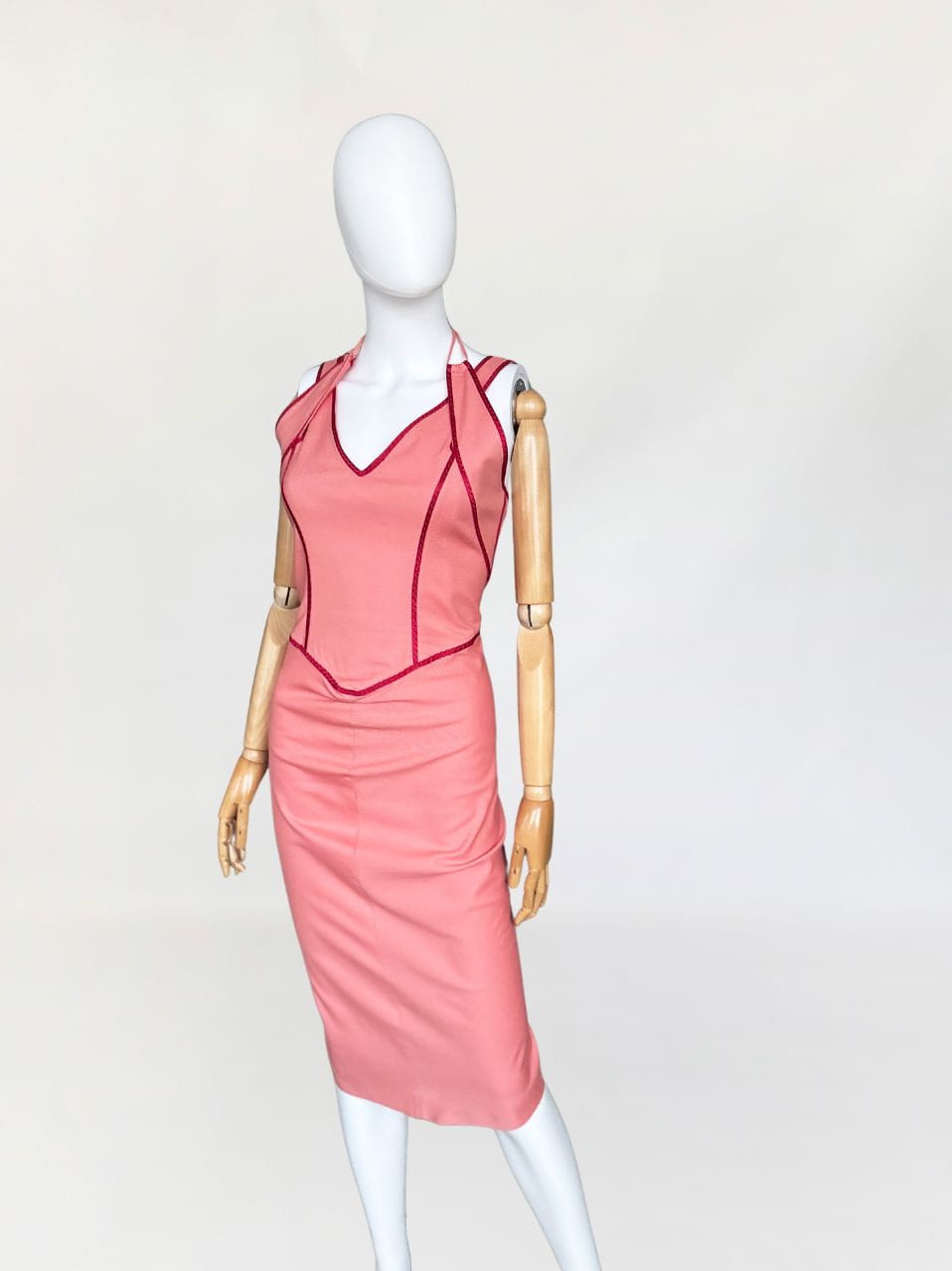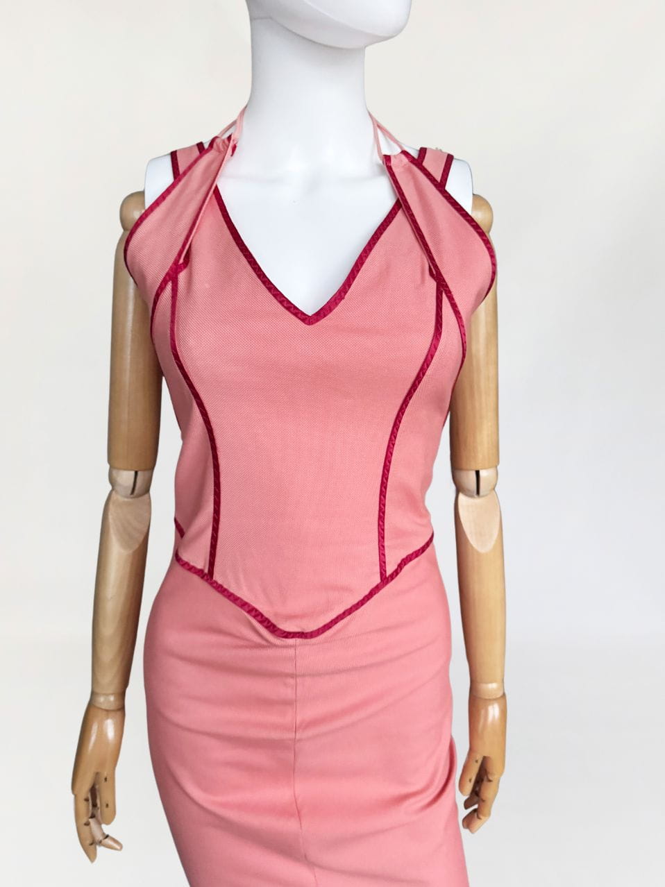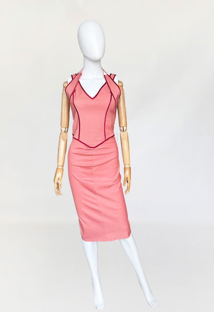Sukienka renomowanej marki Sportmax z grupy Max Mara. Dopasowany fason o długości midi. U góry podwójne ramiączka. Wykonana z bawełniano - wiskozowej tkaniny w kolorze różowym, z jedwabną czerwoną lamówką. Podszewka w górnej części.