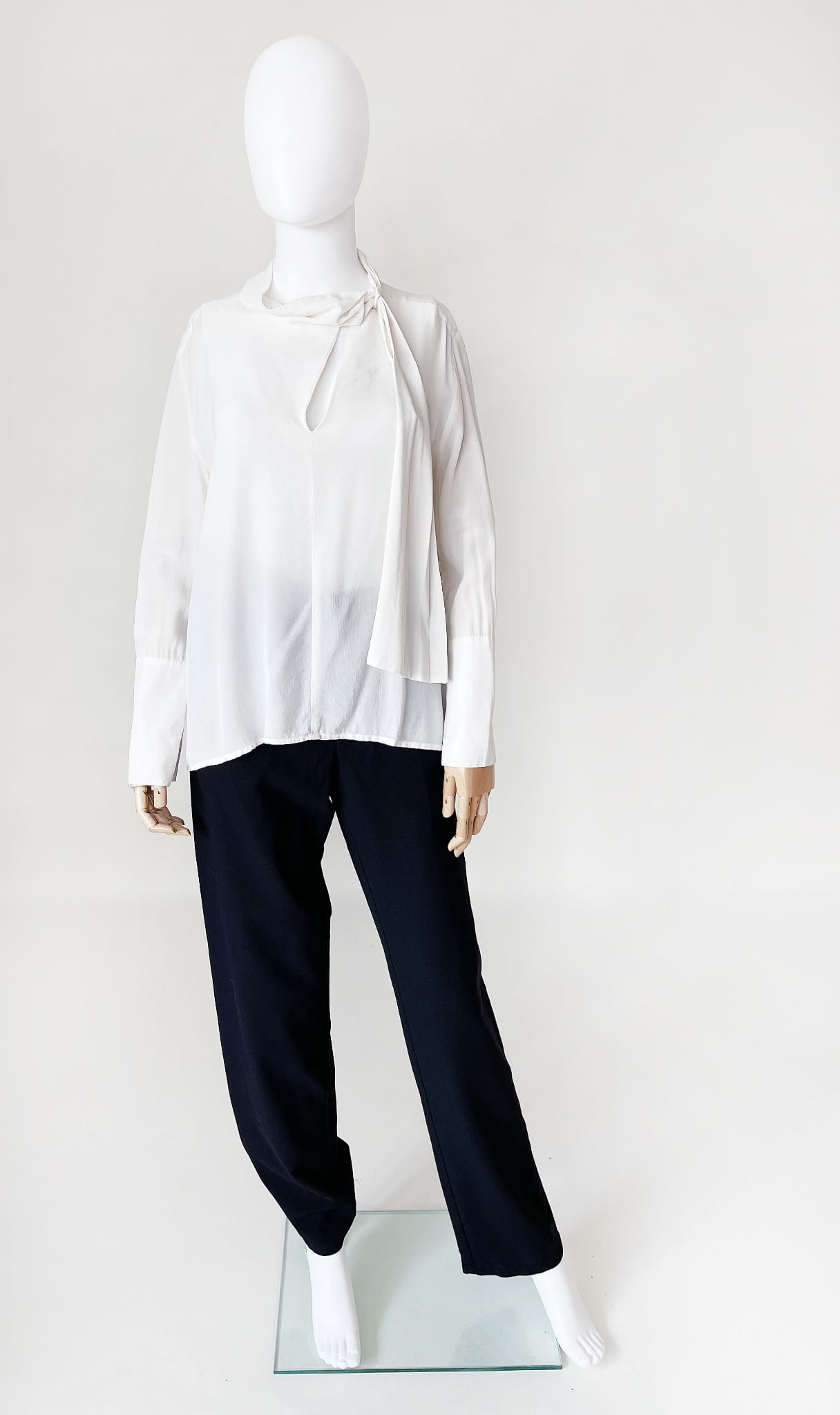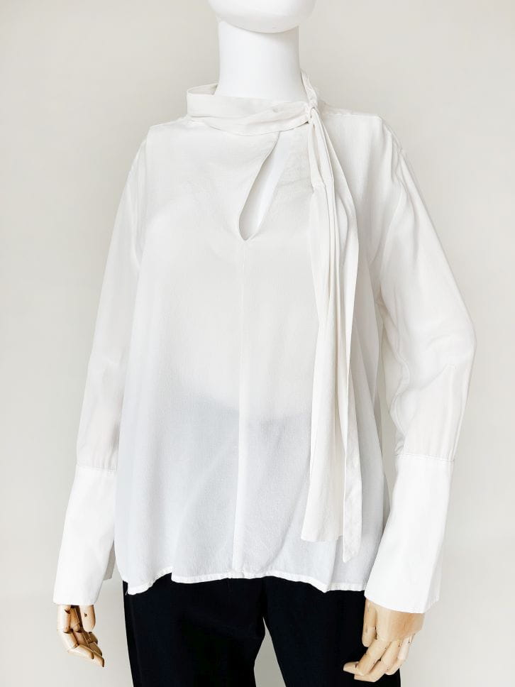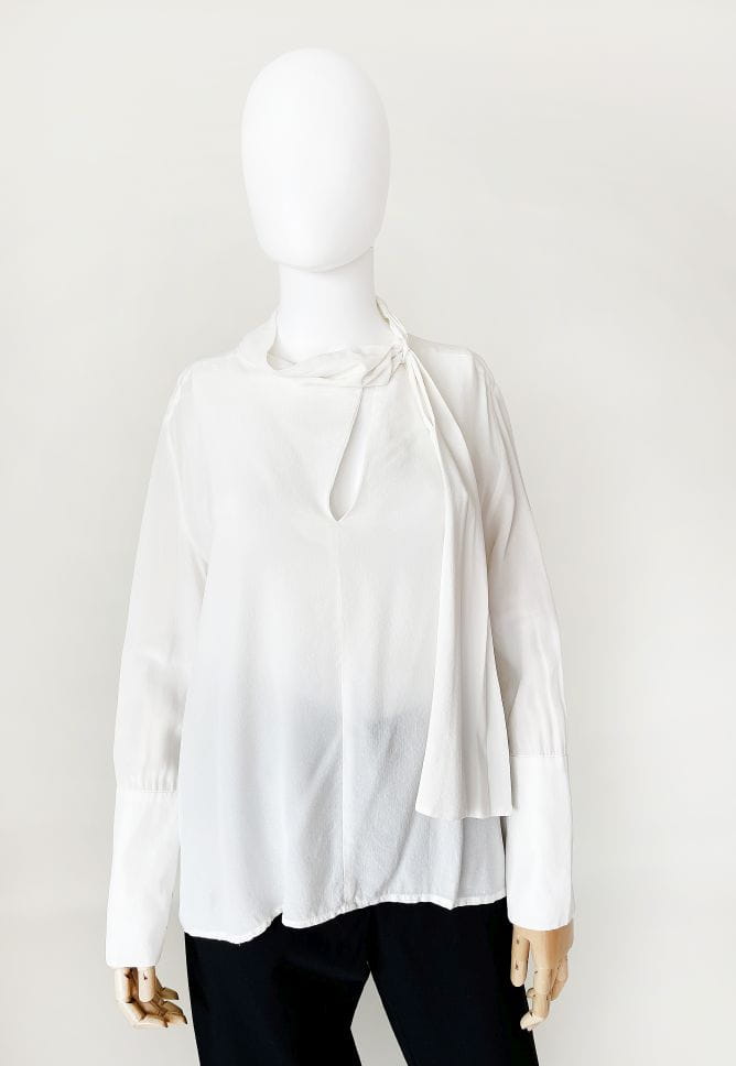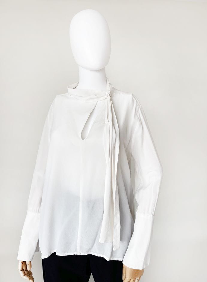 Minimalistyczna bluzka renomowanej marki Sportmax z grupy MaxMara. Wykonana z lekkiej jedwabnej tkaniny w mlecznym kolorze. Prosty fason z lekko dłuższym tyłem. Długie rękawy zakończone wysokimi ściągaczami. U góry rozcięcie oraz jednostronna plisowana szarfa przeplatana przez stójkę.