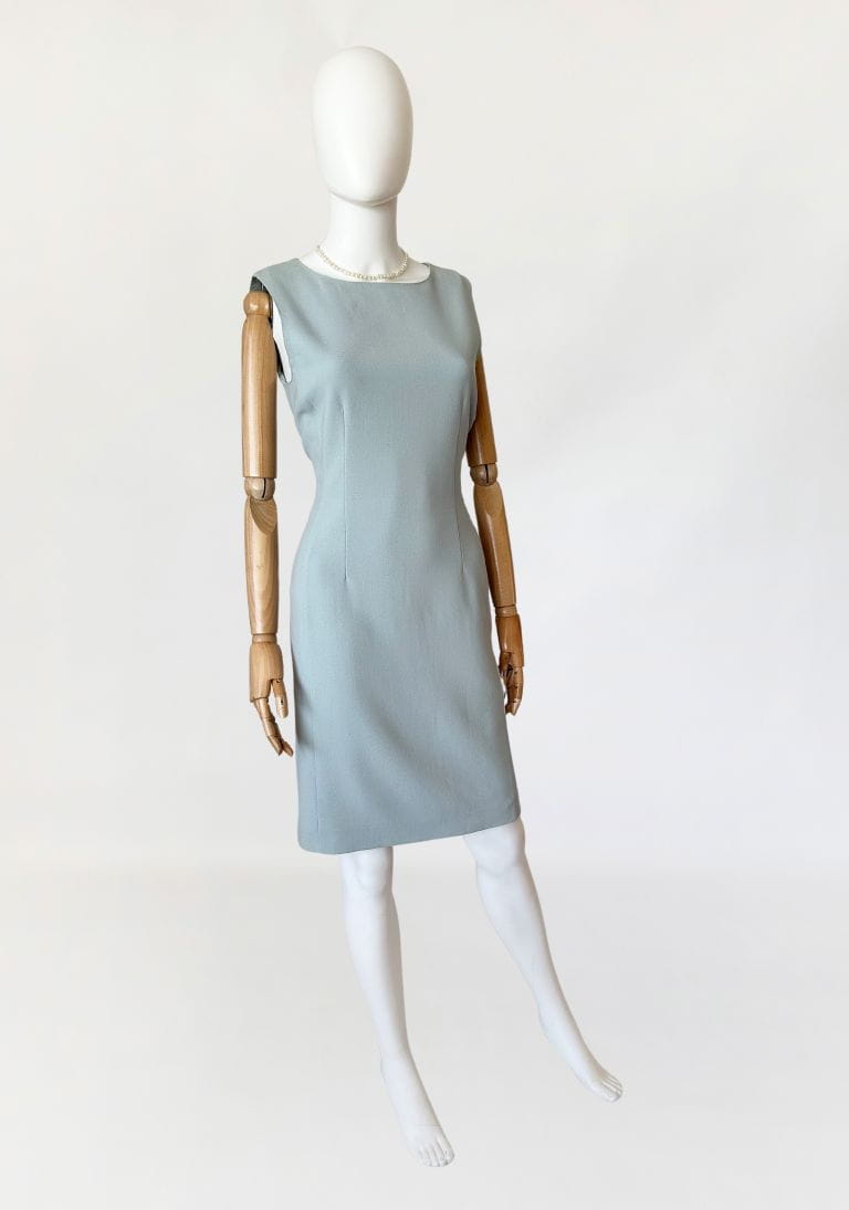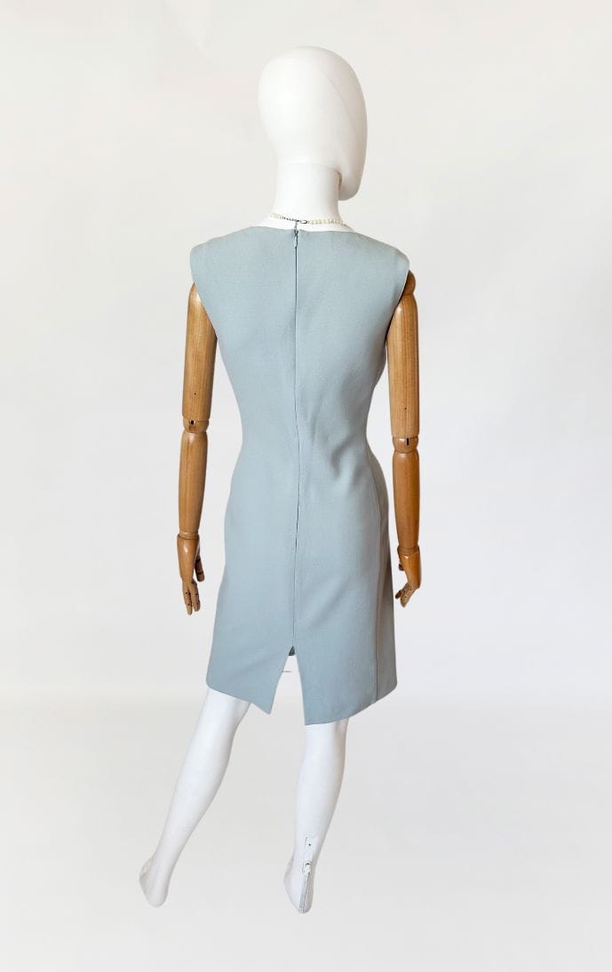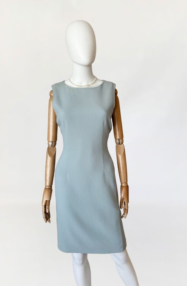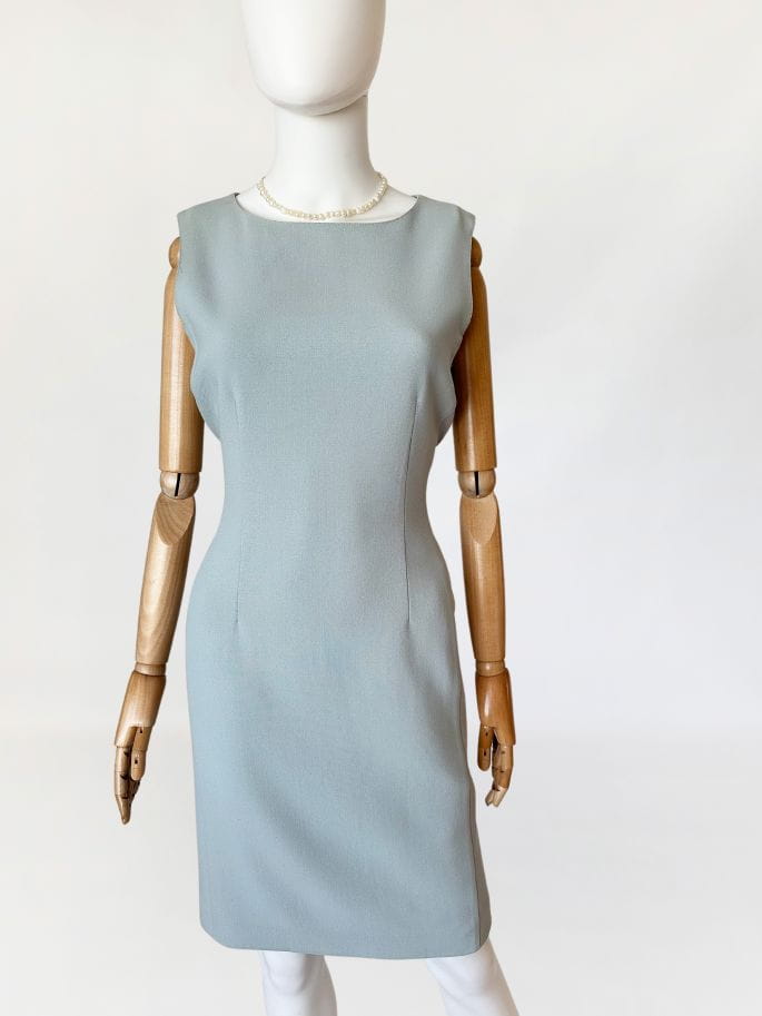 Minimalistyczna sukienka marki Sportmax, z grupy Max Mara. Wykonana z lekkiej wełnianej tkaniny w kolorze baby blue. Taliowany fason o długości midi.