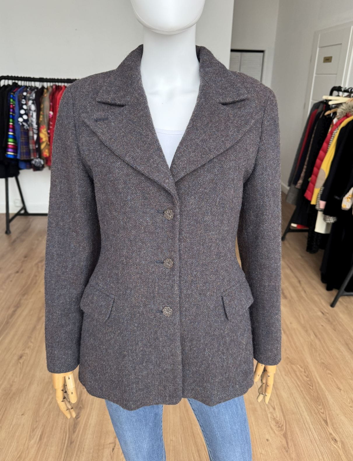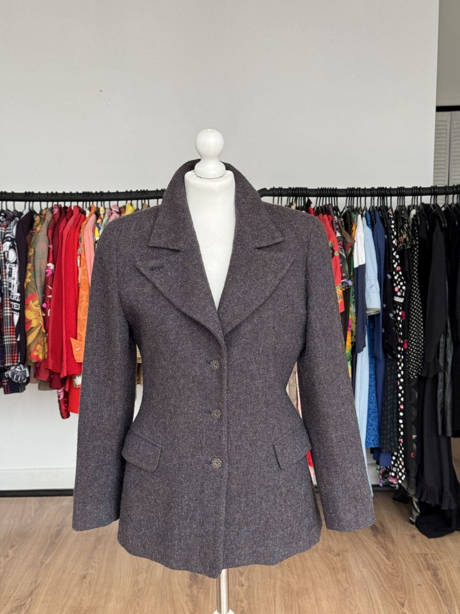 Marynarka vintage marki Sportmax Max Mara. Wykonana w całości z wełny dziewiczej o melanżowym deseniu. Taliowany fason z jednorzędowym zapięciem na metalowe ozdobne guziki w kształcie kwiatów. W dolnej części kieszenie z klapami