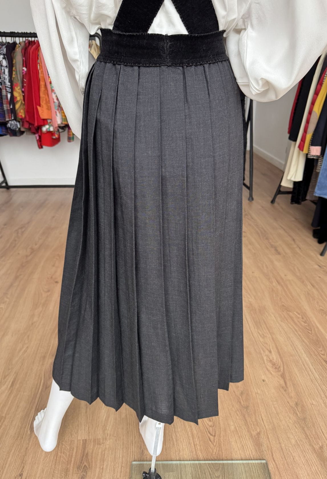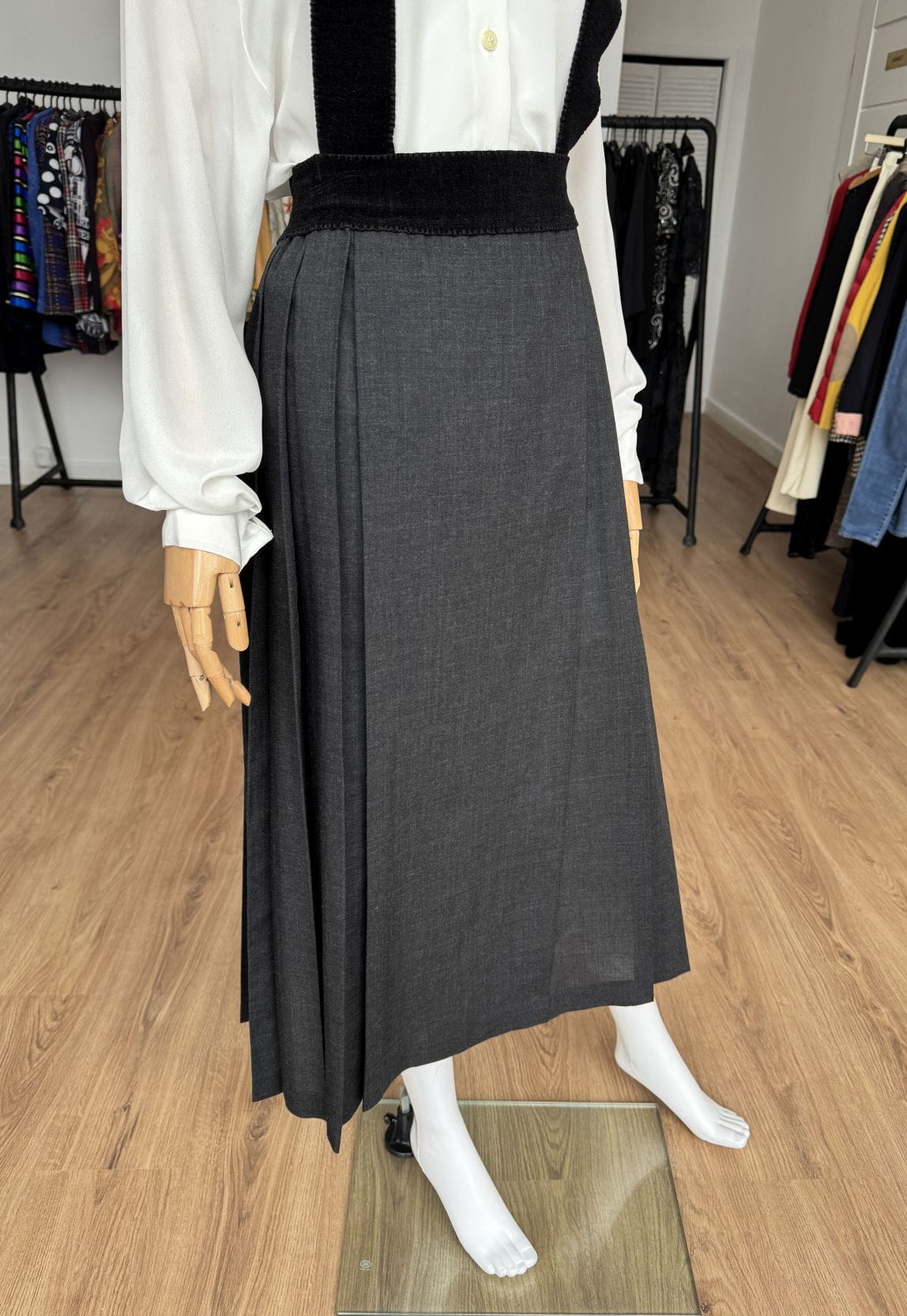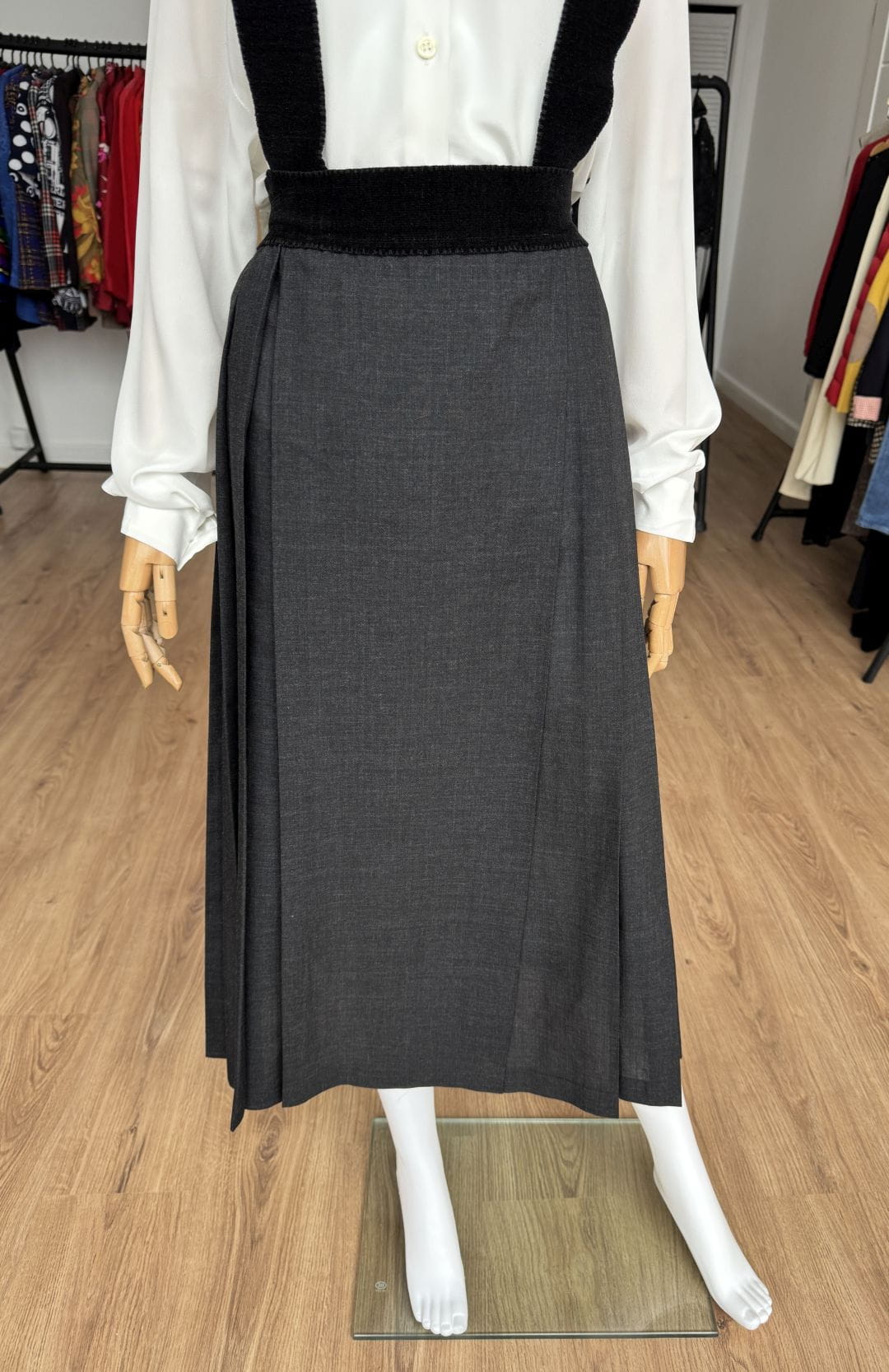 Spódnica vintage z przełomu lat 80-tych/90-tych marki Stefanel. Model o długości midi. Od frontu kopertowa zakładka, boki i tył plisowane. Pas elastyczny, z szerokimi szelkami.
