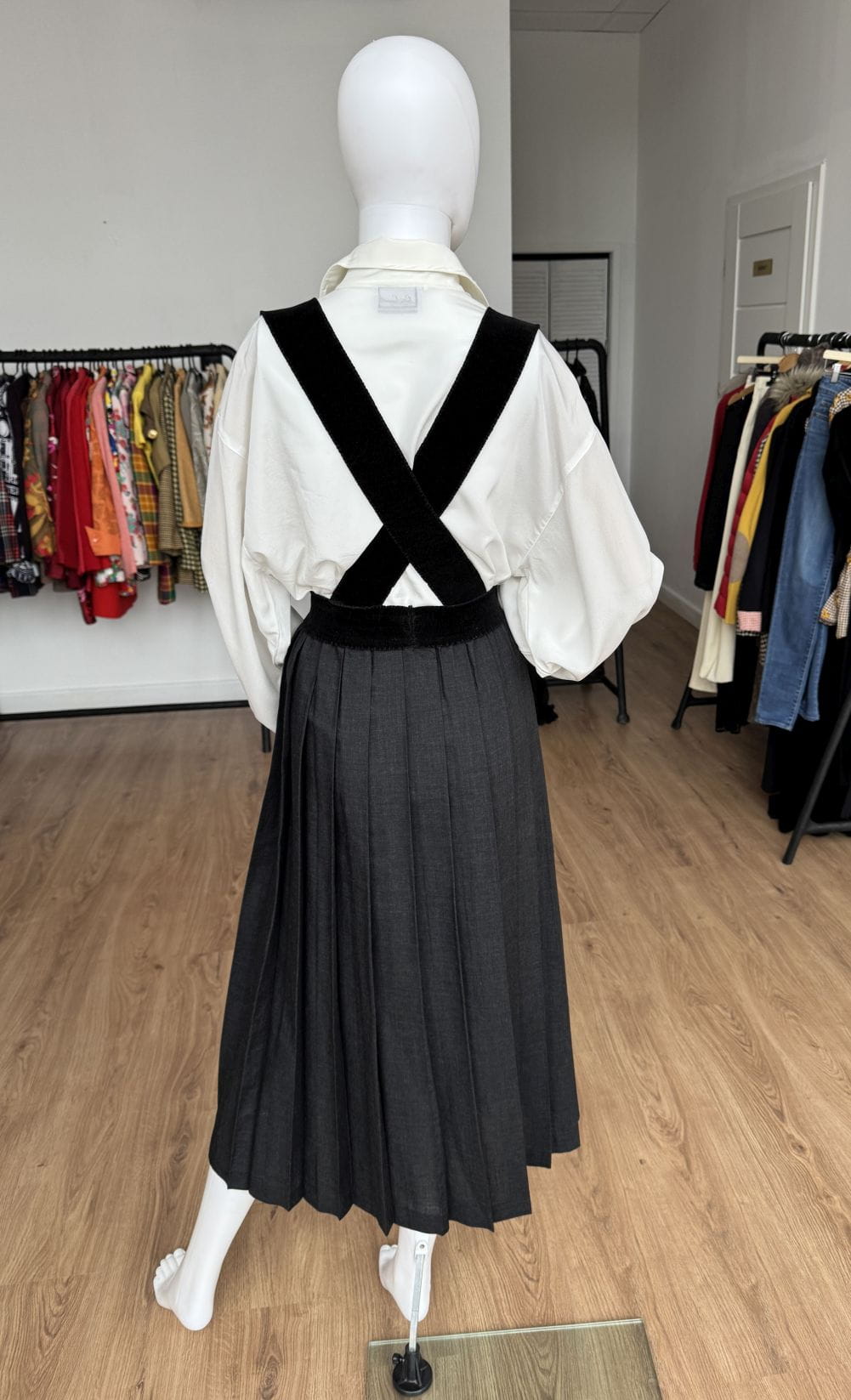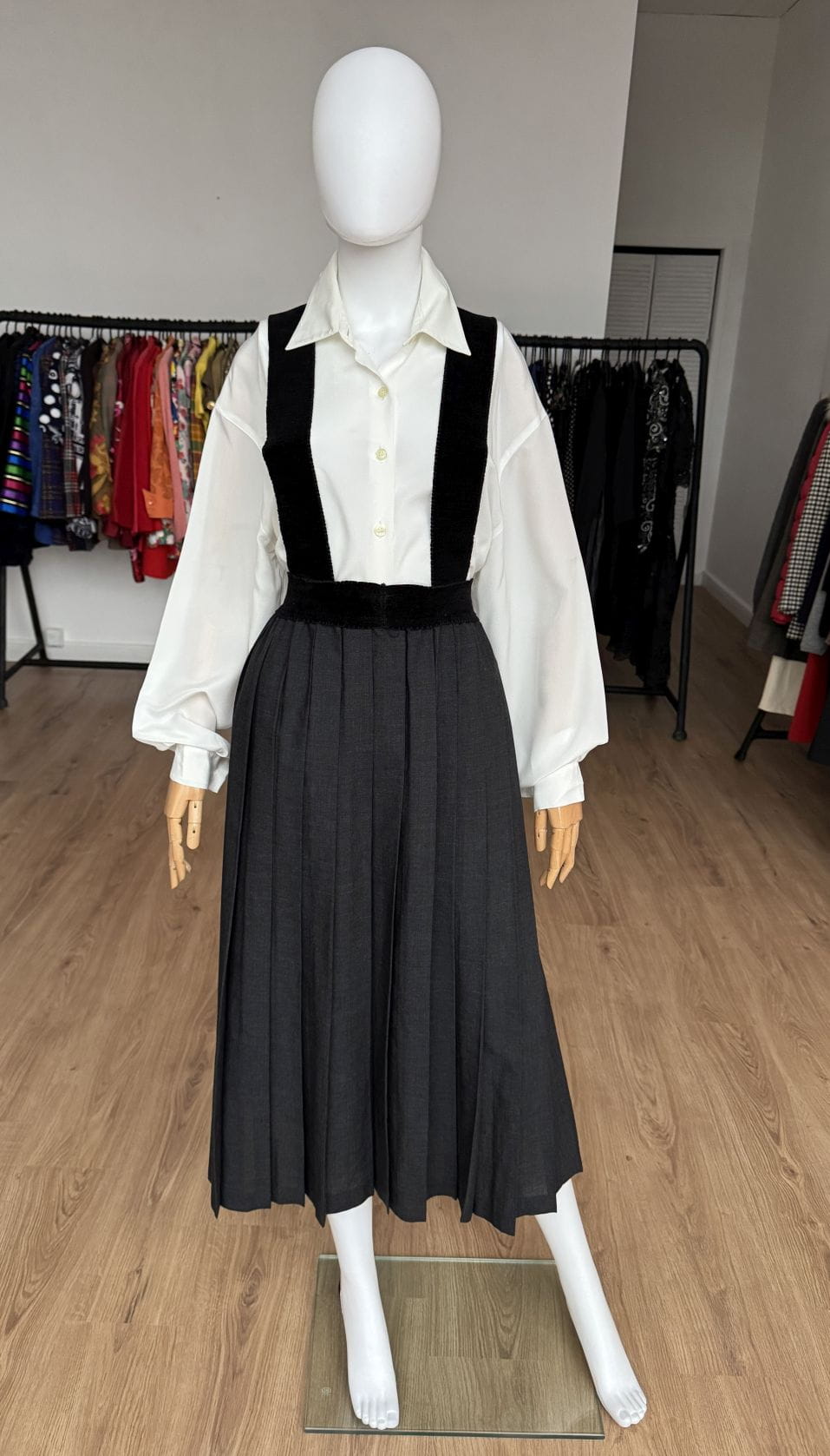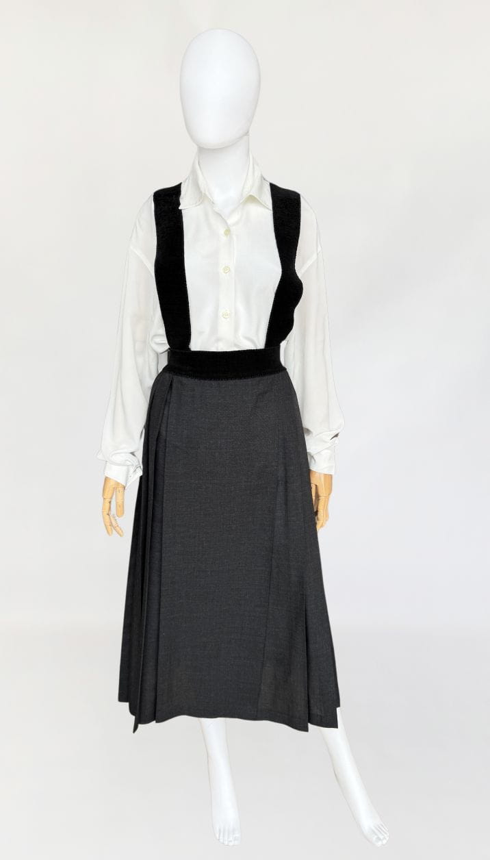 Spódnica vintage z przełomu lat 80-tych/90-tych marki Stefanel. Model o długości midi. Od frontu kopertowa zakładka, boki i tył plisowane. Pas elastyczny, z szerokimi szelkami.