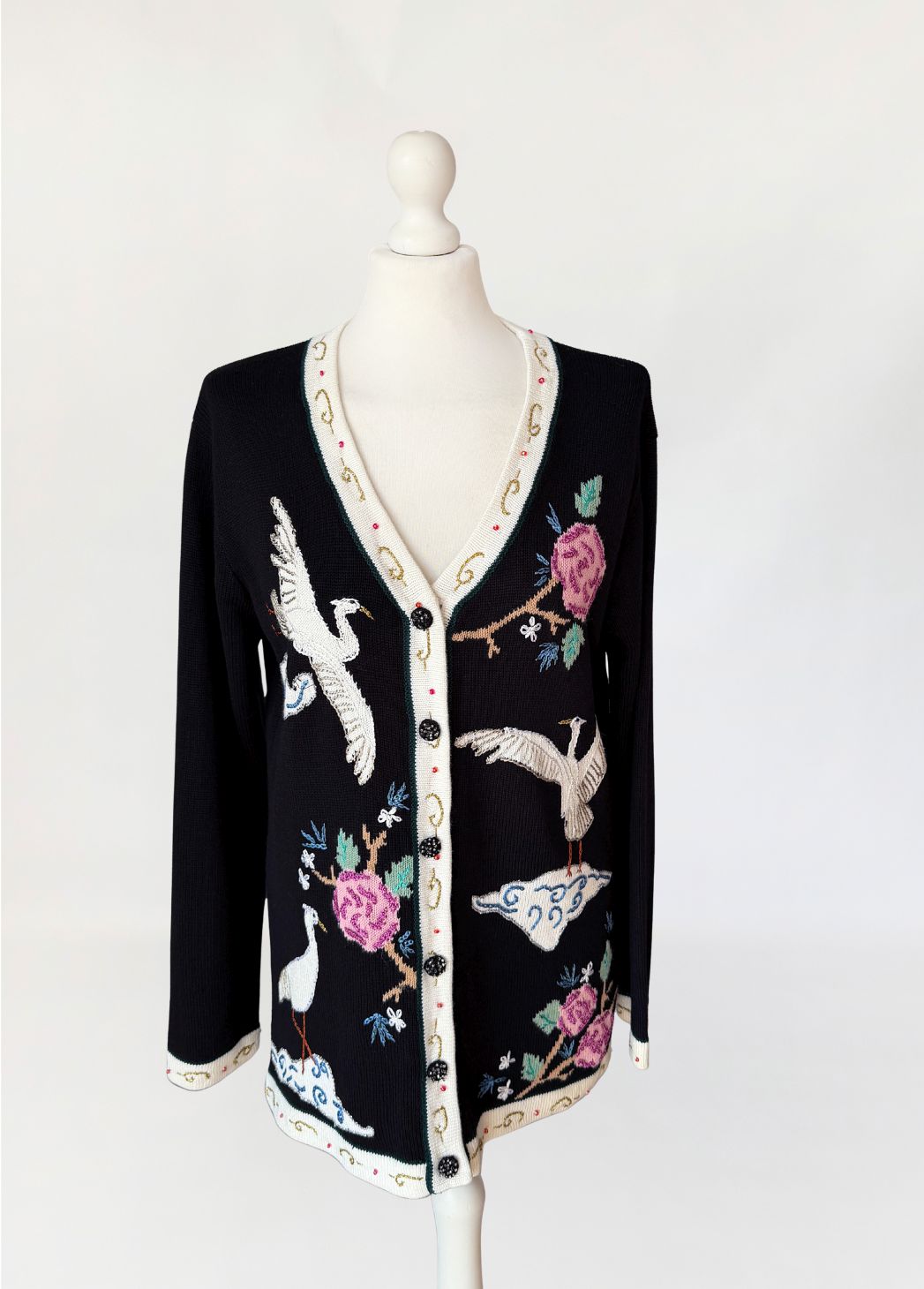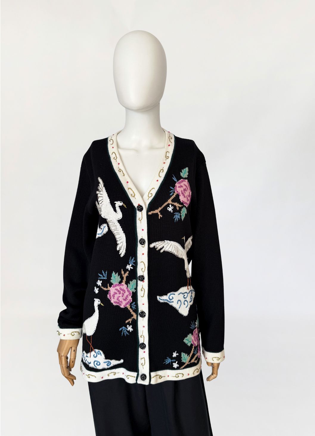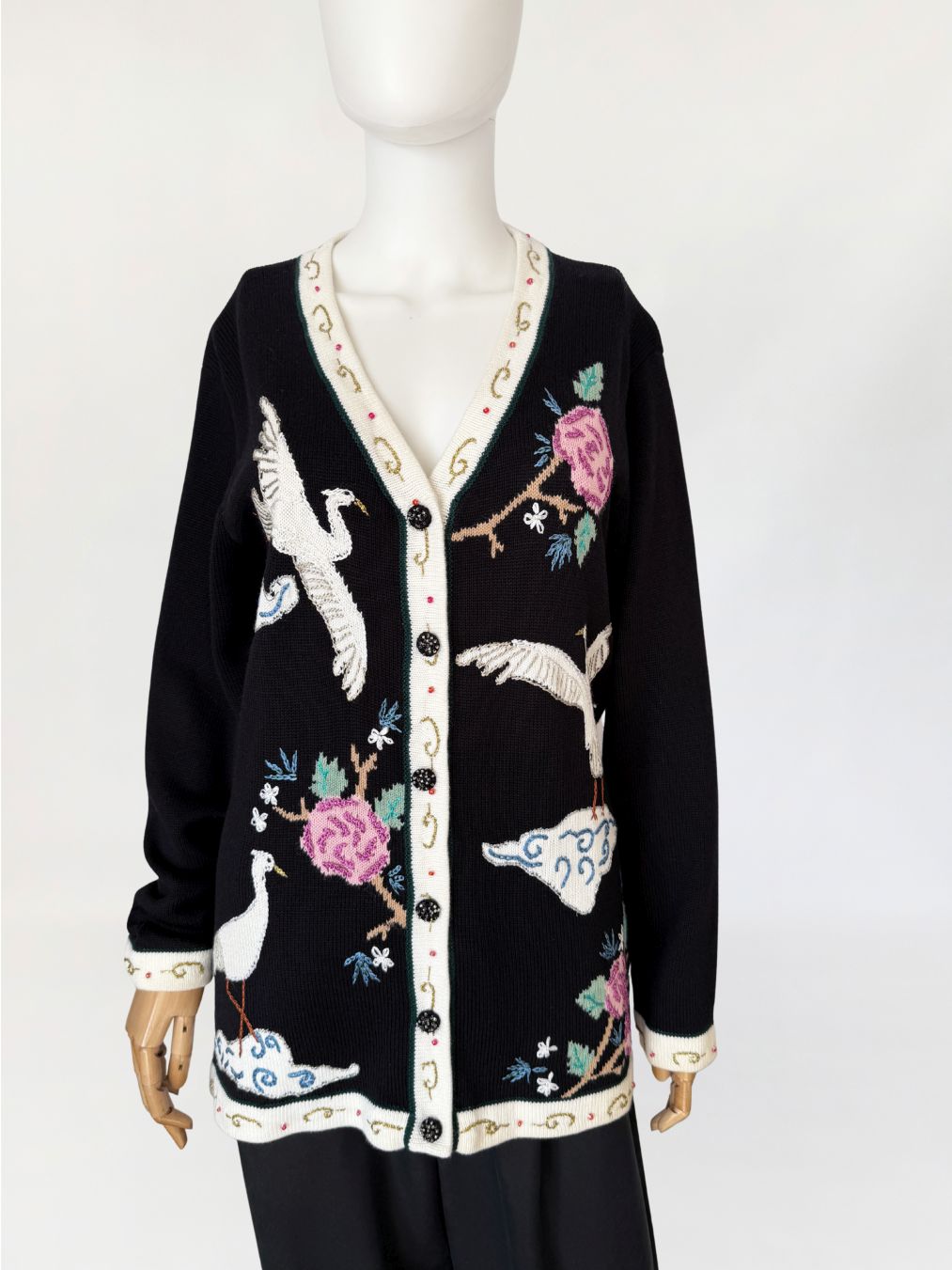Rozpinany sweter vintage z lat 90-tych marki Storybook Knits wykonany z dzianiny, mieszanki rayonu i bawełny, w kolorze czarnym. Fason prosty, o wydłużonej linii, z dekoltem w kształcie litery V. Zapięcie na dekoracyjne guziki na całej długości. Listwa zapięcia oraz wykończenie dekoltu, mankietów i dołu w kontrastowym kolorze ecru, z dodatkowymi haftowanymi detalami w formie drobnych, wielobarwnych motywów. Front z rozbudowanymi haftowanymi aplikacjami przedstawiającymi ptaki oraz elementy roślinne, rozmieszczone asymetrycznie. Haft wielokolorowy, o wyraźnej strukturze nici.