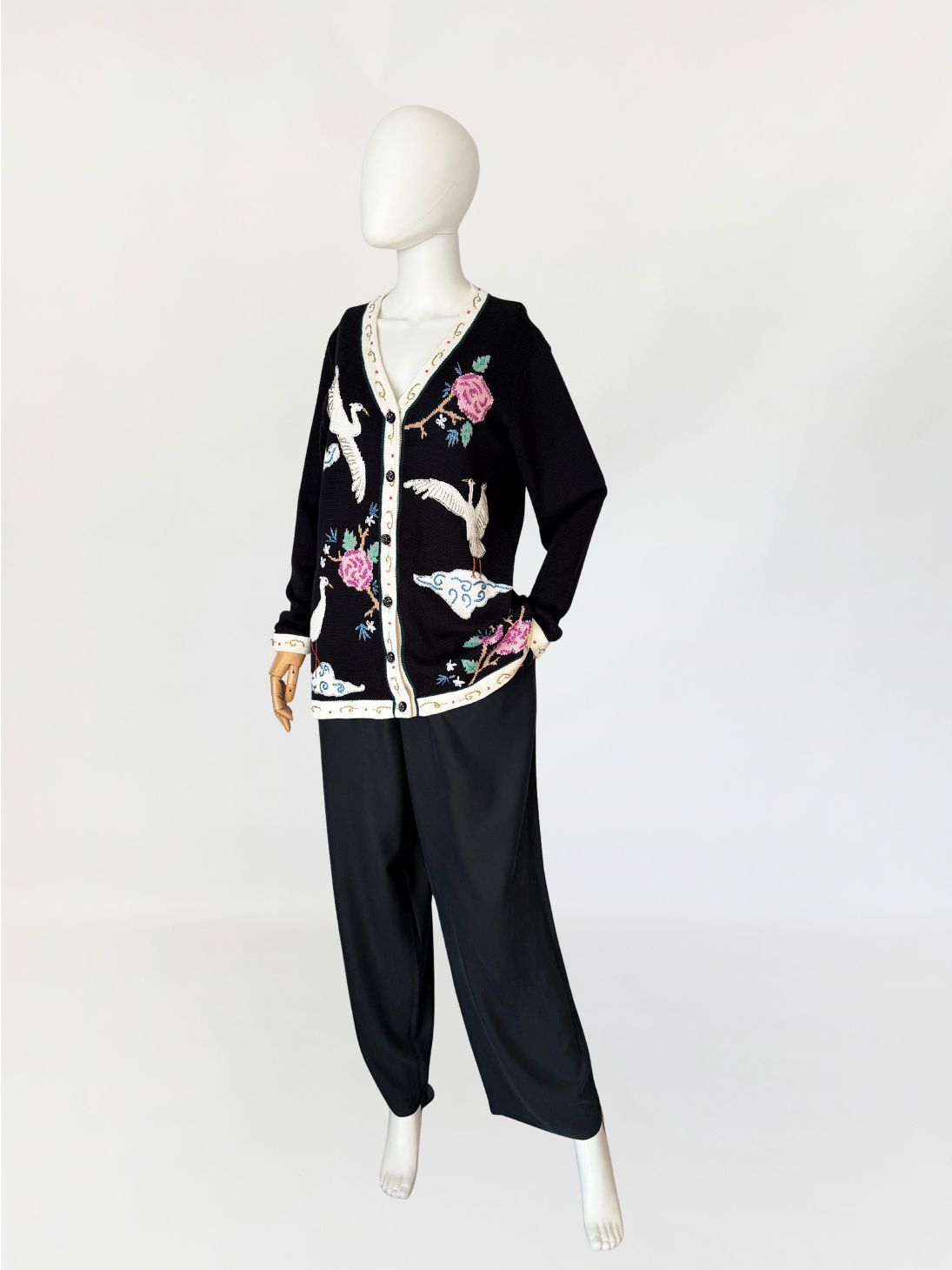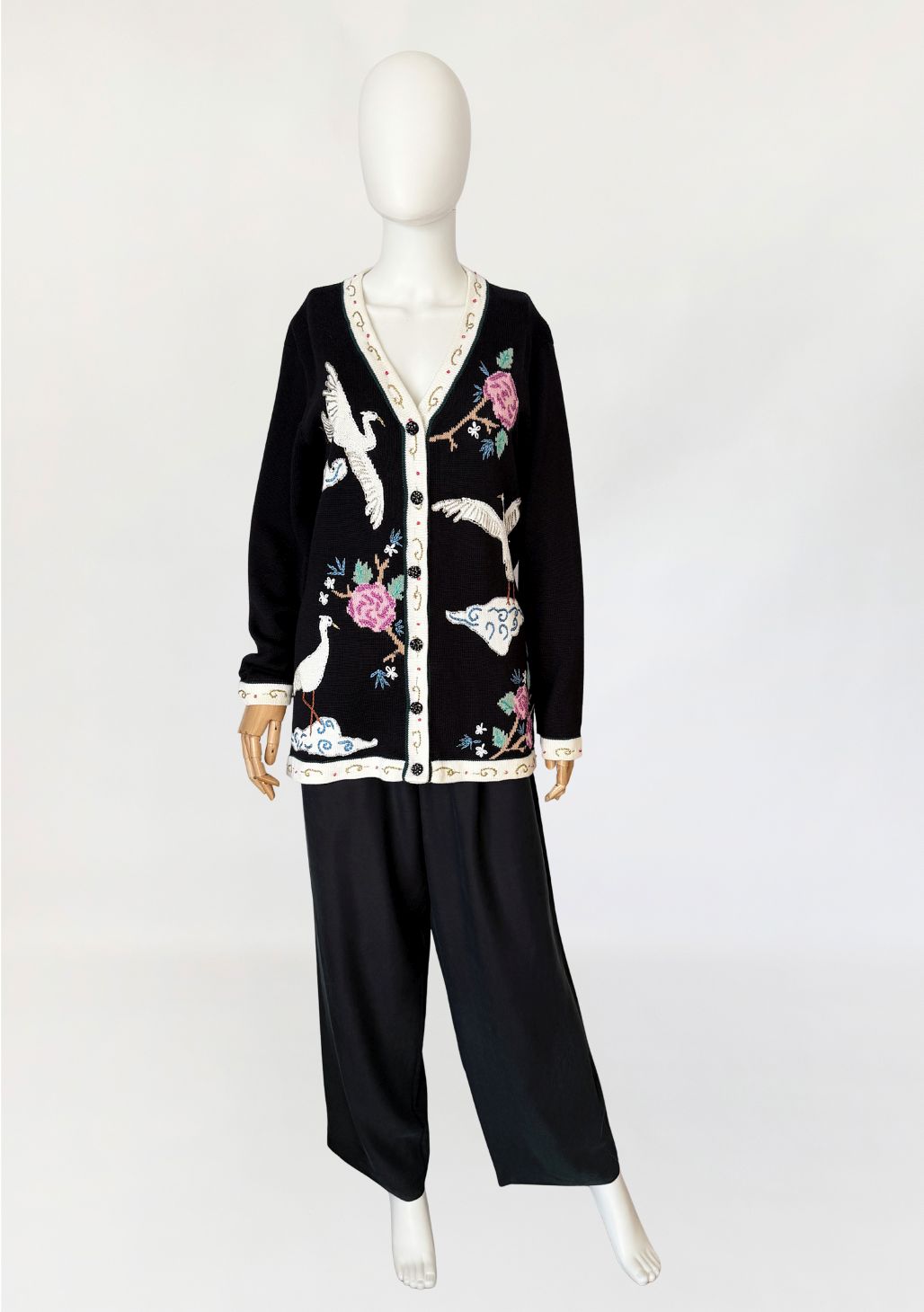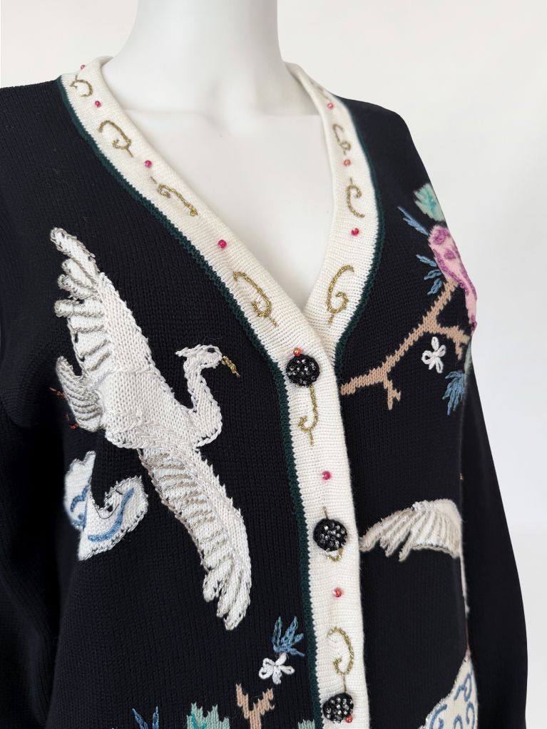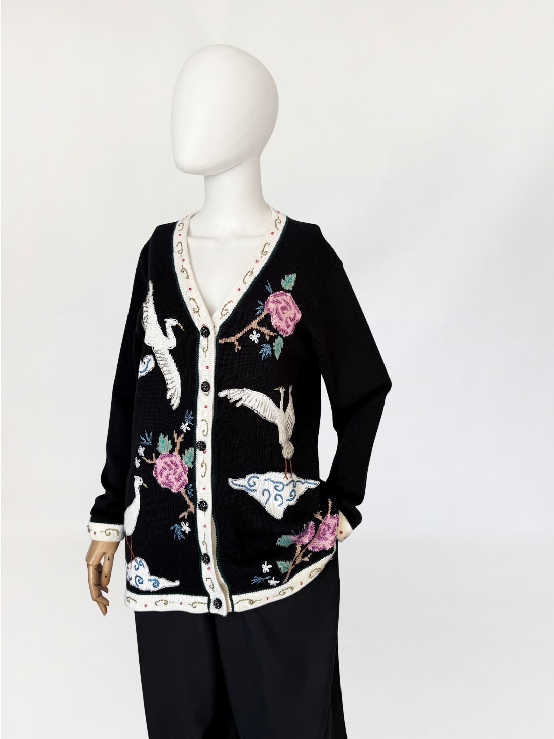 Rozpinany sweter vintage z lat 90-tych marki Storybook Knits wykonany z dzianiny, mieszanki rayonu i bawełny, w kolorze czarnym. Fason prosty, o wydłużonej linii, z dekoltem w kształcie litery V. Zapięcie na dekoracyjne guziki na całej długości. Listwa zapięcia oraz wykończenie dekoltu, mankietów i dołu w kontrastowym kolorze ecru, z dodatkowymi haftowanymi detalami w formie drobnych, wielobarwnych motywów. Front z rozbudowanymi haftowanymi aplikacjami przedstawiającymi ptaki oraz elementy roślinne, rozmieszczone asymetrycznie. Haft wielokolorowy, o wyraźnej strukturze nici.