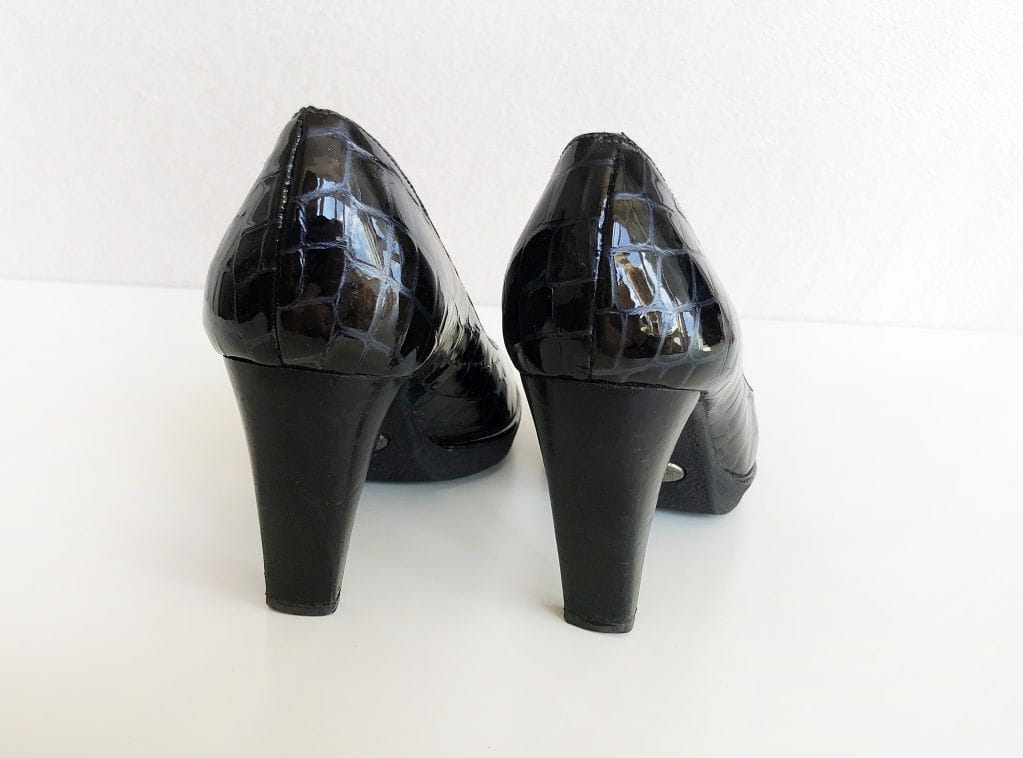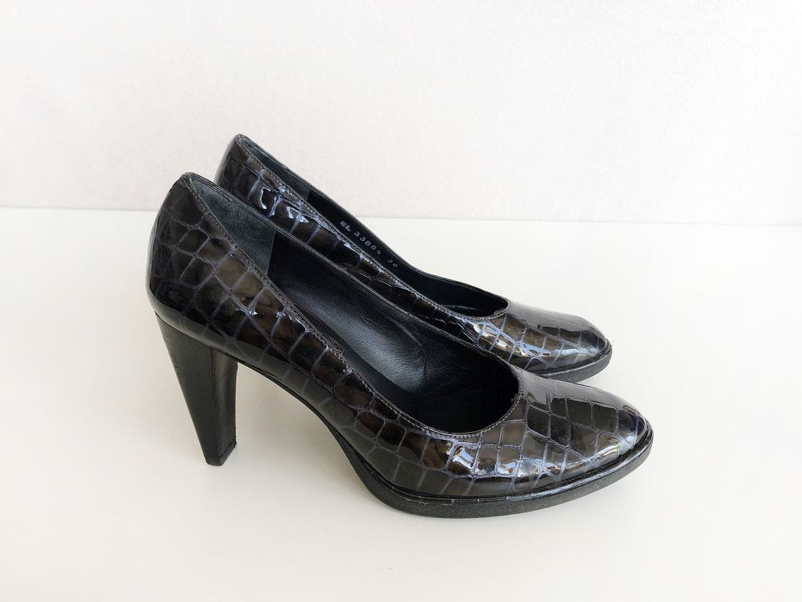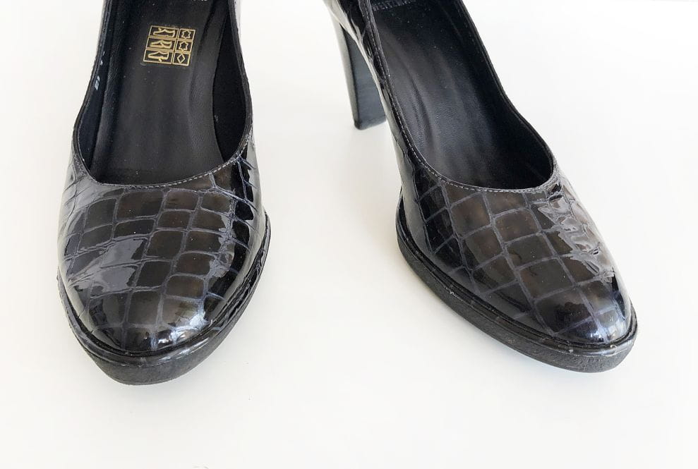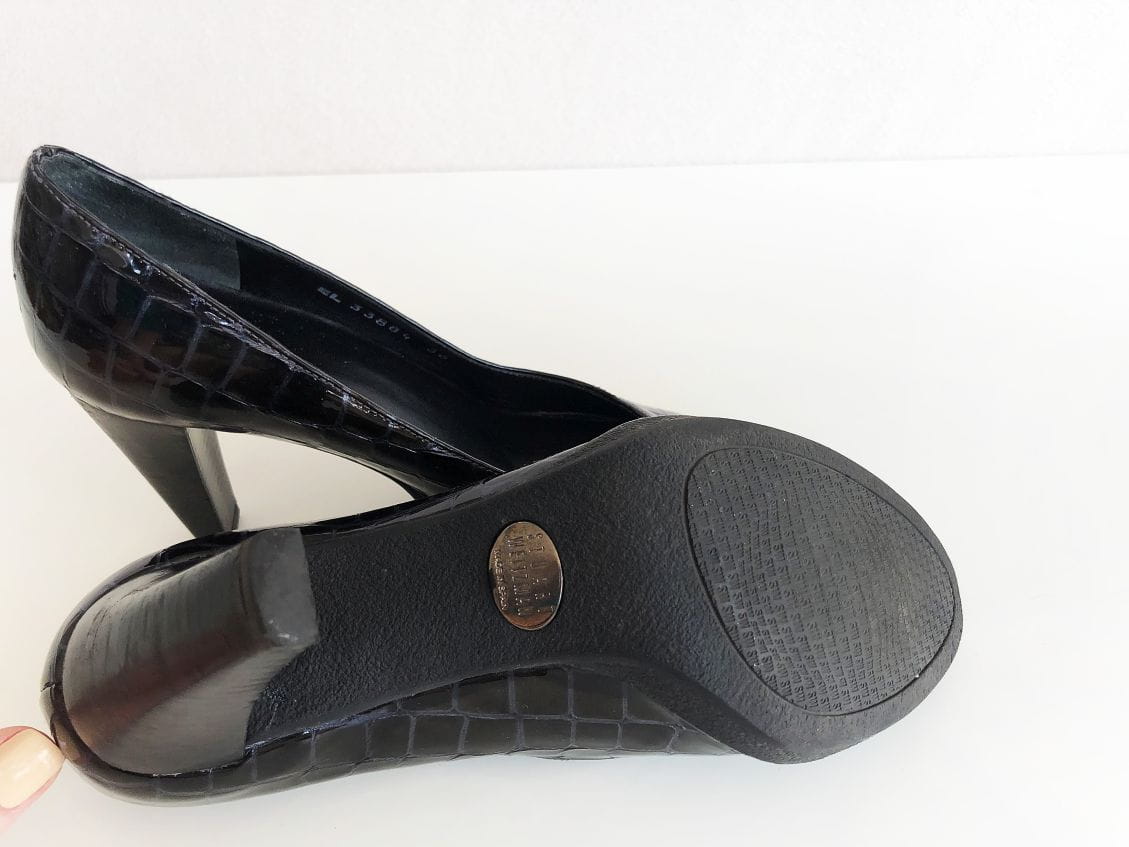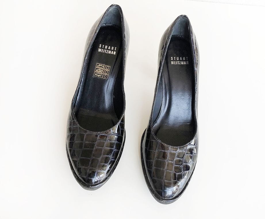 Oryginalne czółenka Stuart Weitzman, wykonane z lakierowanej skóry w delikatny wzór. Okrągłe noski, model na stabilnym obcasie.