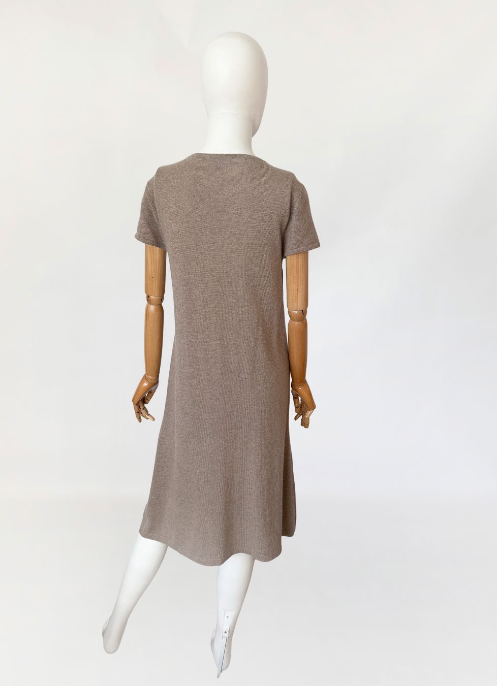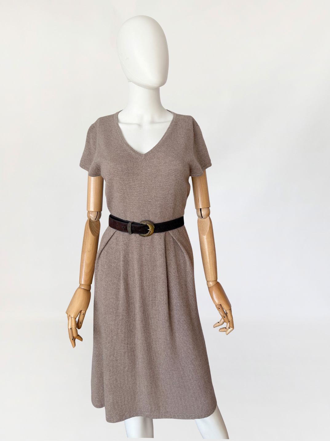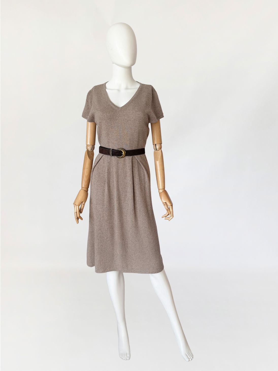 Dzianinowa sukienka vintage wykonana w 100% z kaszmiru w beżowym odcieniu. Fason dopasowany w górnej części, z krótkim rękawem i dekoltem w kształcie litery V. Linia talii zaznaczona cięciem konstrukcyjnym poniżej którego wszyte zostały zakładki modelujące. Dół o długości do kolana, lekko poszerzany. Tył gładki, bez dodatkowych przeszyć.