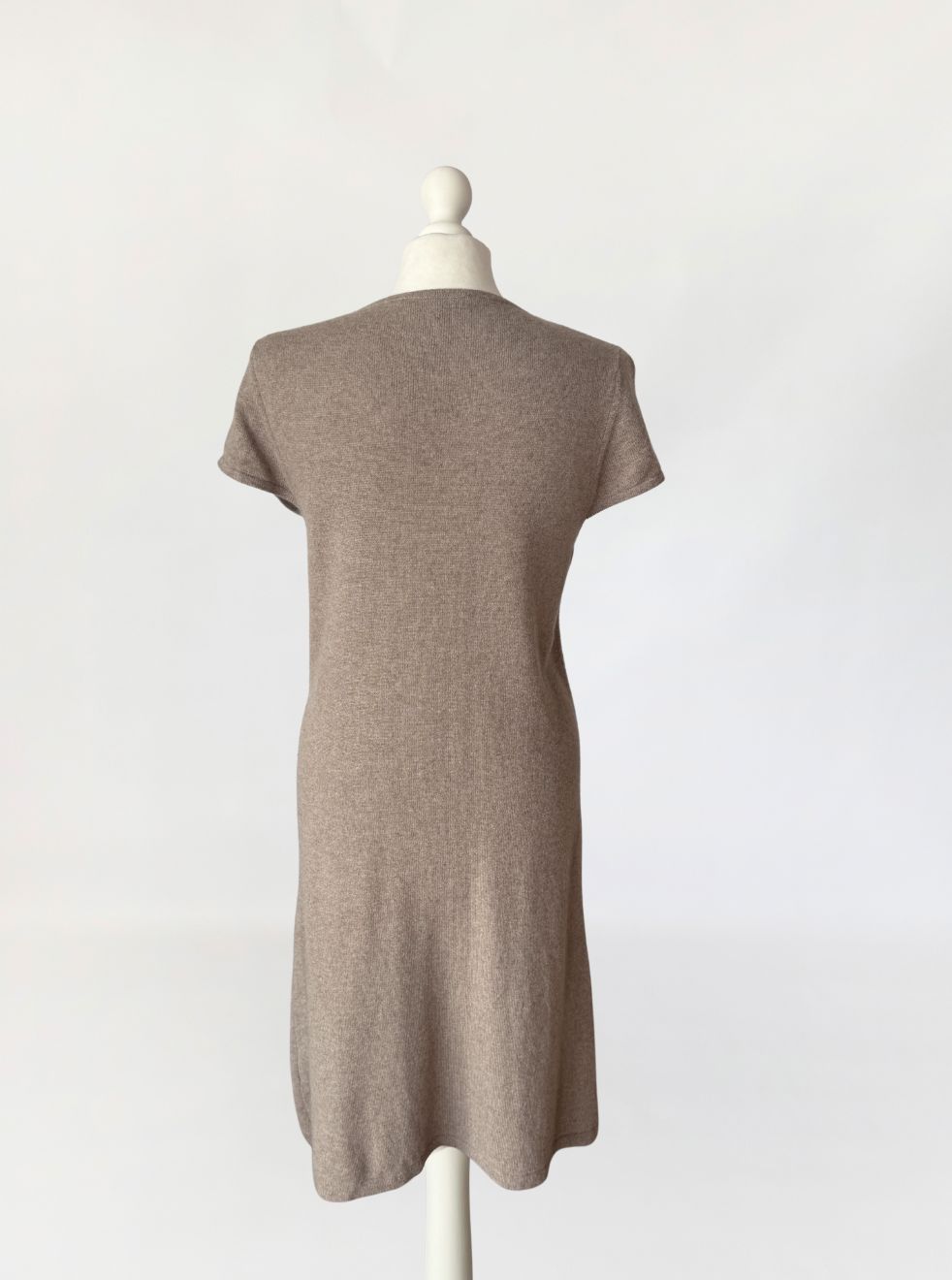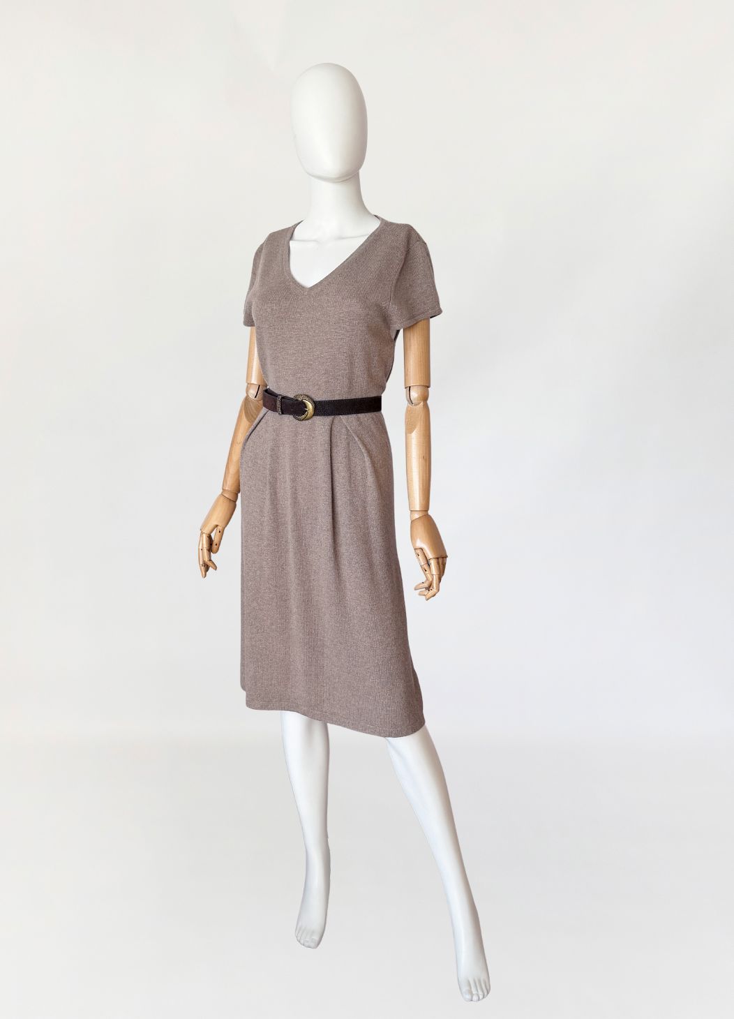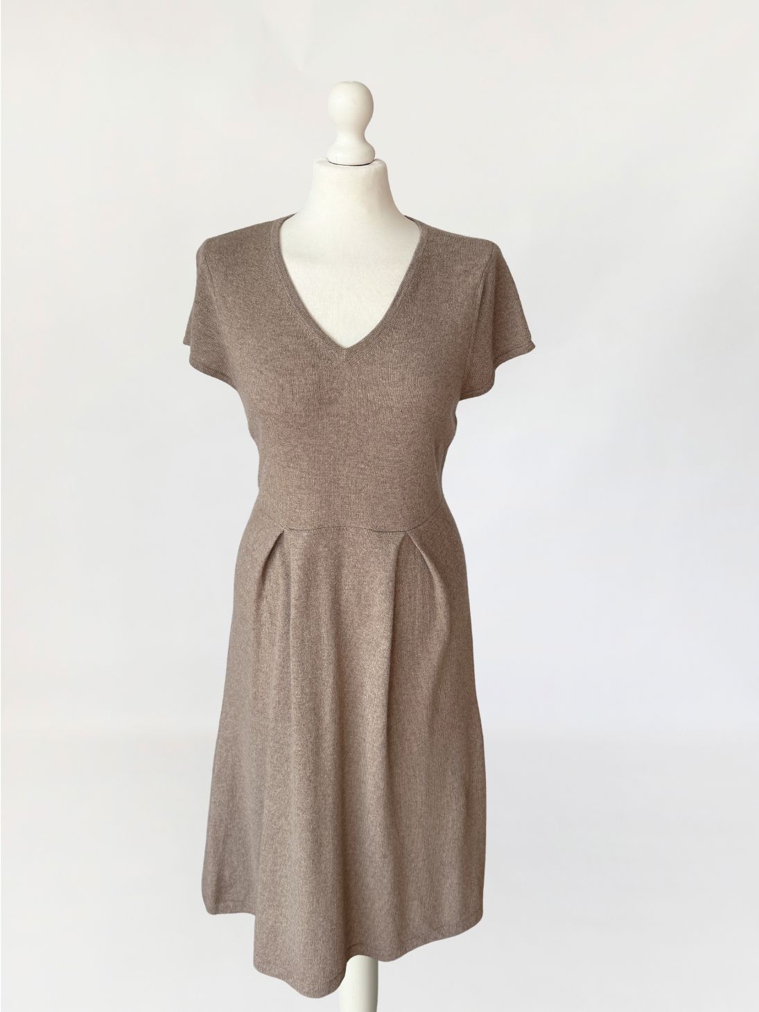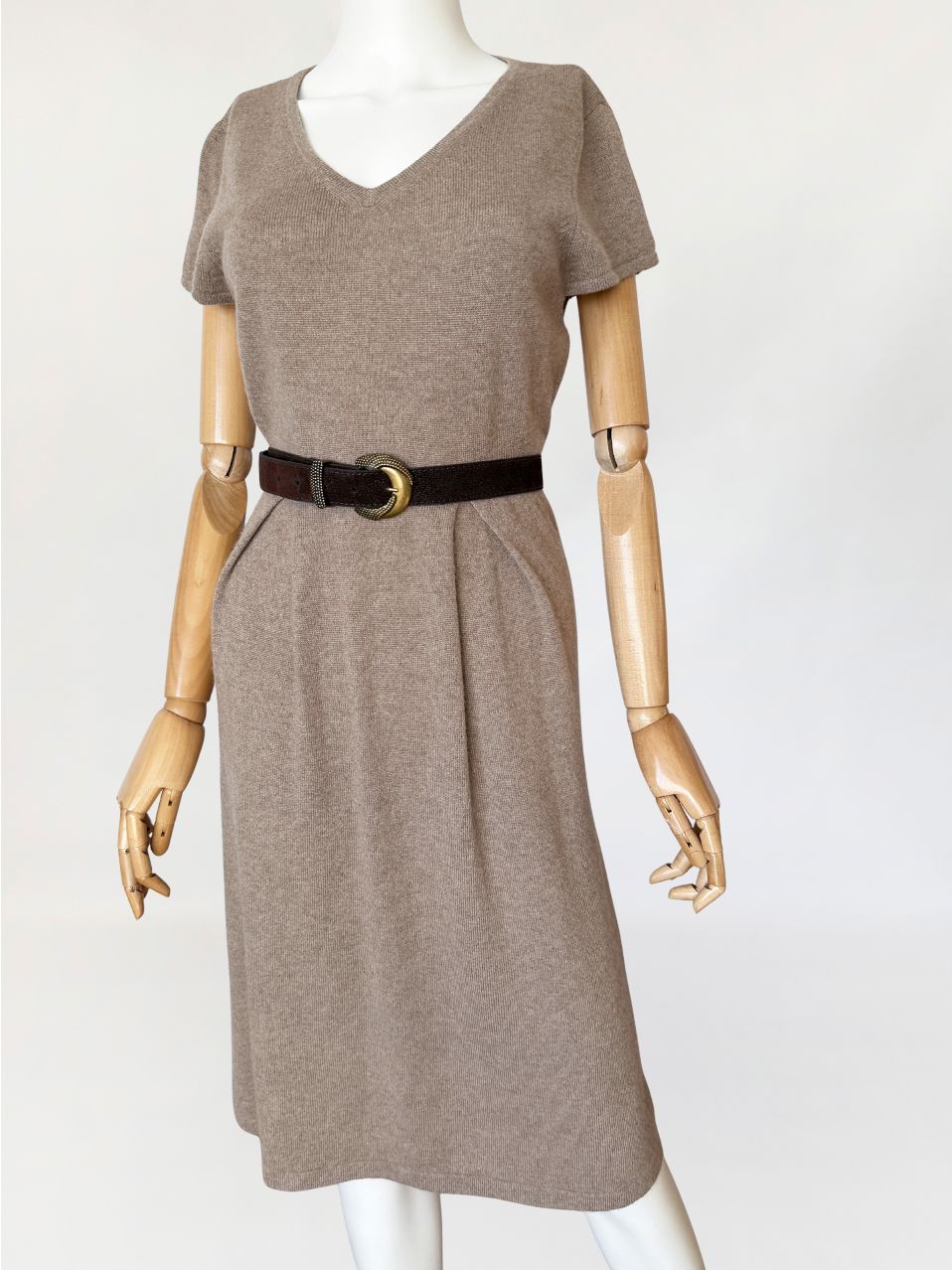 Dzianinowa sukienka vintage wykonana w 100% z kaszmiru w beżowym odcieniu. Fason dopasowany w górnej części, z krótkim rękawem i dekoltem w kształcie litery V. Linia talii zaznaczona cięciem konstrukcyjnym poniżej którego wszyte zostały zakładki modelujące. Dół o długości do kolana, lekko poszerzany. Tył gładki, bez dodatkowych przeszyć.