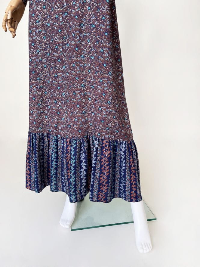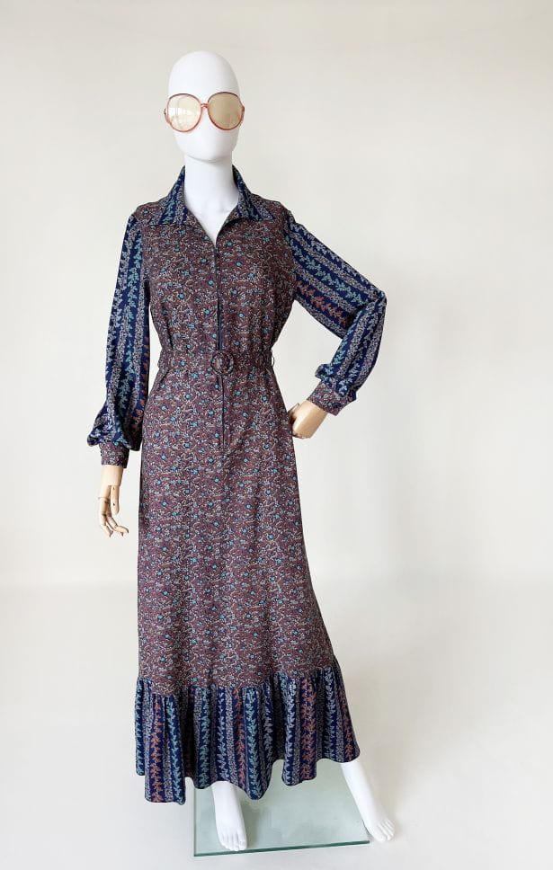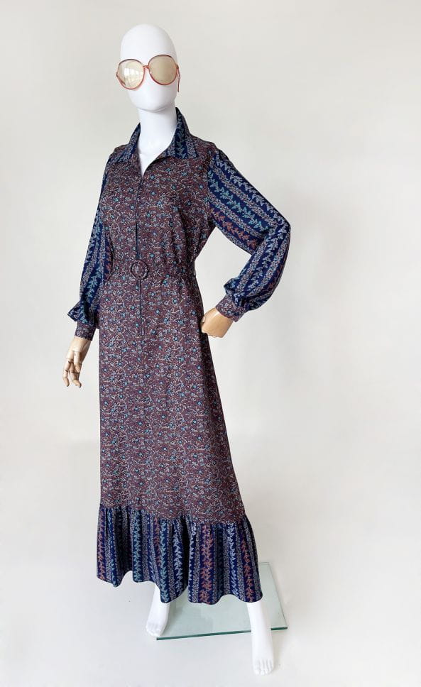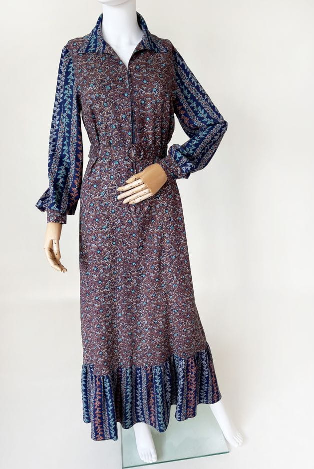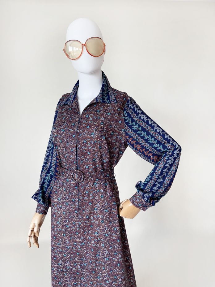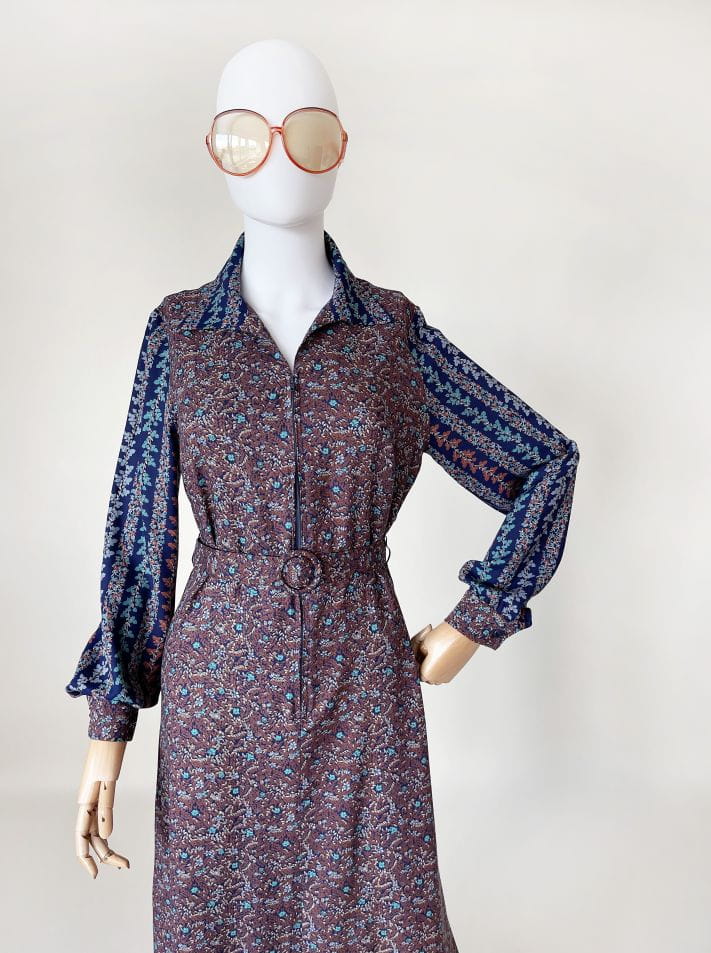 Przepiękna sukienka vintage z lat 70-tych. Model w stylu hipisowskim, wykonana z przyjemnej wiskozowej tkaniny o kwiecistym barwnym deseniu. Góra z długimi rękawami i kołnierzem. Rozsuwana od dekoltu do pasa. W talii przepinana paskiem od kompletu. Fason prosty.
