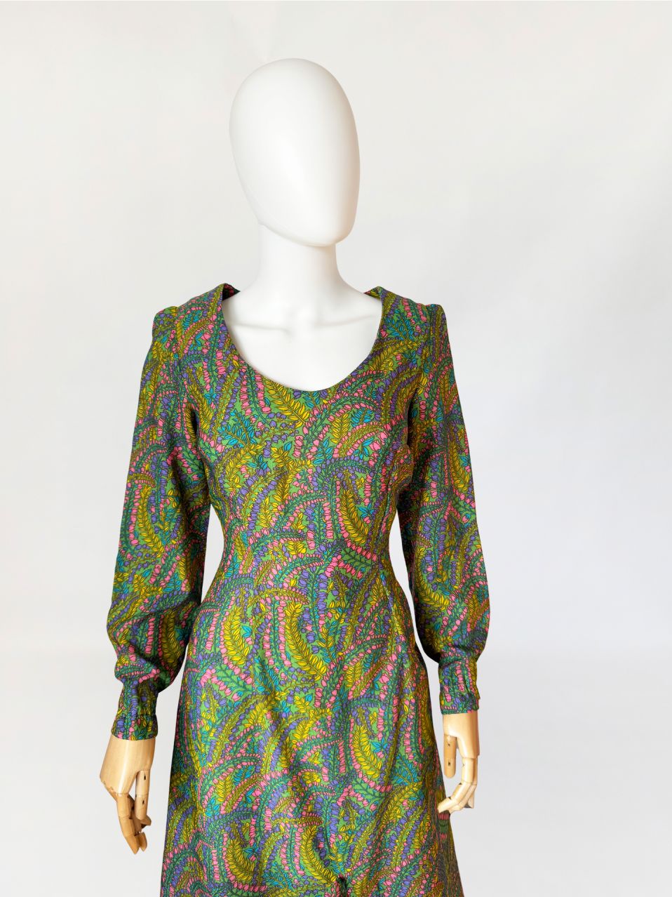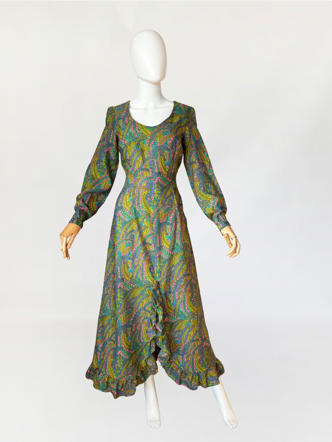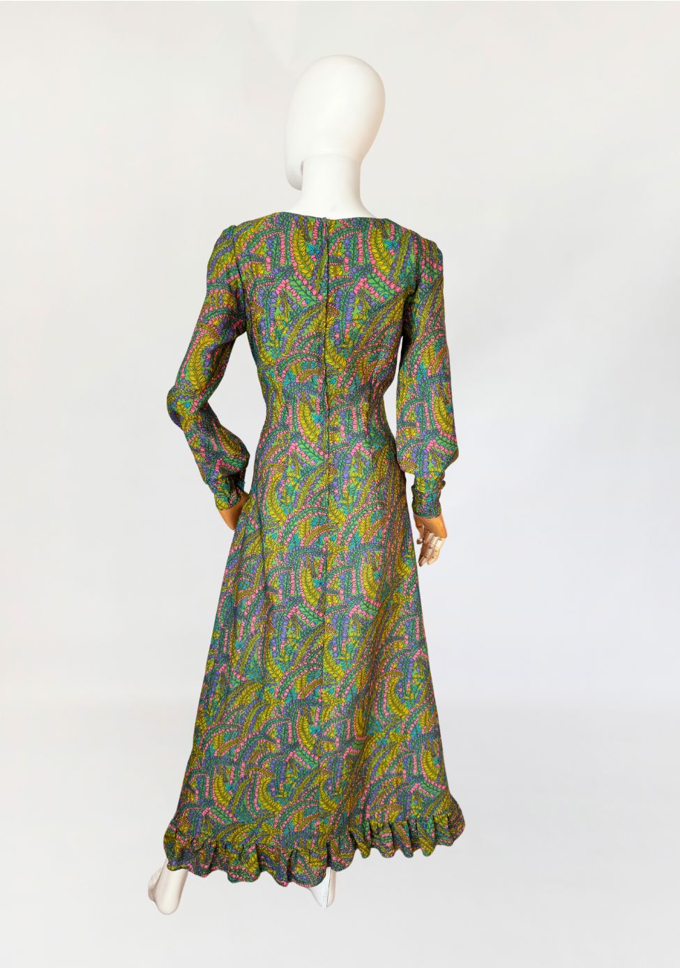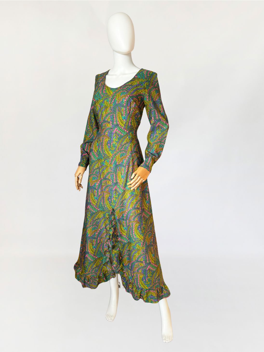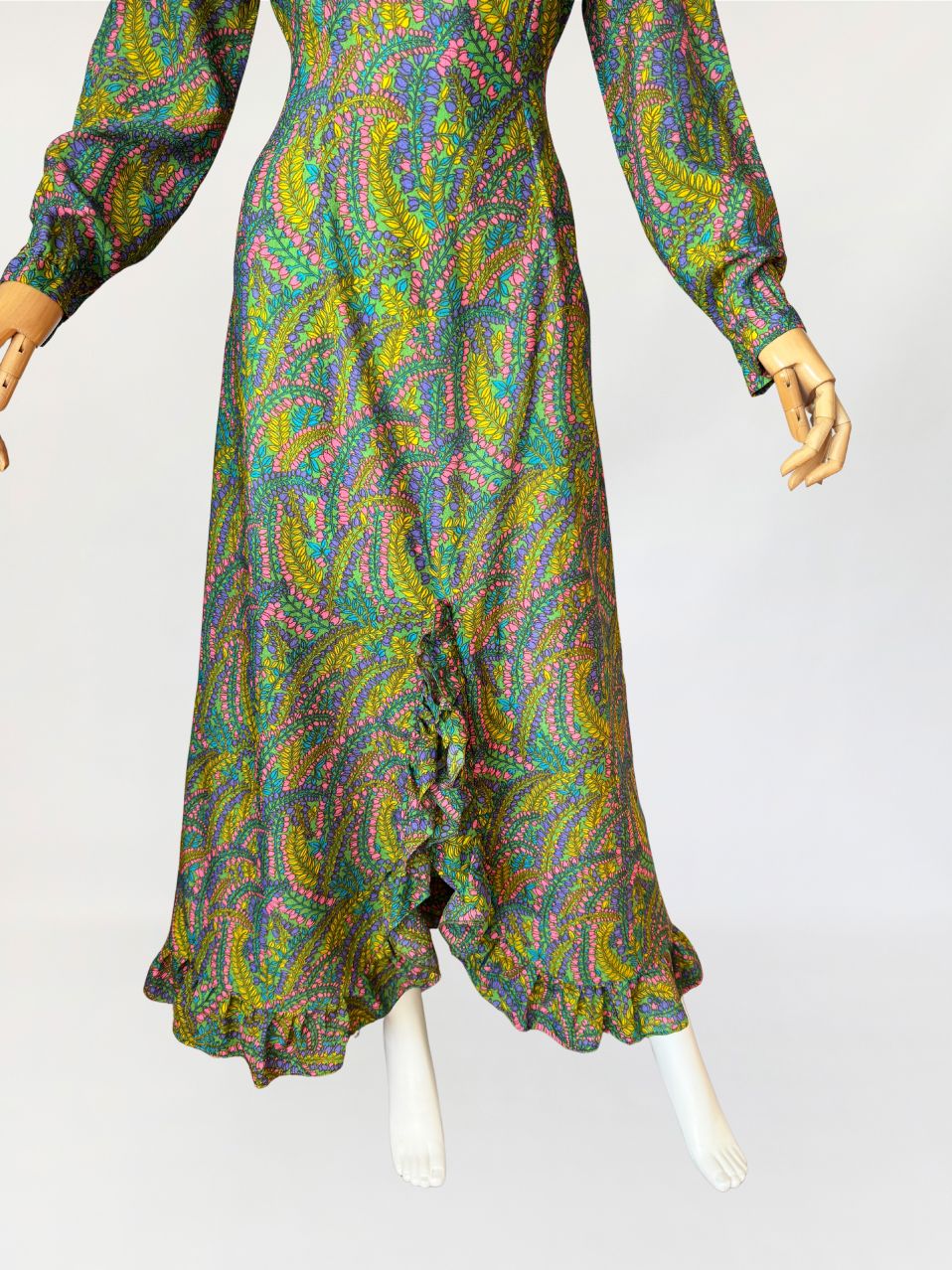 Sukienka vintage z lat 70-tych wykonana z lekkiej tkaniny syntetycznej z kwiatowym nadrukiem w odcieniach zieleni, różu, fioletu i turkusu. Model o długości maxi, fason dopasowany w talii. Góra z zaokrąglanym dekoltem i długimi rękawami, dół w linii A z rozcięciem w centralnej części i subtelną falbaną.