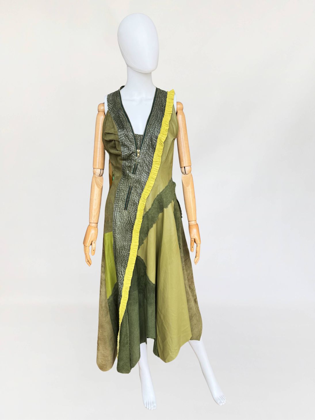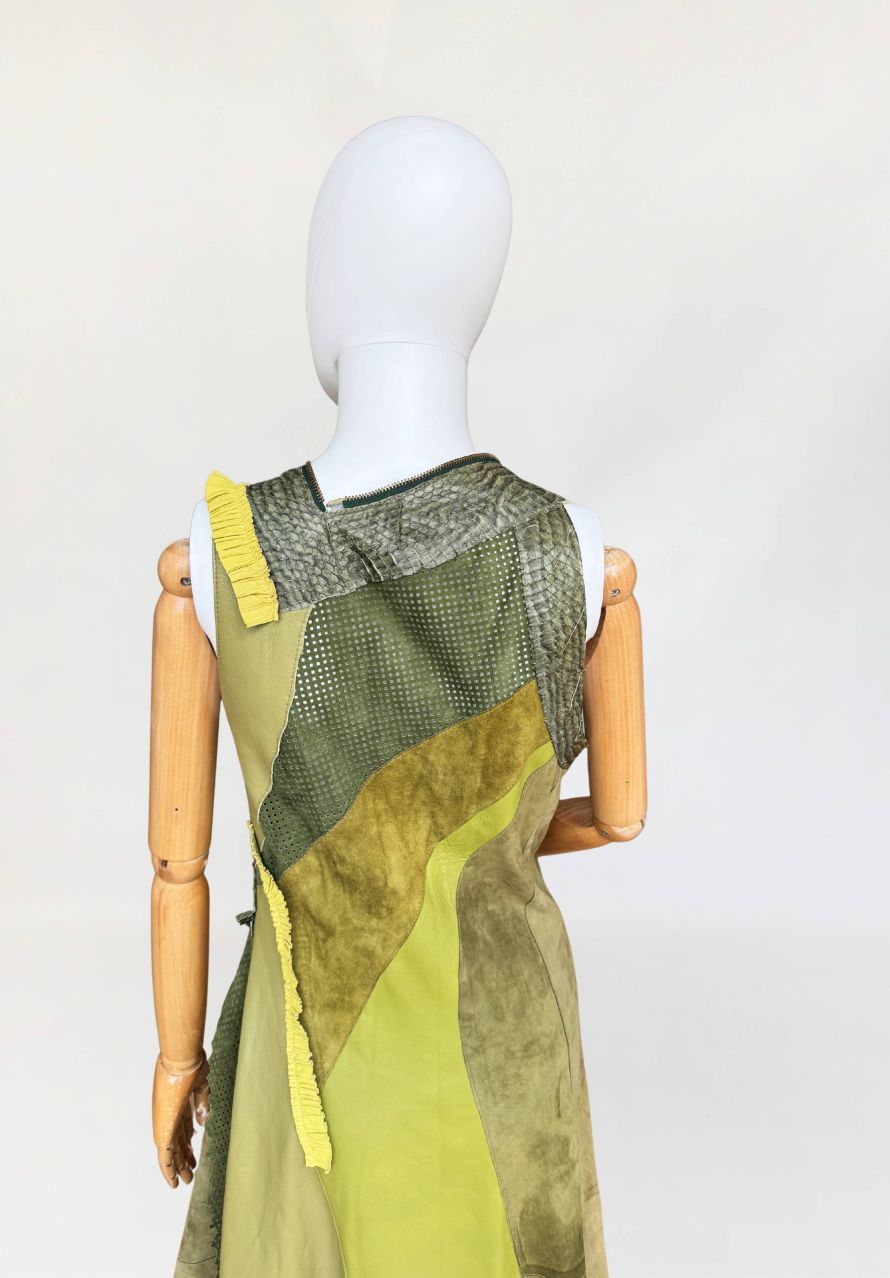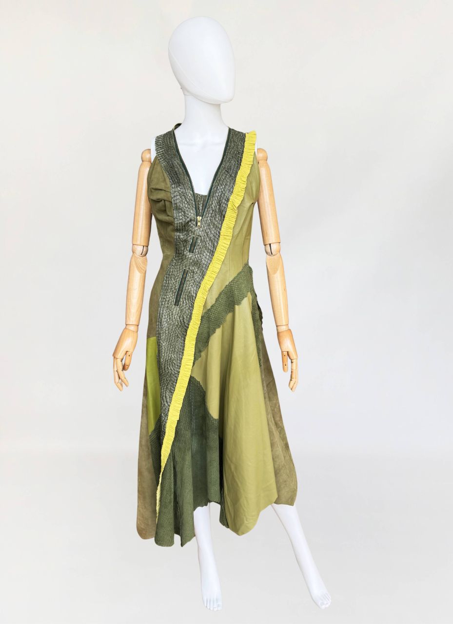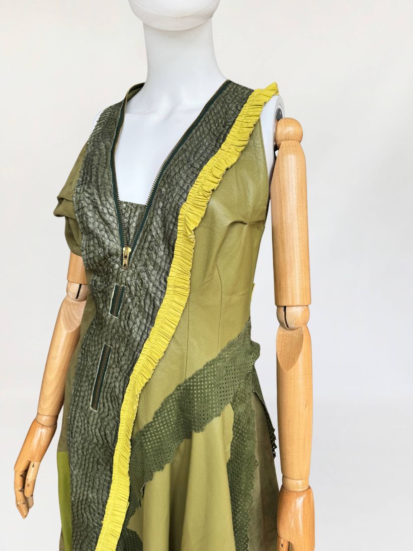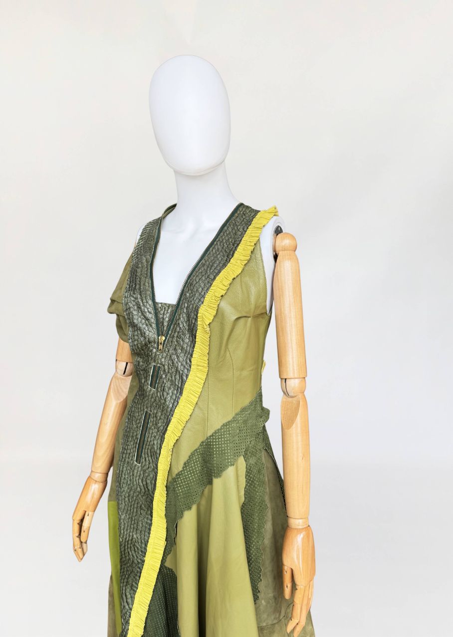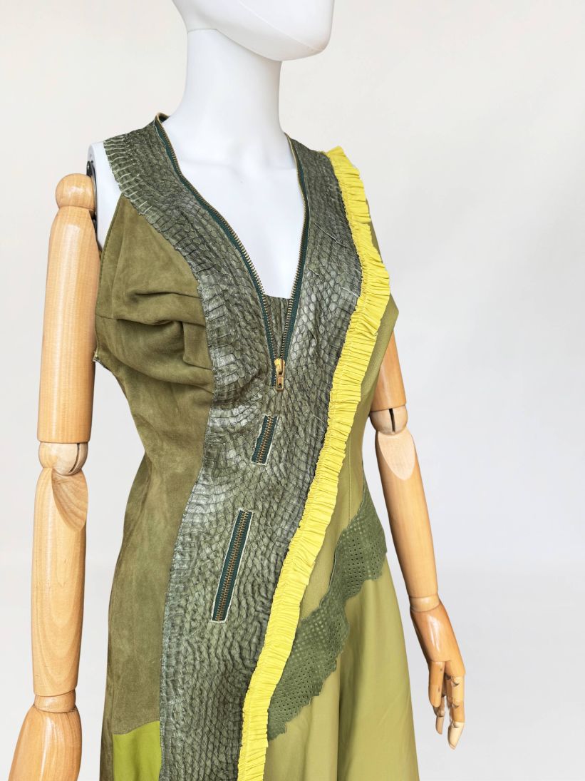 Jedyny taki egzemplarz! Wyjątkowy przykład kunsztu kuśnierstwa z lat 80-tych. Sukienka maxi o nieregularnej linii dołu, wykonana z wielowarstwowego zestawienia luksusowych skór: licowej, jagnięcej, zamszu oraz skóry pytona. Kompozycja utrzymana w wielotonowej palecie zieleni: od zgniłej zieleni precyzyjnie perforowanego zamszu, przez świeżą barwę młodej trawy na skórze jagnięcej, po intensywną limonkę wzdłuż drapowanej lamówki. Front wzbogacony o dekoracyjne zamki o złotym wykończeniu, prowadzone pionowo i skośnie, akcentujące konstrukcję. Góra dopasowana, na szerokich ramiączkach, z krytym zapięciem. Linia sukienki stopniowo rozszerza się ku dołowi. Wykonana z najwyższej jakości luksusowych skór, w tym skóry egzotycznej. Egzemplarz vintage o rzadko spotykanej złożoności wykonania, powstały w czasach, gdy proces szycia i doboru materiałów podlegał najwyższym rzemieślniczym standardom, dziś praktycznie nieosiągalnym. Zastosowane surowce należą do najbardziej cenionych w branży: od szlachetnej skóry jagnięcej o wyjątkowej miękkości, przez perfekcyjnie wyselekcjonowany zamsz, po rzadką i luksusową skórę pytona, której koszt i dostępność czynią ją materiałem zarezerwowanym dla najbardziej ekskluzywnych realizacji.