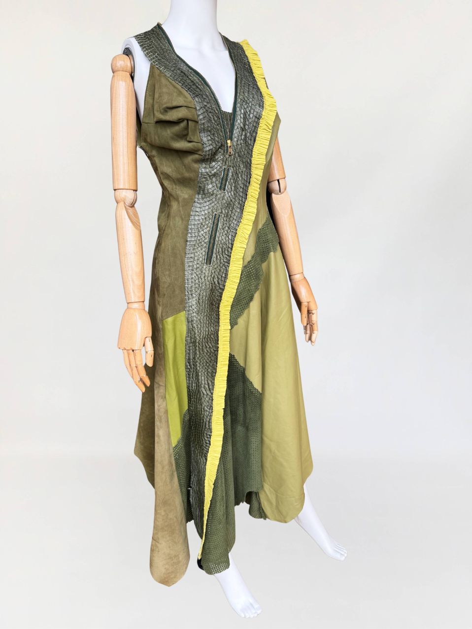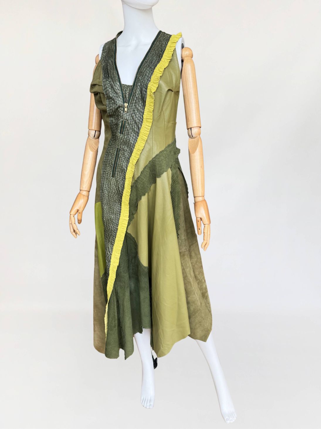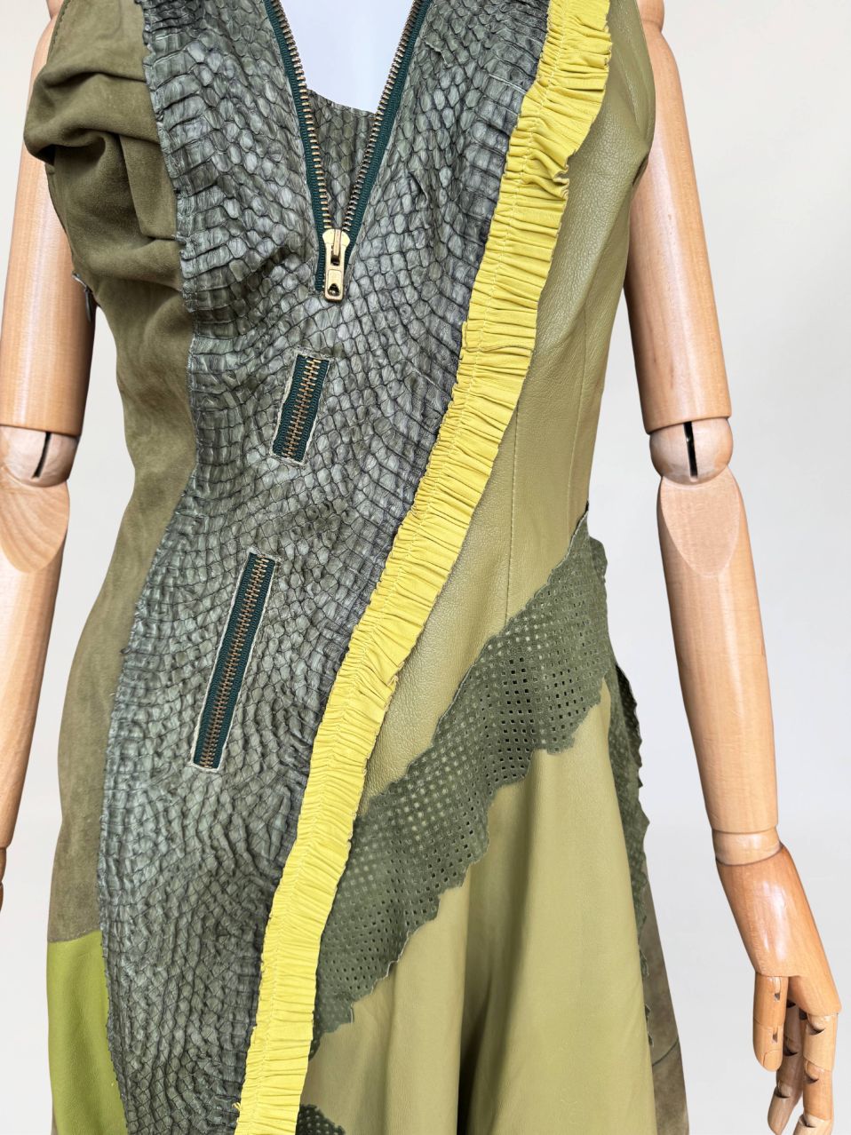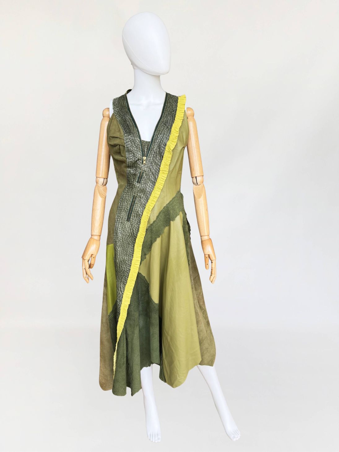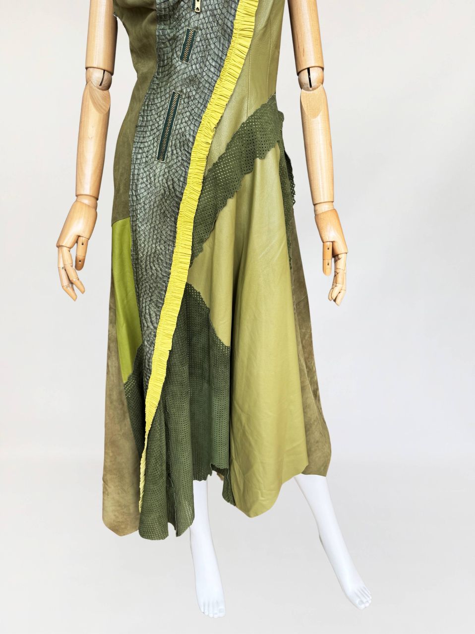 Jedyny taki egzemplarz! Wyjątkowy przykład kunsztu kuśnierstwa z lat 80-tych. Sukienka maxi o nieregularnej linii dołu, wykonana z wielowarstwowego zestawienia luksusowych skór: licowej, jagnięcej, zamszu oraz skóry pytona. Kompozycja utrzymana w wielotonowej palecie zieleni: od zgniłej zieleni precyzyjnie perforowanego zamszu, przez świeżą barwę młodej trawy na skórze jagnięcej, po intensywną limonkę wzdłuż drapowanej lamówki. Front wzbogacony o dekoracyjne zamki o złotym wykończeniu, prowadzone pionowo i skośnie, akcentujące konstrukcję. Góra dopasowana, na szerokich ramiączkach, z krytym zapięciem. Linia sukienki stopniowo rozszerza się ku dołowi. Wykonana z najwyższej jakości luksusowych skór, w tym skóry egzotycznej. Egzemplarz vintage o rzadko spotykanej złożoności wykonania, powstały w czasach, gdy proces szycia i doboru materiałów podlegał najwyższym rzemieślniczym standardom, dziś praktycznie nieosiągalnym. Zastosowane surowce należą do najbardziej cenionych w branży: od szlachetnej skóry jagnięcej o wyjątkowej miękkości, przez perfekcyjnie wyselekcjonowany zamsz, po rzadką i luksusową skórę pytona, której koszt i dostępność czynią ją materiałem zarezerwowanym dla najbardziej ekskluzywnych realizacji.