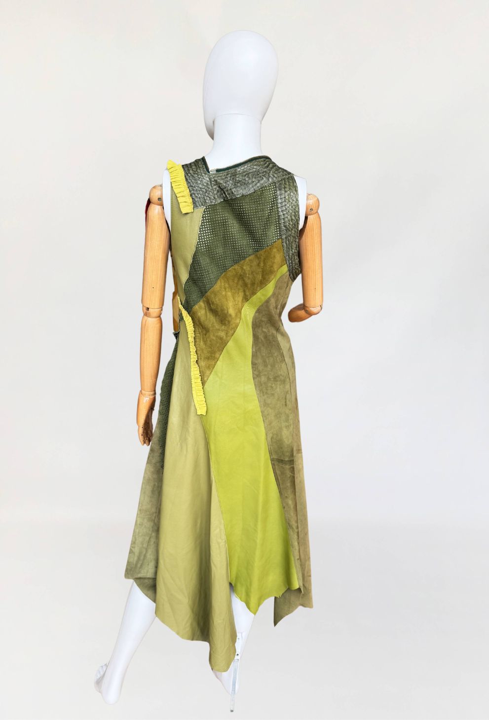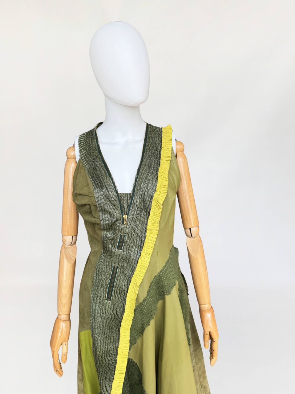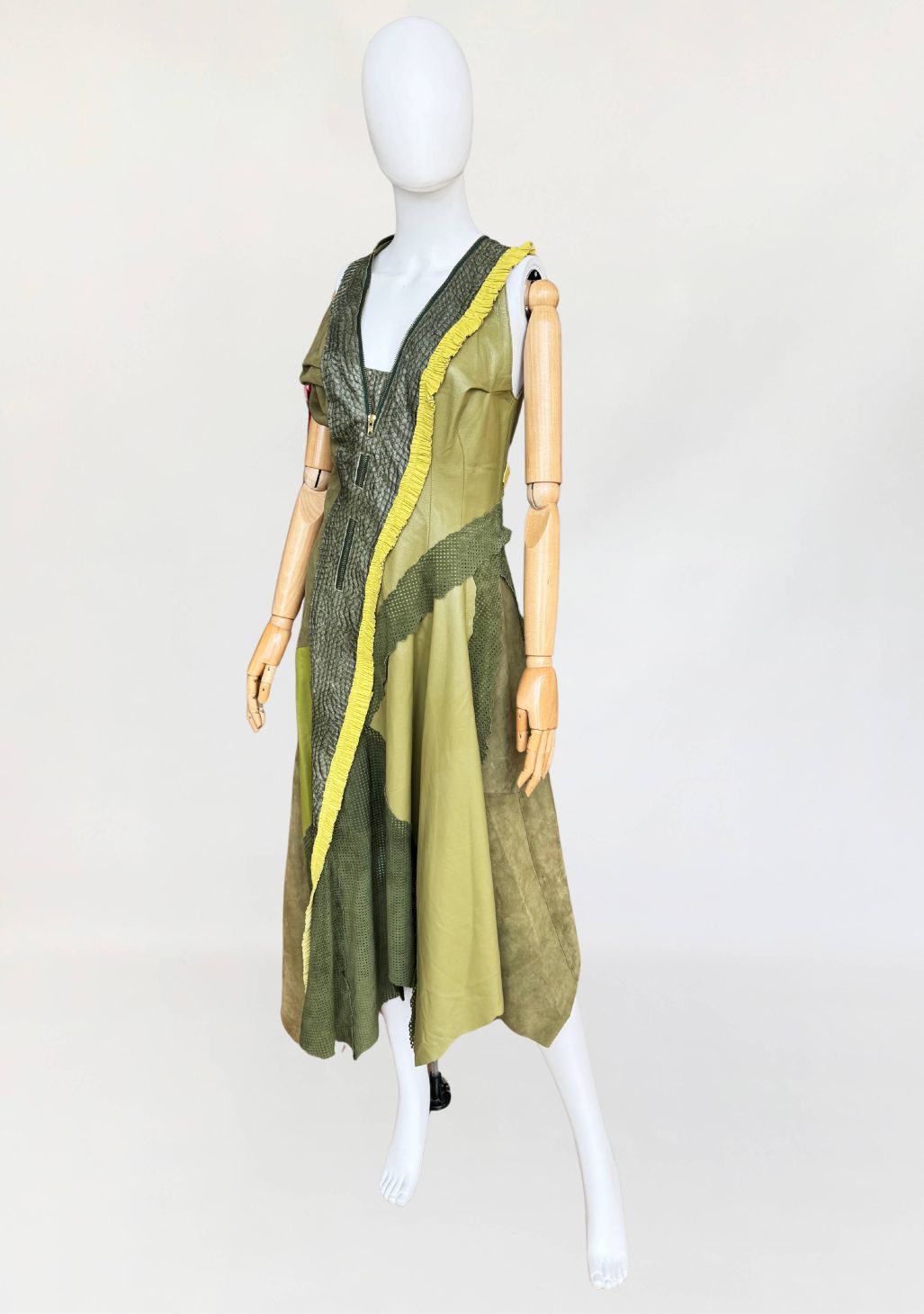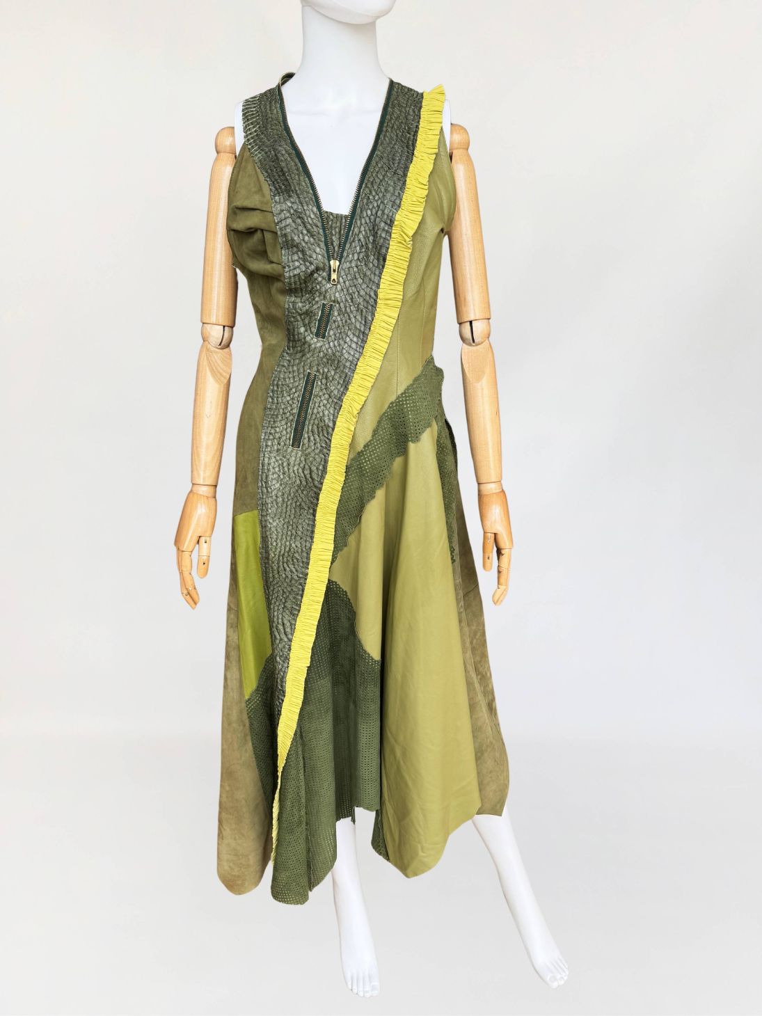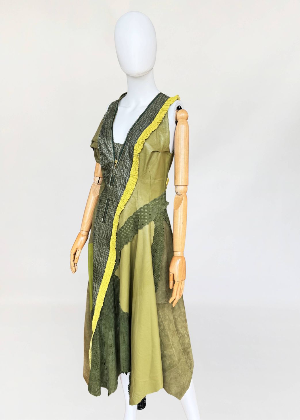 Jedyny taki egzemplarz! Wyjątkowy przykład kunsztu kuśnierstwa z lat 80-tych. Sukienka maxi o nieregularnej linii dołu, wykonana z wielowarstwowego zestawienia luksusowych skór: licowej, jagnięcej, zamszu oraz skóry pytona. Kompozycja utrzymana w wielotonowej palecie zieleni: od zgniłej zieleni precyzyjnie perforowanego zamszu, przez świeżą barwę młodej trawy na skórze jagnięcej, po intensywną limonkę wzdłuż drapowanej lamówki. Front wzbogacony o dekoracyjne zamki o złotym wykończeniu, prowadzone pionowo i skośnie, akcentujące konstrukcję. Góra dopasowana, na szerokich ramiączkach, z krytym zapięciem. Linia sukienki stopniowo rozszerza się ku dołowi. Wykonana z najwyższej jakości luksusowych skór, w tym skóry egzotycznej. Egzemplarz vintage o rzadko spotykanej złożoności wykonania, powstały w czasach, gdy proces szycia i doboru materiałów podlegał najwyższym rzemieślniczym standardom, dziś praktycznie nieosiągalnym. Zastosowane surowce należą do najbardziej cenionych w branży: od szlachetnej skóry jagnięcej o wyjątkowej miękkości, przez perfekcyjnie wyselekcjonowany zamsz, po rzadką i luksusową skórę pytona, której koszt i dostępność czynią ją materiałem zarezerwowanym dla najbardziej ekskluzywnych realizacji.