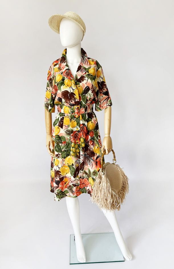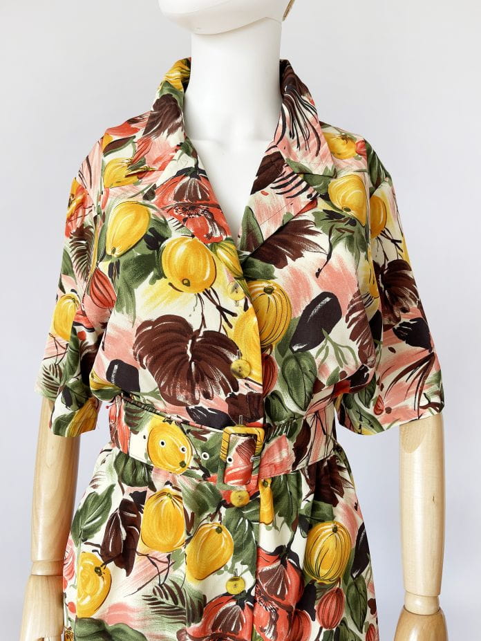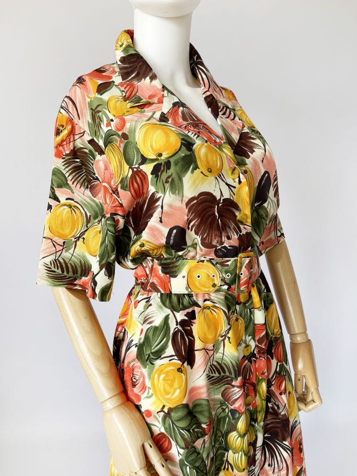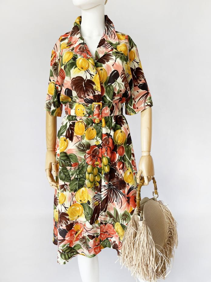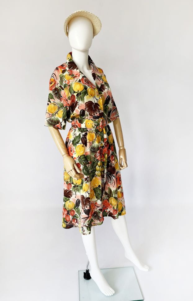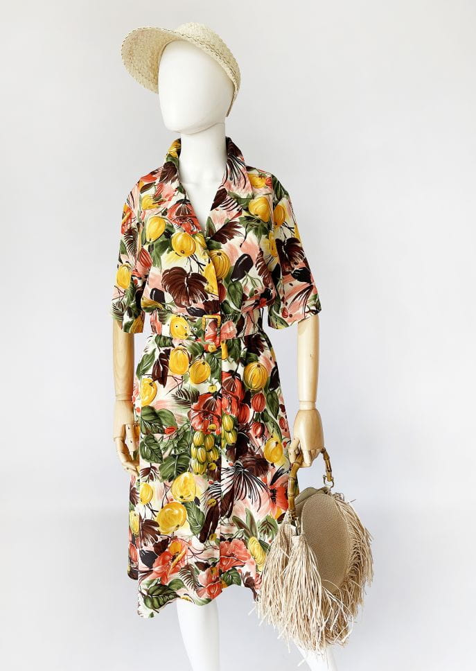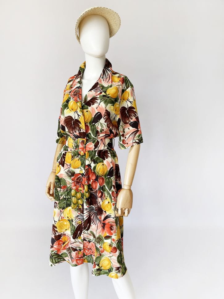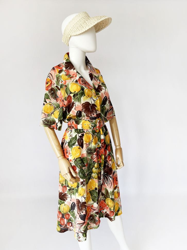 Przepiękna rozpinana sukienka vintage. Wykonana z lekkiej tkaniny w barwne owocowo-kwiatowe wzory. Można się rozmarzyć i - jak to w modzie bywa, szukać inspiracji w sztuce, może u mistrzyni Moillon? lub po prostu zarzucić ją na siebie w letnie południe i rozkoszować się nie tylko jej artystycznym printem, ale i tkaniną z jakiej została uszyta. Triacetat jest przewiewny i delikatny jak jedwab, a przy tym dużo bardziej wytrzymały. Rewelacyjnie się prasuje i jest odporny na zagniecenia. Cechy pożądane, szczególnie jeśli akurat pakujemy urlopową walizkę. Sukienka ma rozpinany fason o długości midi. U góry kołnierzyk i krótkie, szersze rękawy. W pasie przepinana regulowanym paskiem, obleczonym tkaniną bazową.