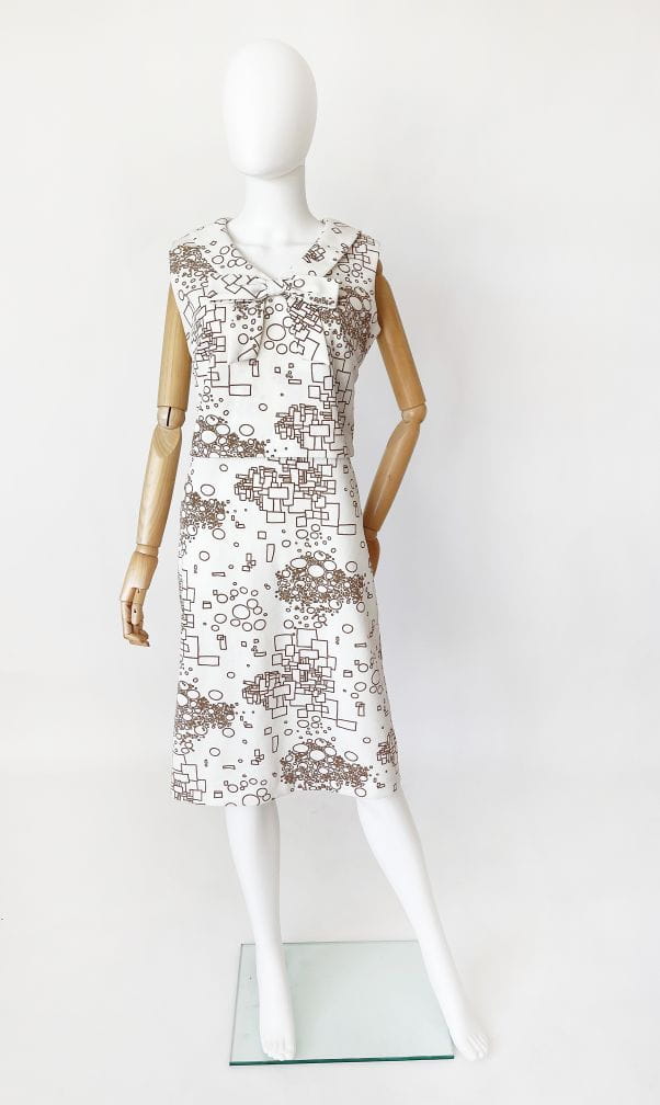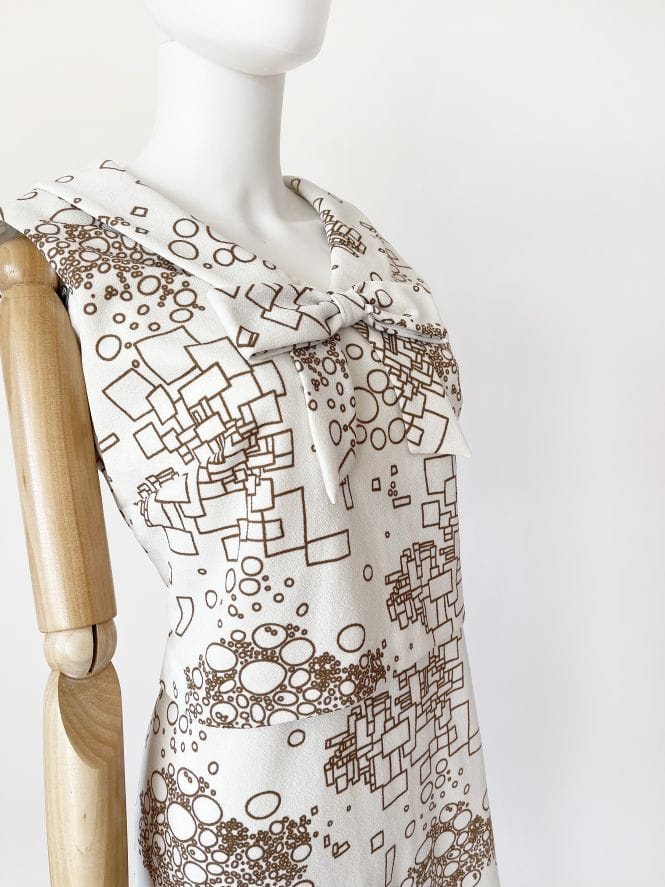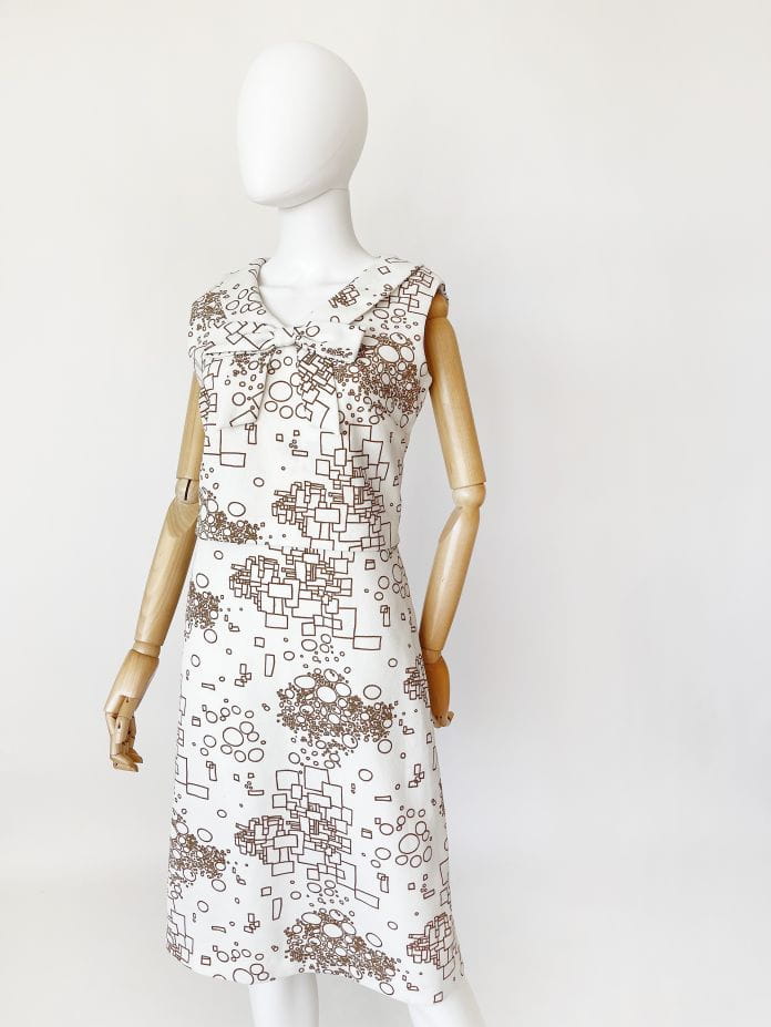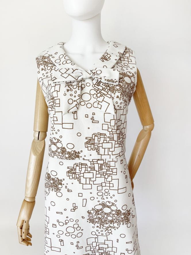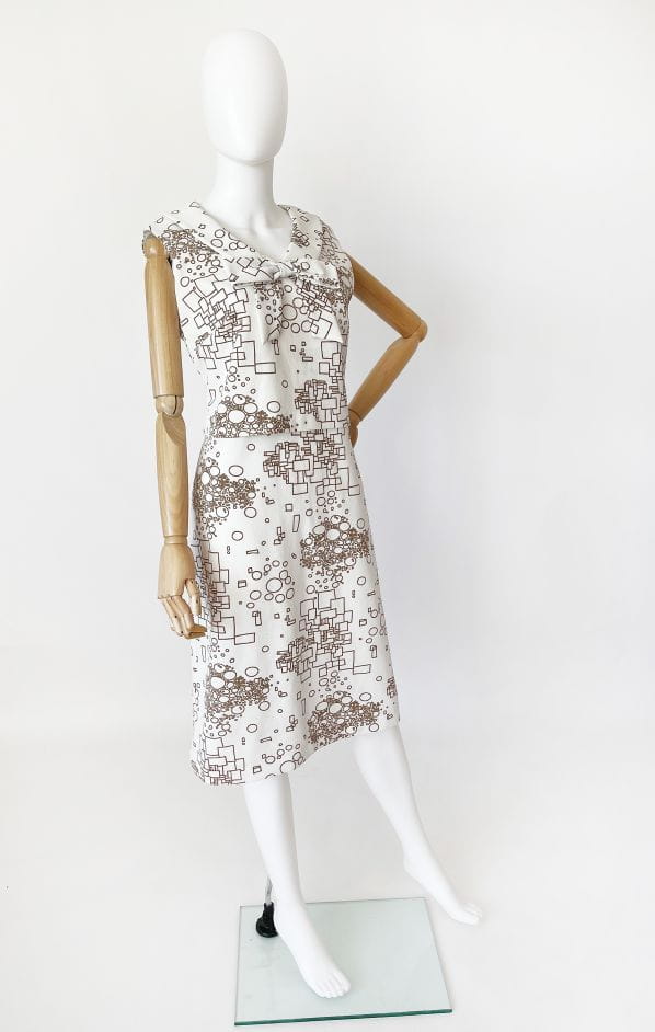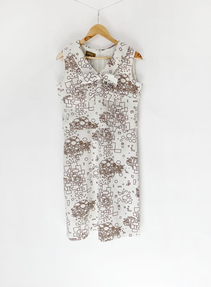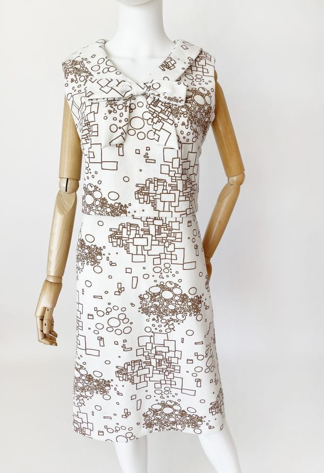 Oryginalny projekt z lat 60-tych. Ciekawa sukienka projektu Susan Barry. Wykonana z białej krempliny w beżowe wzory geometryczne. Górna część z przodu w formie crop topu nałożonego na całość. U góry okrągły kołnierz z dekoracyjną kokardą.