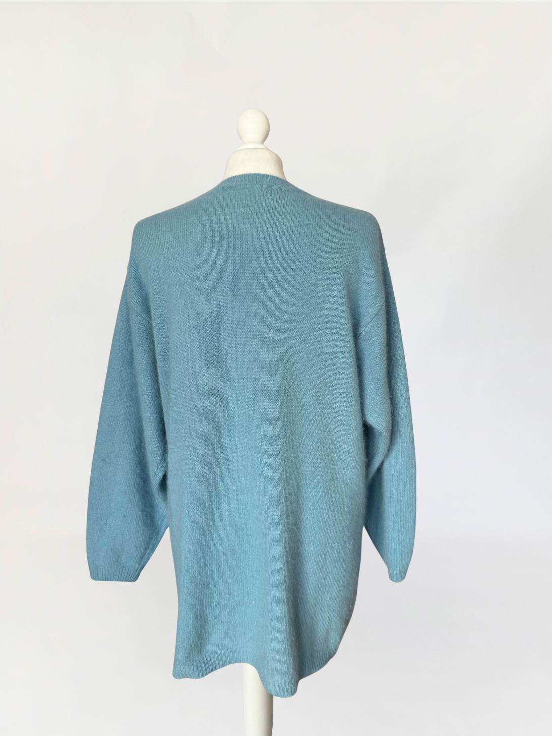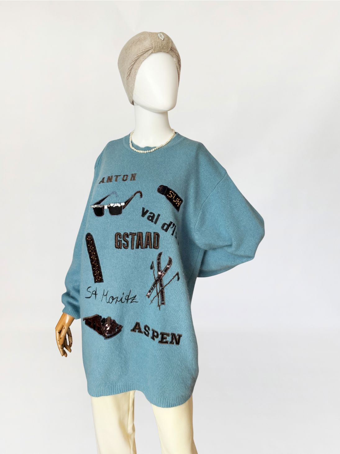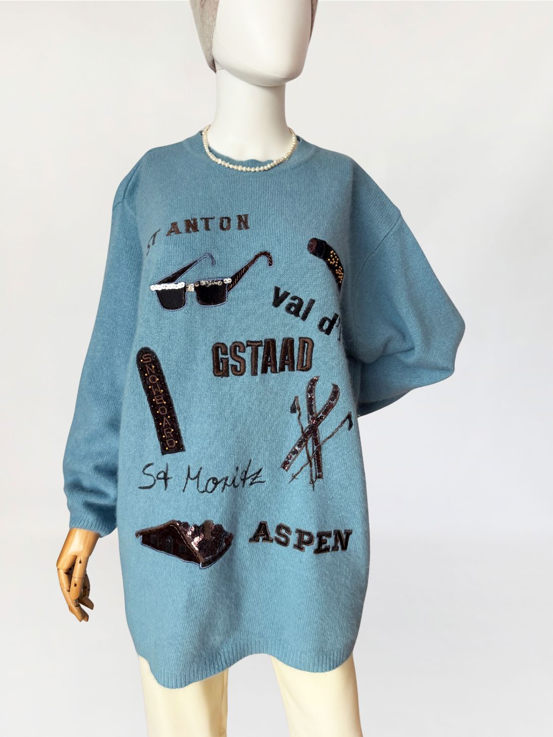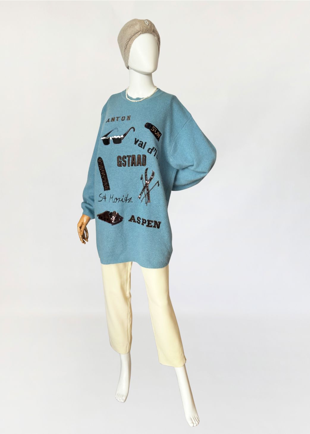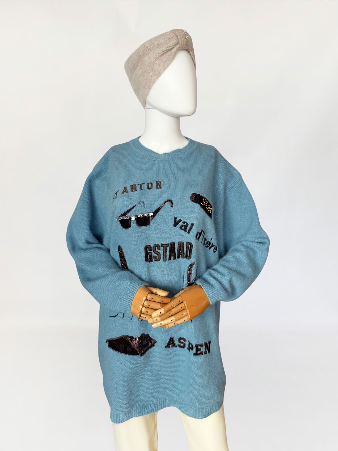 Sweter vintage après-ski, wykonany z luksusowej mieszanki wełny jagnięcej (50%) i angory (40%) z dodatkiem poliamidu (10%) w spokojnym, przygaszonym odcieniu błękitu. Miękka, lekka i puszysta dzianina, przyjemnie otulająca skórę. Model u dłuższym, swobodnym fasonie z obniżoną linią ramion i długimi rękawami. Dekolt okrągły, wykończony wąskim, elastycznym ściągaczem. Dół oraz mankiety również wykończone w ten sam sposób. Przód zdobiony aplikacjami o tematyce narciarskiej i alpejskiej: haftowane i naszywane elementy z dodatkiem cekinów i koralików, uzupełnione haftowanymi napisami nawiązującymi do europejskich i amerykańskich kurortów zimowych (m.in. Gstaad, St. Moritz, Aspen). Dekoracje rozmieszczone asymetrycznie, zróżnicowane fakturowo i materiałowo.