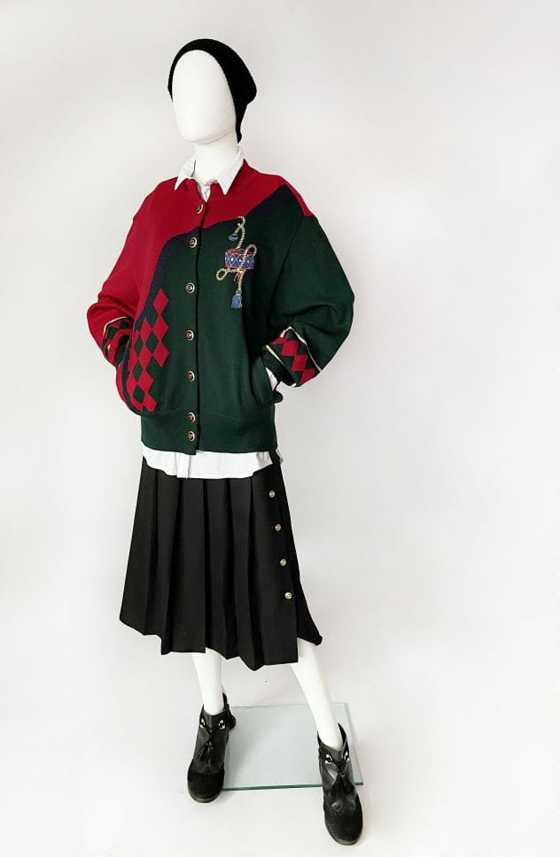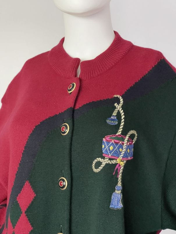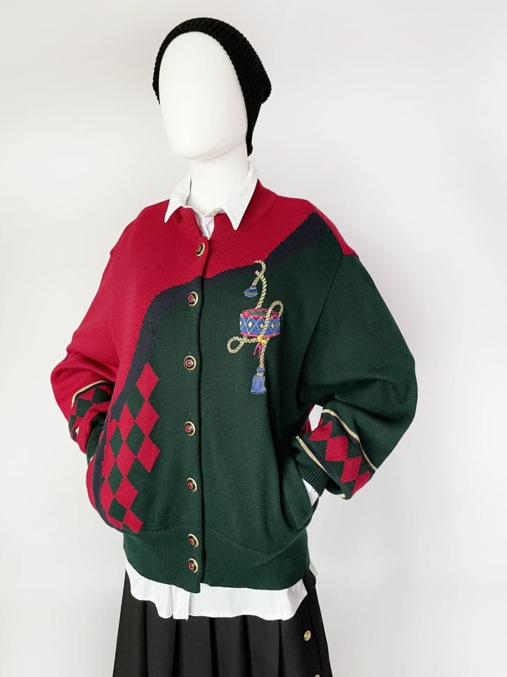 Sweter vintage w świątecznych kolorach. Rozpinany dłuższy fason ze stójką. Długie, klasycznie wszyte rękawy. Z przodu haftowana aplikacja z chwostami. Miejscowo wzory w romby. Zapinany na dekoracyjne guziki. U dołu wsuwane kieszenie.