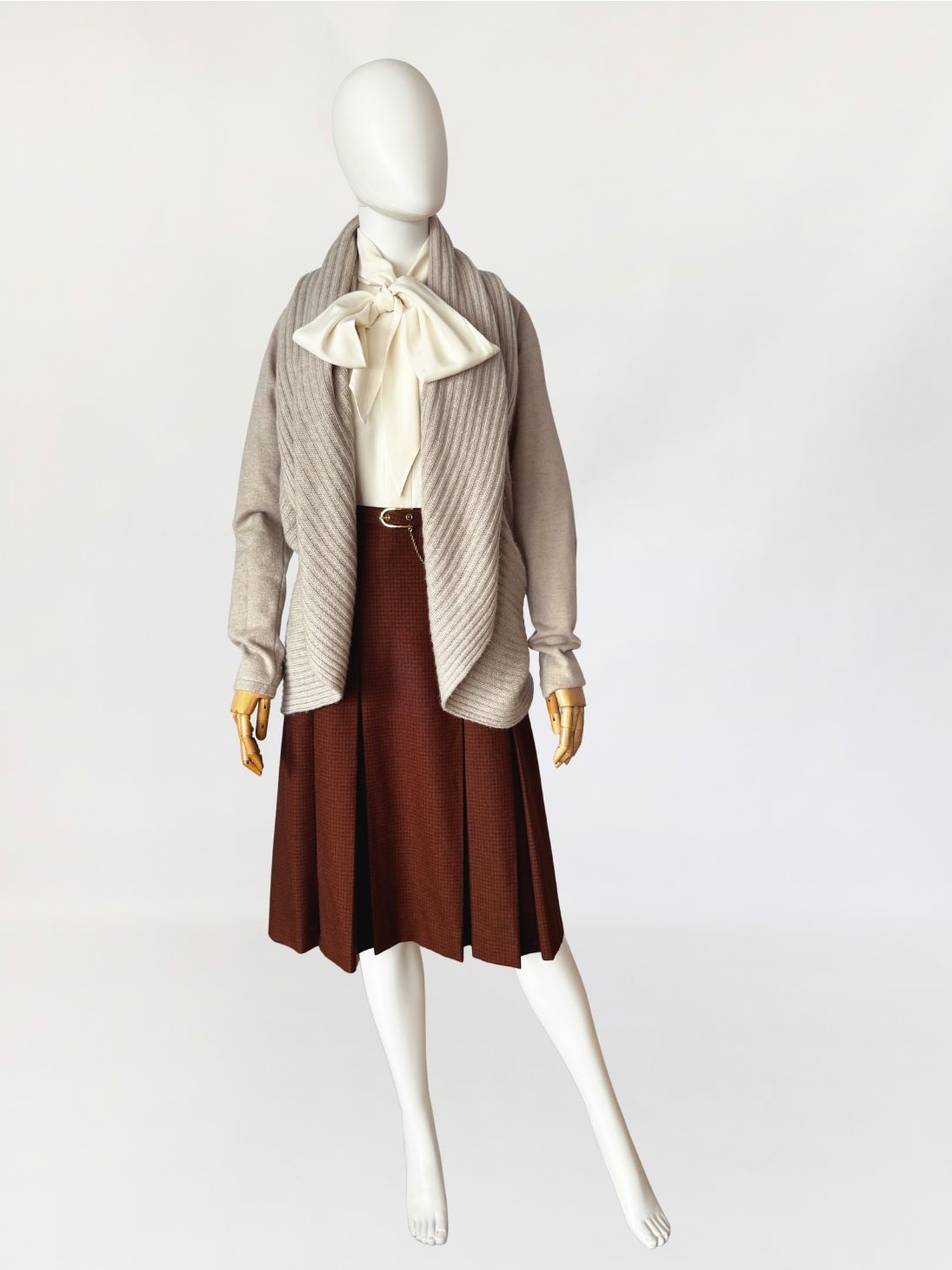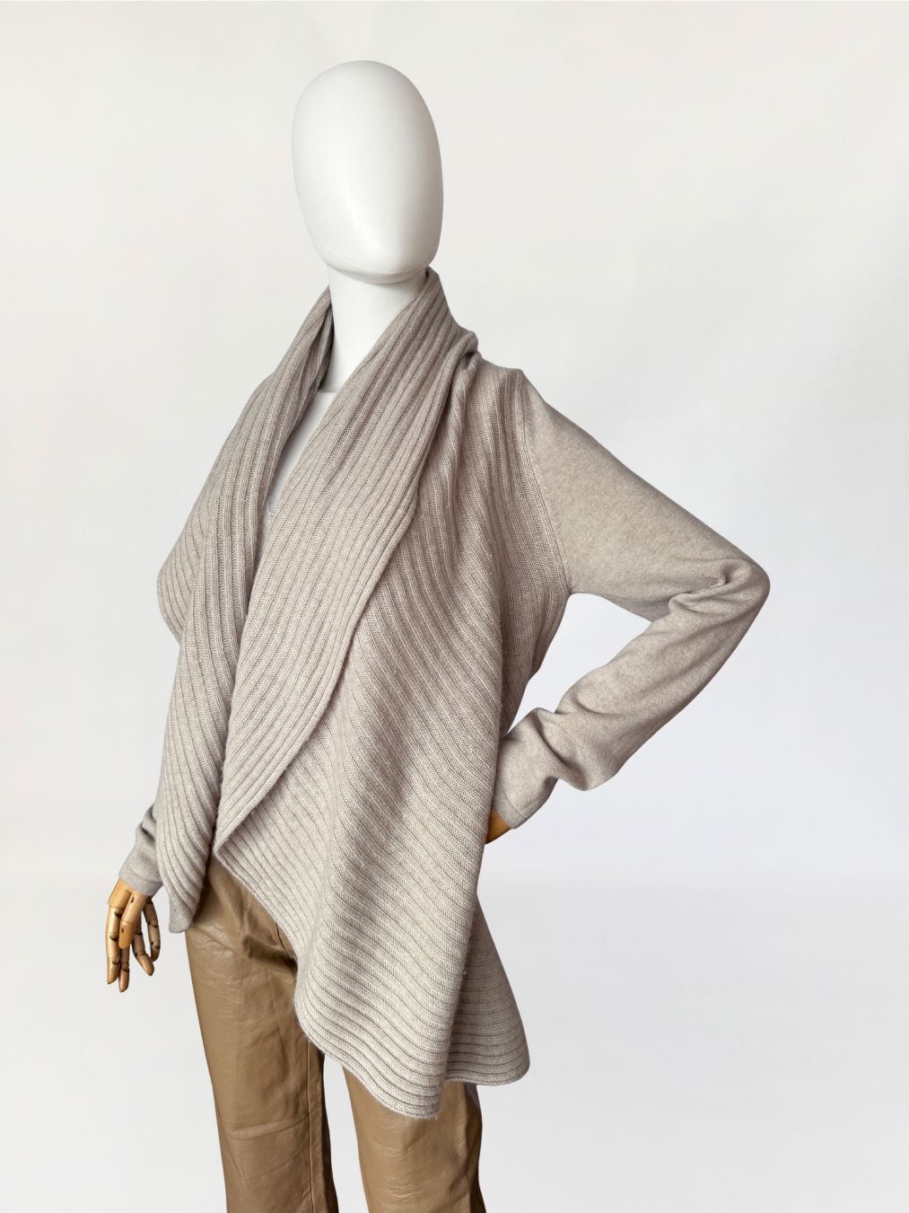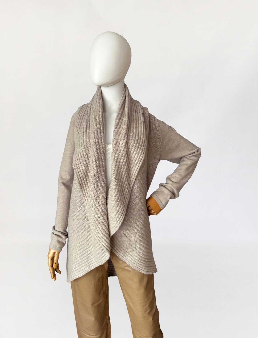 Sweter vintage, wykonany z lekkiej przędzy z wełny merino z dodatkiem kaszmiru w jasnym odcieniu taupe. Model open front z długimi połami o płynnym spływie tworzącymi szalowy kołnierz. Długie gładkie rękawy. Wykończenia w wyraźny prążek. Dzianina elastyczna, sprężysta, bardzo miękka.