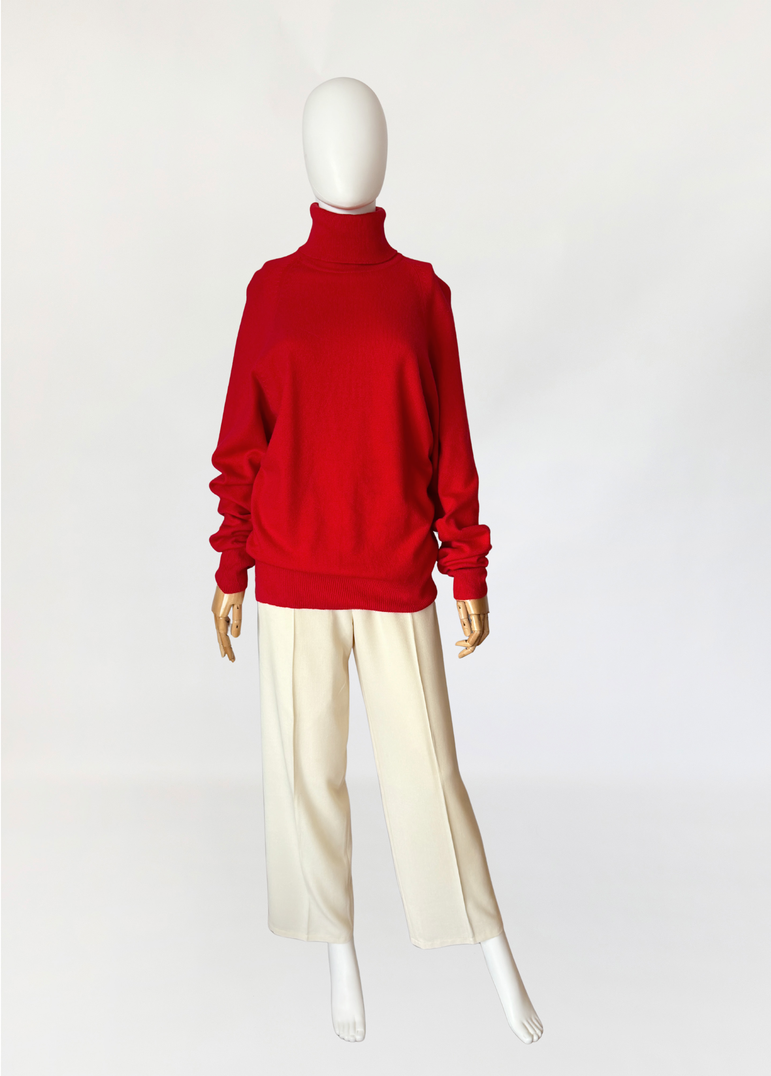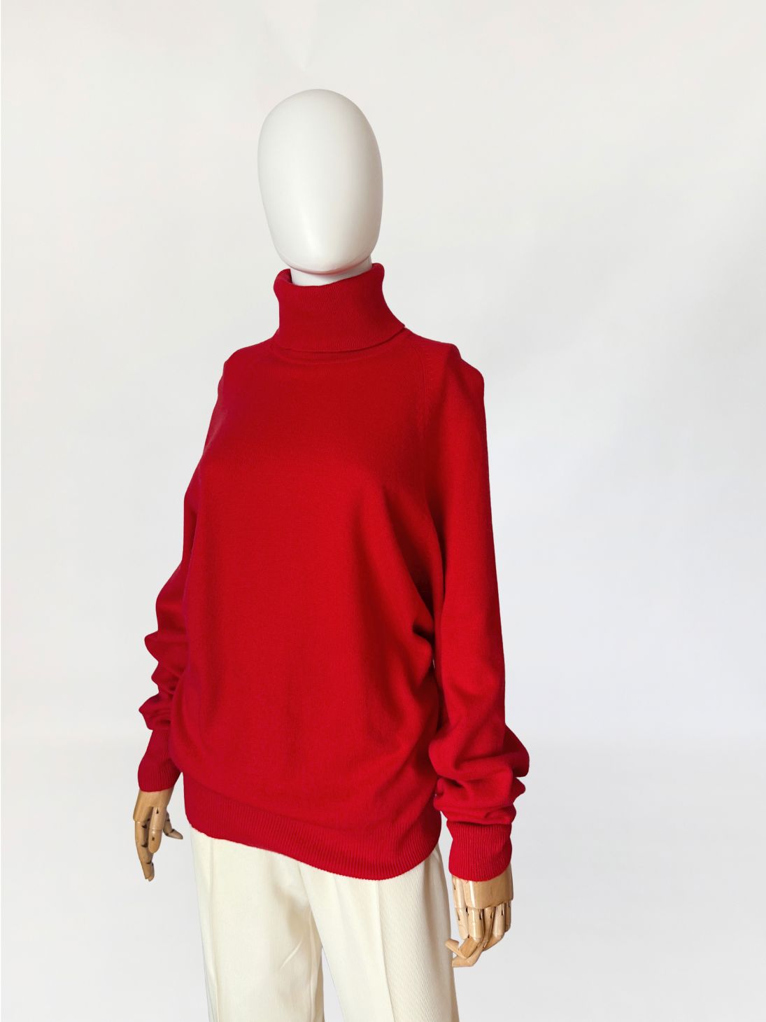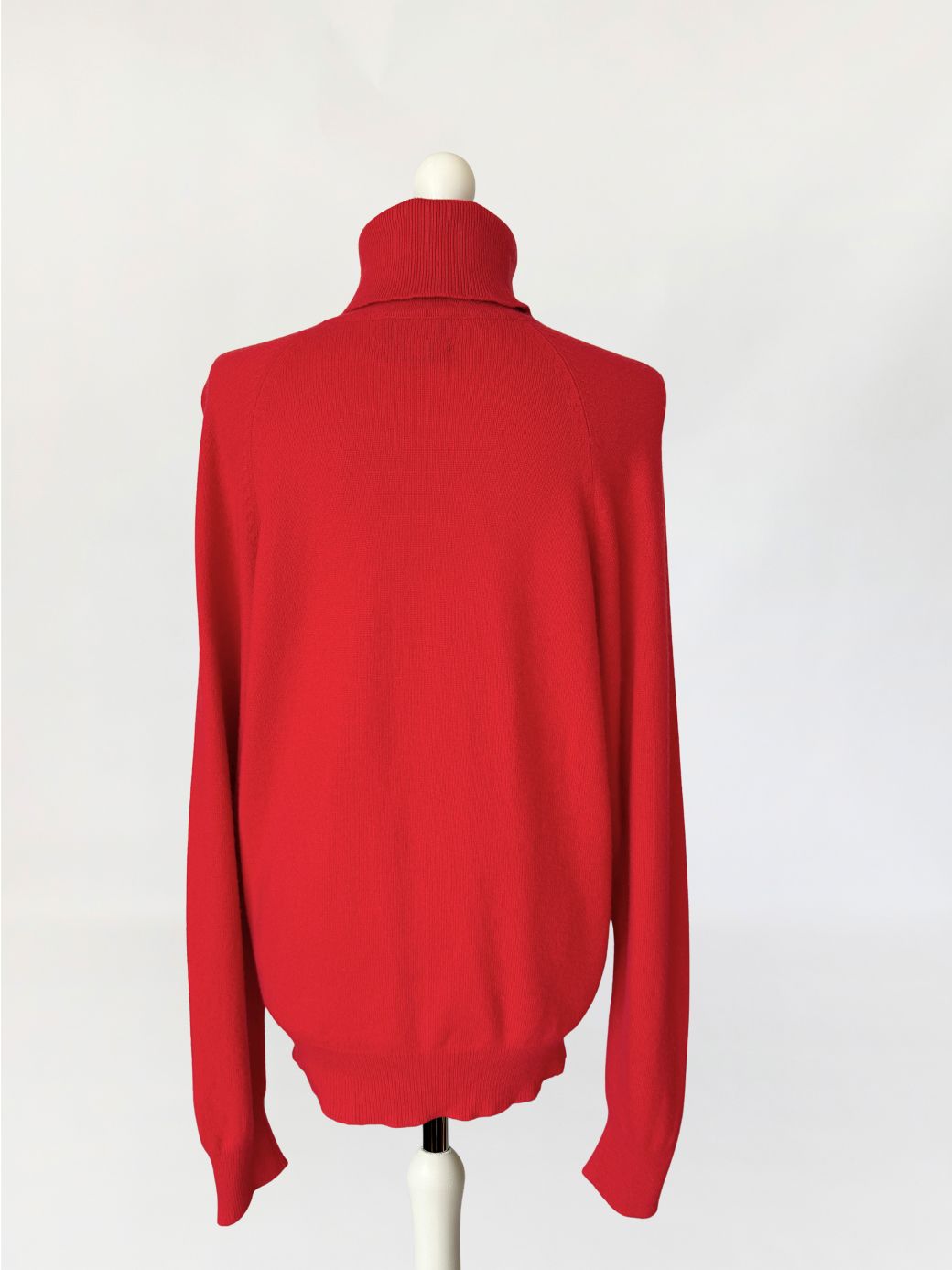 Sweter vintage wykonany w 100% z kaszmiru, w intensywnym czerwonym kolorze. Dzianina miękka, lekka i wyjątkowo przyjemna w dotyku, o gładkiej, jednolitej strukturze. Fasonz raglanową linią rękawów i długimi rękawami zakończonymi delikatnymi ściągaczami. Wysoki golf miękko układa się przy szyi. Dół wykończony ściągaczem, tył gładki.