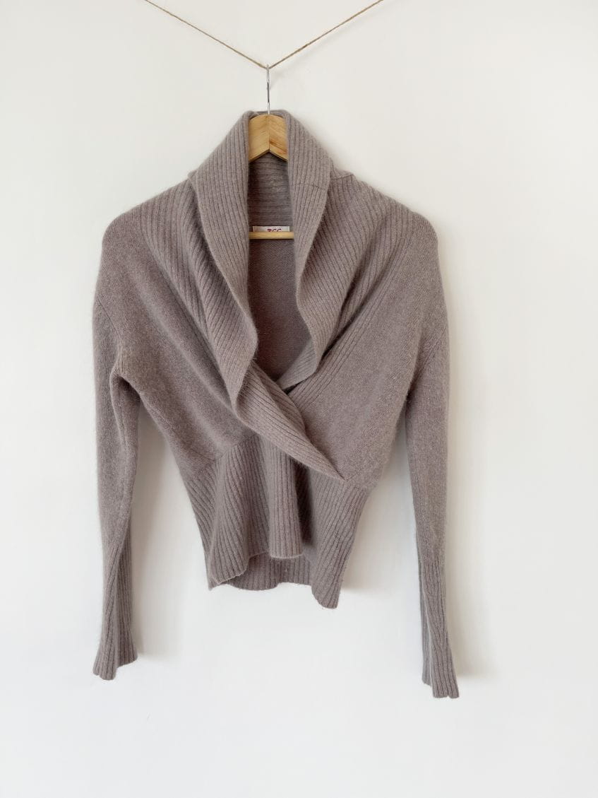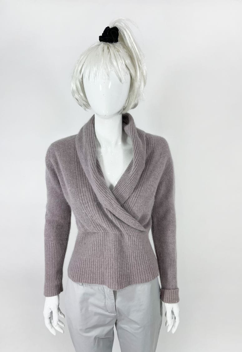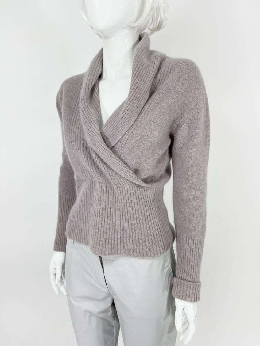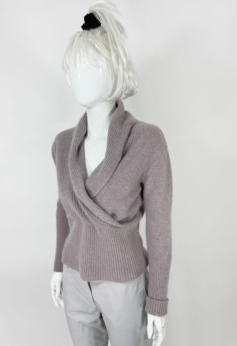 Sweter z kopertowym dekoltem i dużym kołnierzem. Miękki i puchaty. U dołu wysoki ściągacz.