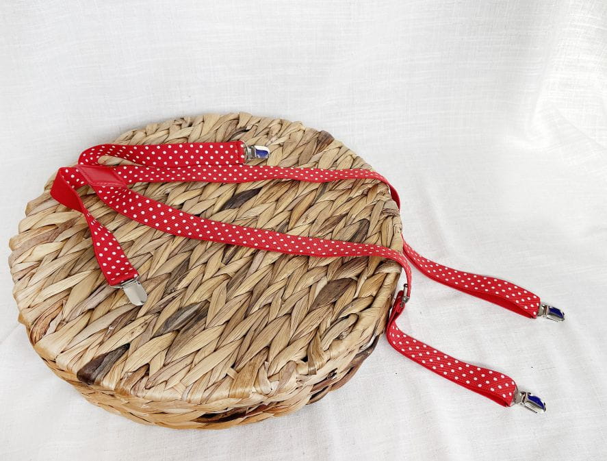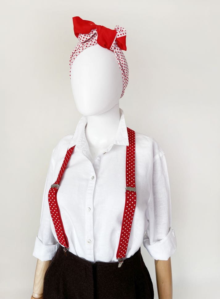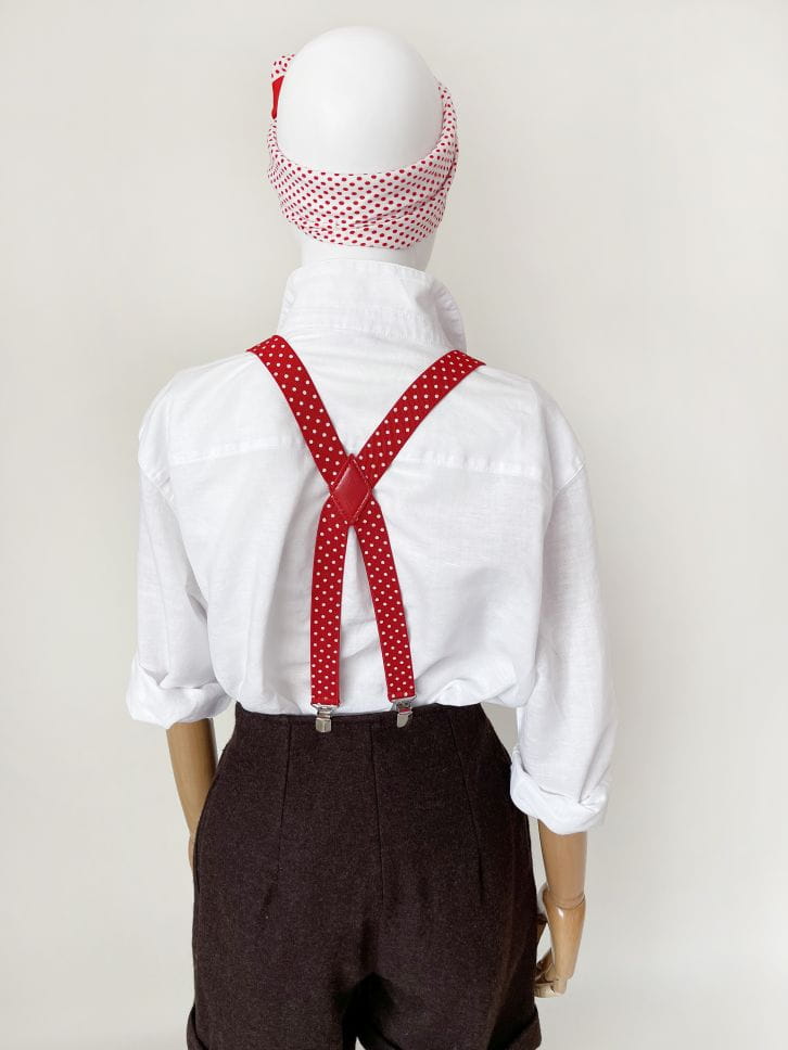 Elastyczne szelki vintage o deseniu w drobne groszki. Zakończone metalowymi żabkami. Regulowane, uniwersalny rozmiar. Unisex.