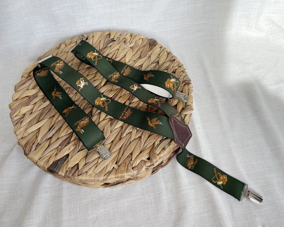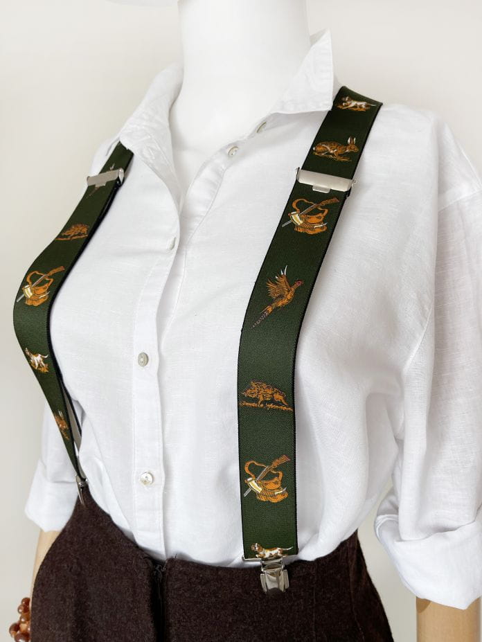 Bawarskie szelki vintage we wzory myśliwskie. Wstawki z naturalnej skóry. Zakończone metalowymi żabkami. Regulowane, uniwersalny rozmiar. Unisex.