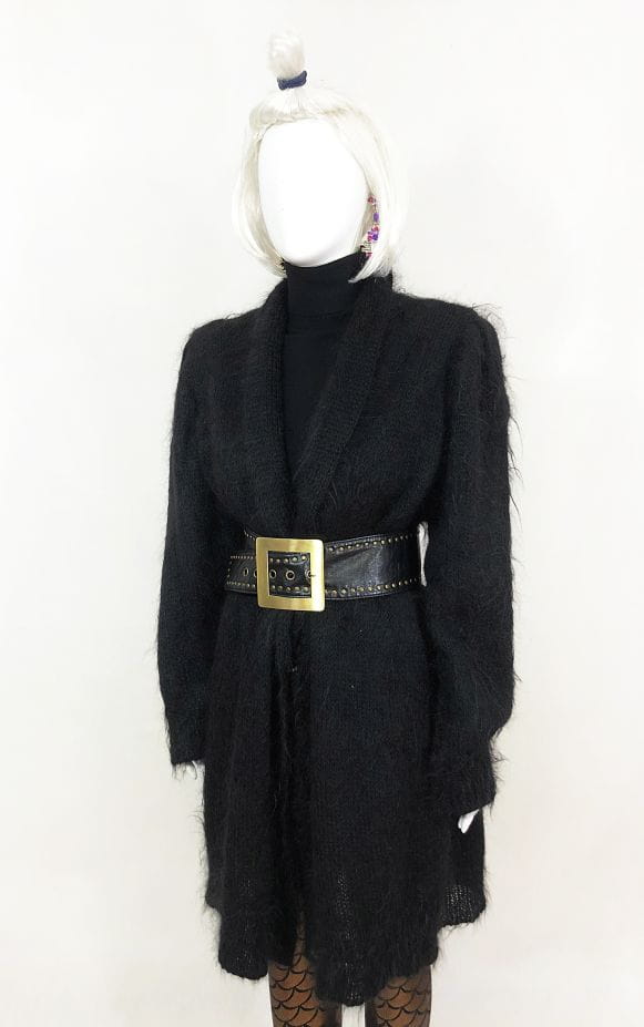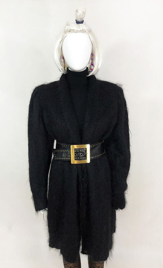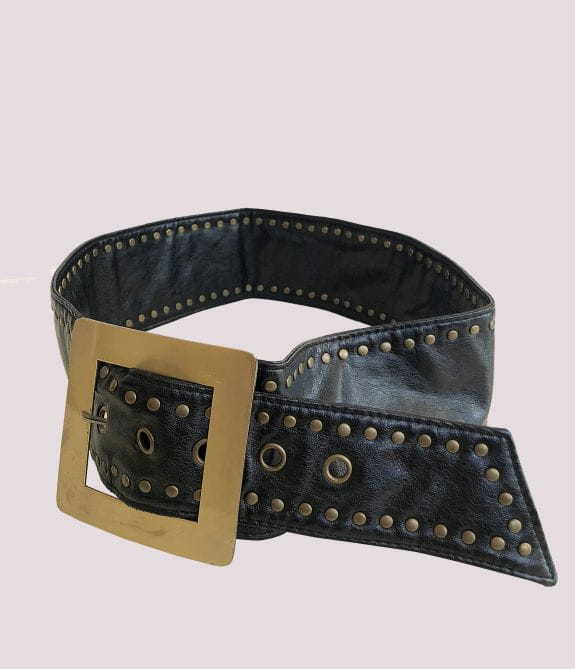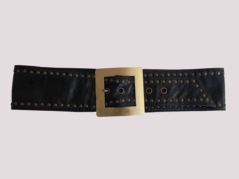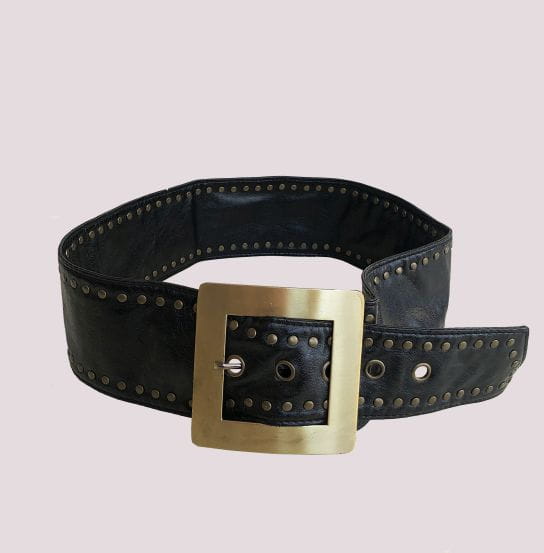 Czarny szeroki pas vintage wykonany z miękkiej sztucznej skóry. Duża metalowa klamra w złotym kolorze. Kilku-stopniowa regulacja.