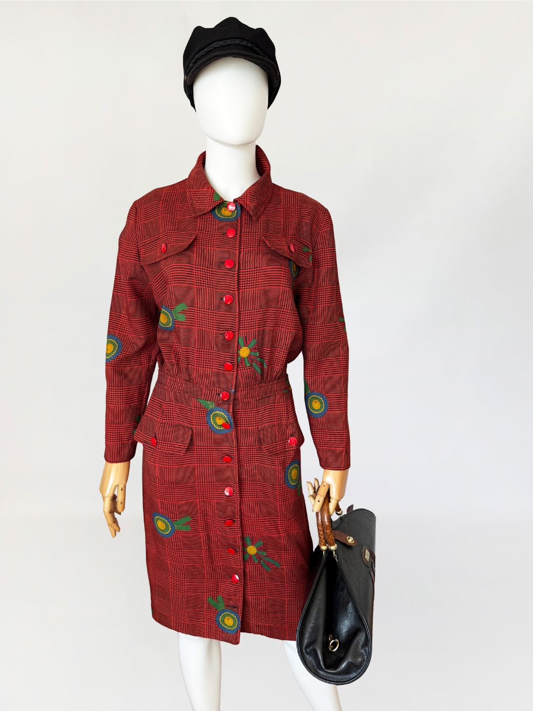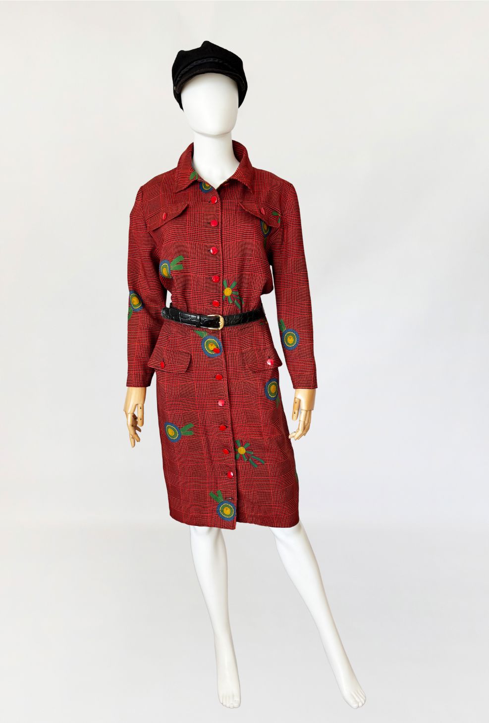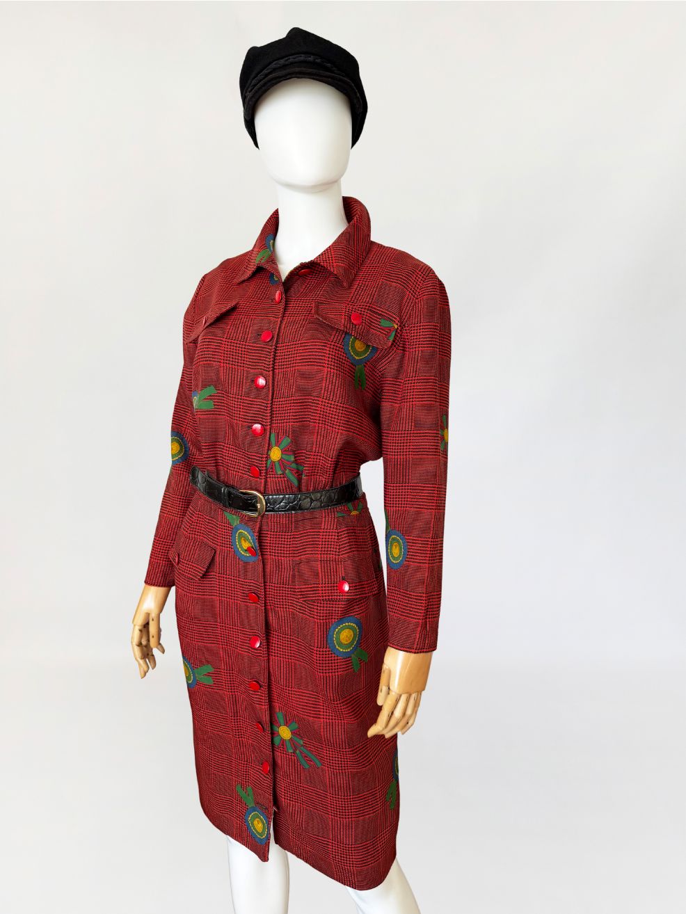 Oryginalna sukienka vintage od Ted Lapidus, z przełomu lat 70-tych/80-tych. Wykonana w całości z lekkiej wełnianej tkaniny w czerwono-czarny drobny wzór o układzie kierunkowym. Tkanina zdobiona kontrastowym nadrukiem w formie stylizowanych emblematów jeździeckich z motywem konia, rozmieszczonych nieregularnie na powierzchni materiału. Fason koszulowy, zapinany na całej długości na plastikowe czerwone guziki. Góra z klasycznym kołnierzem koszulowym oraz patkami imitującymi kieszenie. Rękawy długie, wszywane klasycznie. Dół prosty, o długości do kolana.