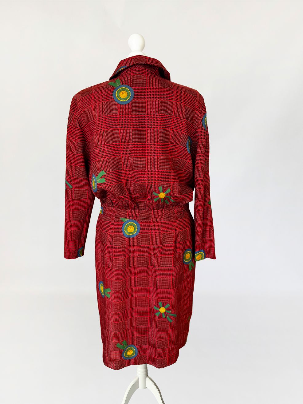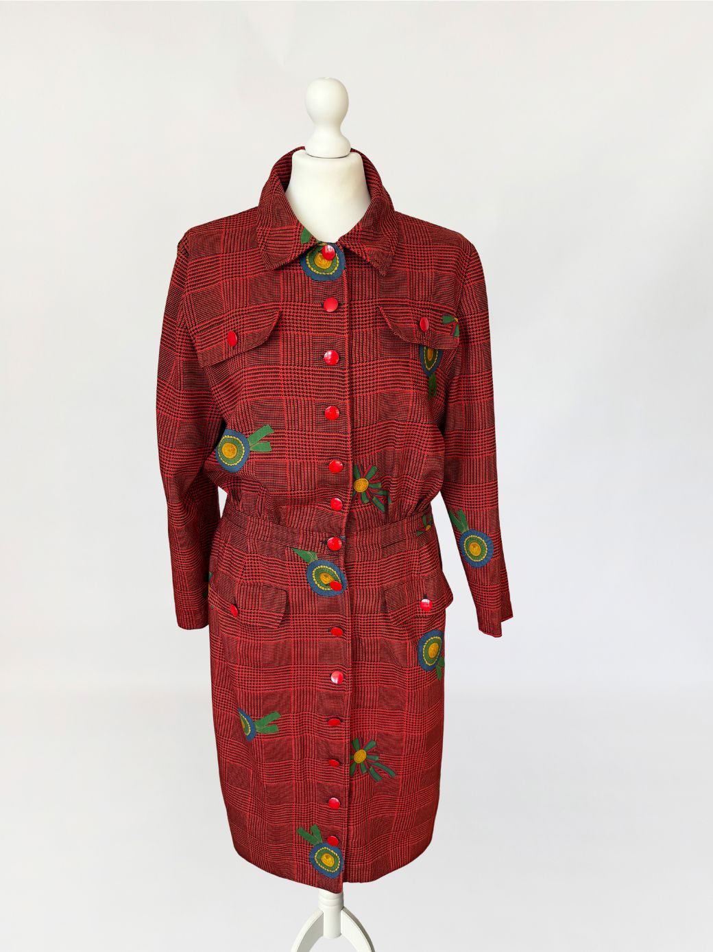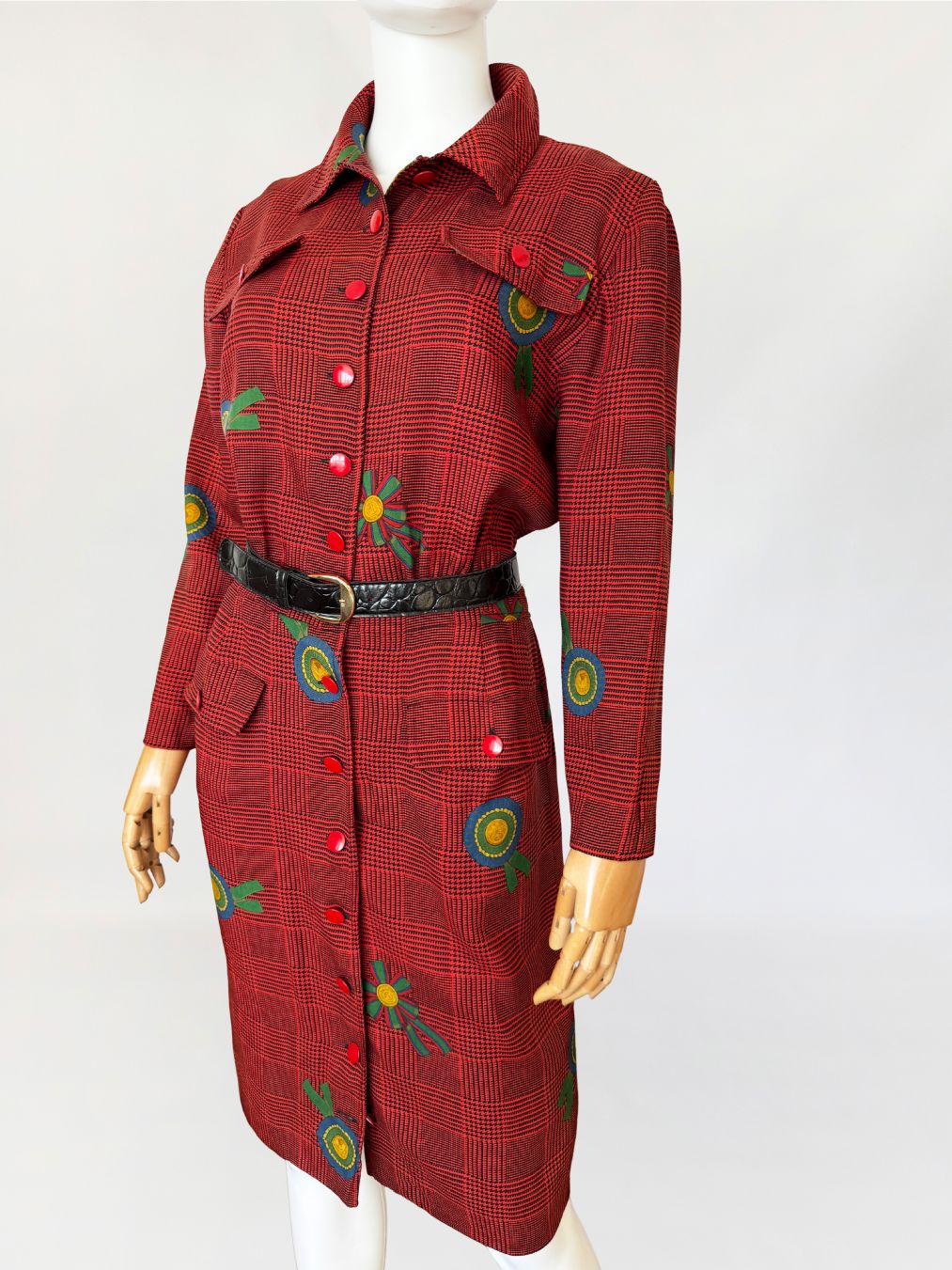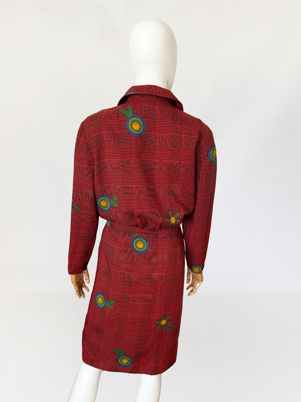 Oryginalna sukienka vintage od Ted Lapidus, z przełomu lat 70-tych/80-tych. Wykonana w całości z lekkiej wełnianej tkaniny w czerwono-czarny drobny wzór o układzie kierunkowym. Tkanina zdobiona kontrastowym nadrukiem w formie stylizowanych emblematów jeździeckich z motywem konia, rozmieszczonych nieregularnie na powierzchni materiału. Fason koszulowy, zapinany na całej długości na plastikowe czerwone guziki. Góra z klasycznym kołnierzem koszulowym oraz patkami imitującymi kieszenie. Rękawy długie, wszywane klasycznie. Dół prosty, o długości do kolana.