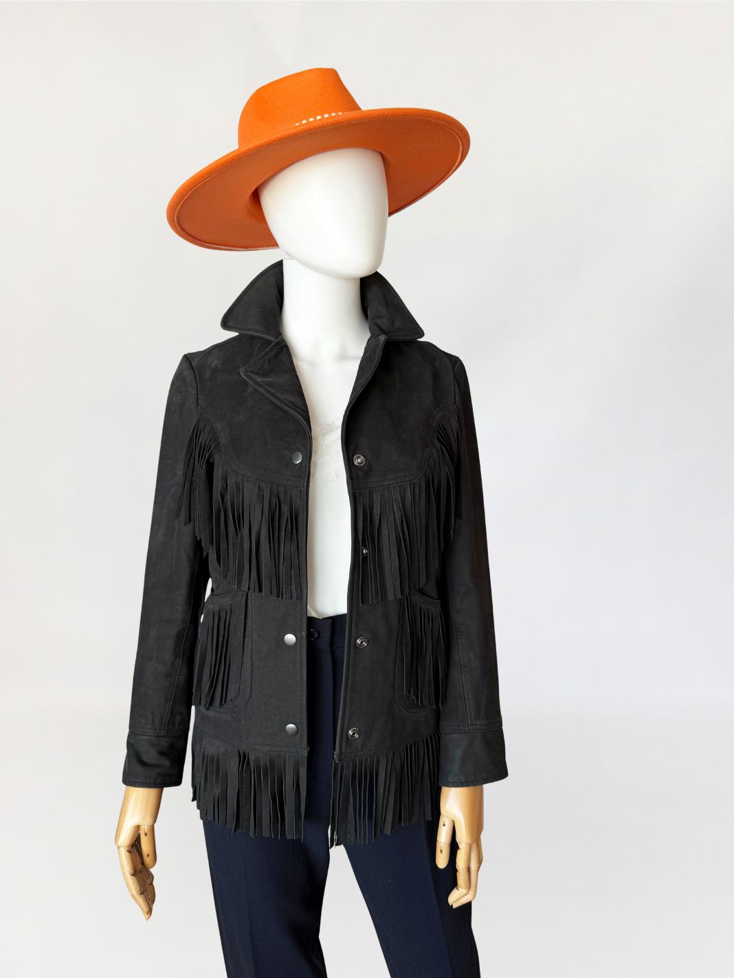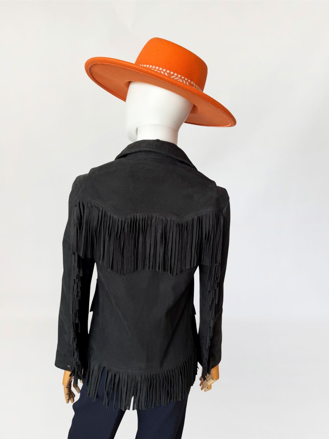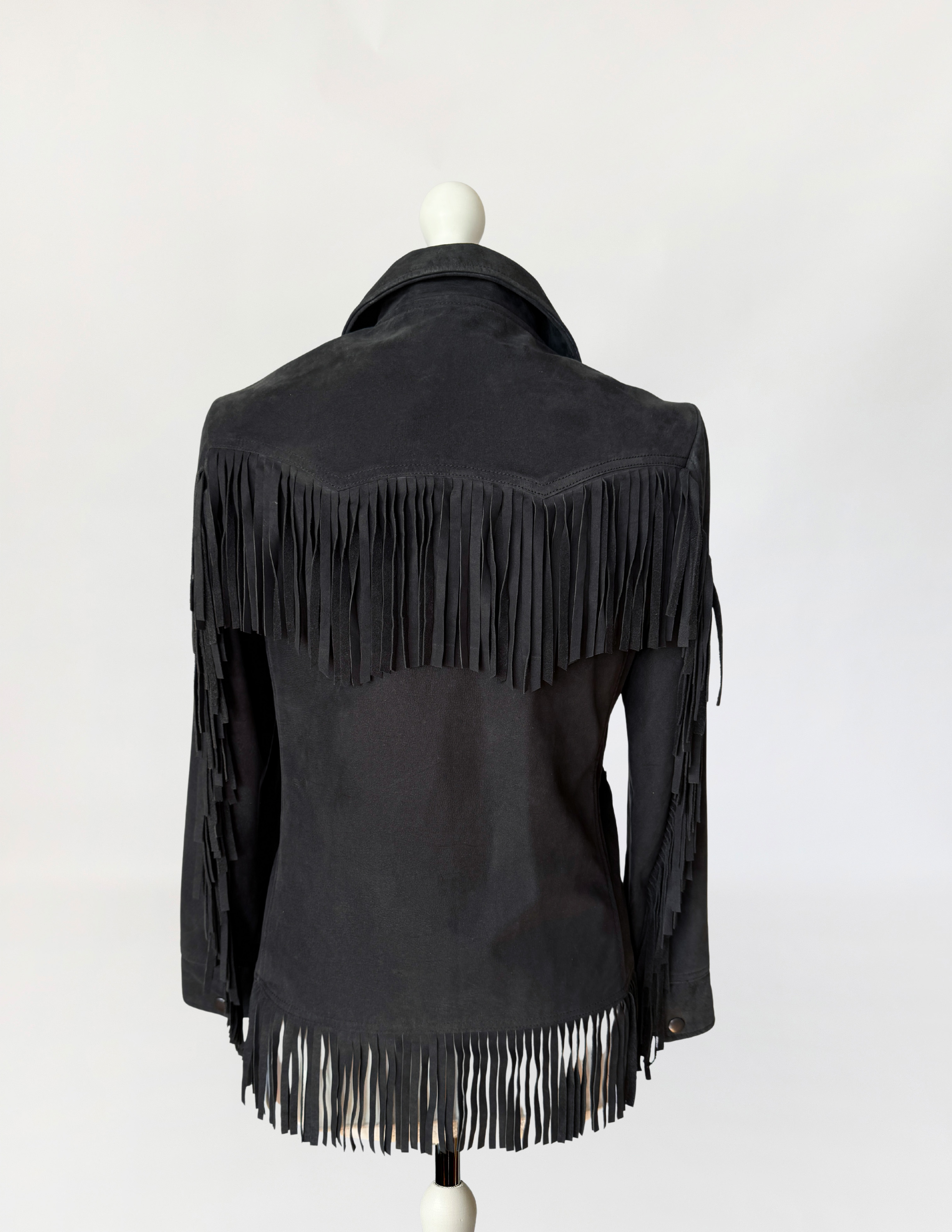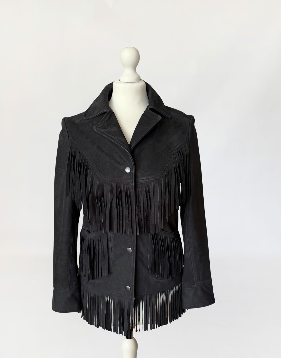 Nieużywana, z papierową metką. Kurtka luksusowej amerykańskiej marki Title A, ciężkiej do zdobycia w Europie. Wykonana z naturalnej skóry nubuk w czarnym odcieniu. Klasyczny koszulowy fason z długimi rękawami i niedużym kołnierzem. W dolnej części naszywane spore kieszenie. Front, karczek z tyłu, rękawy i kieszenie wykończone falującymi frędzlami ze skóry, które dodają jej westernowego looku. Zapinana na metalowe napy.