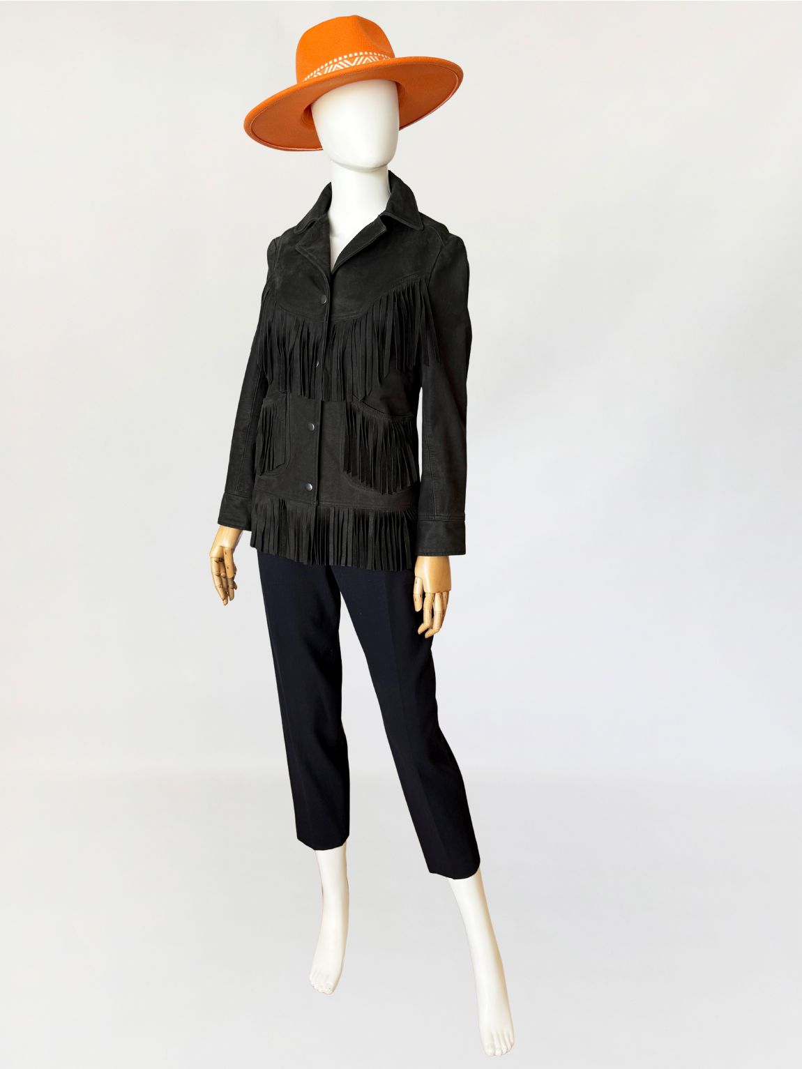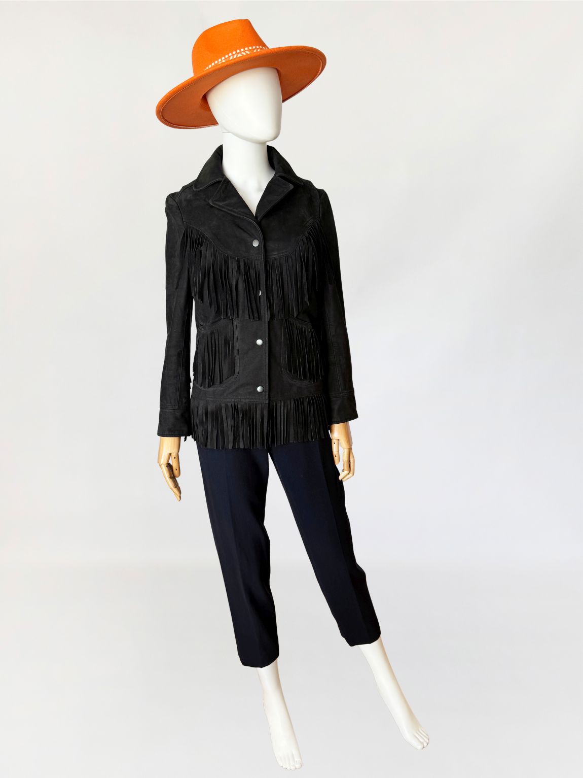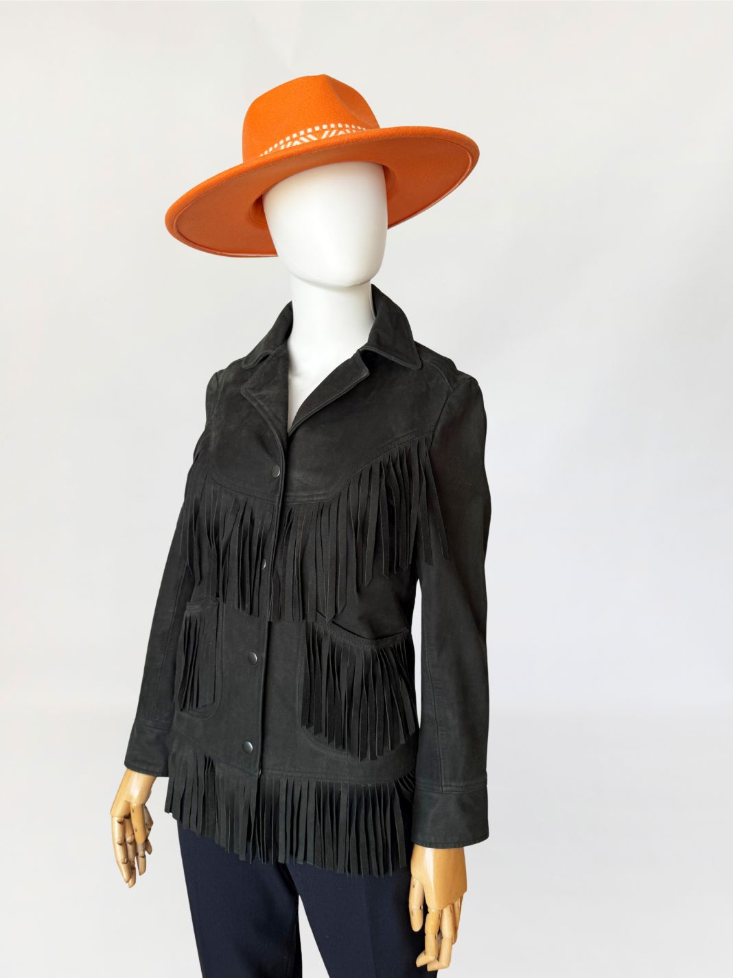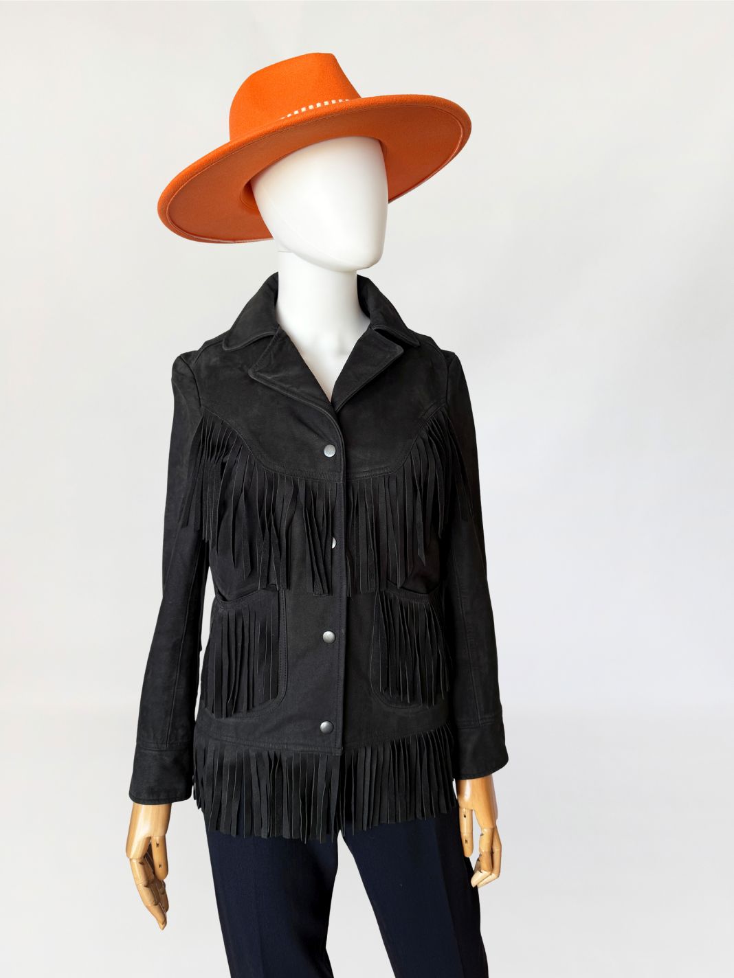 Nieużywana, z papierową metką. Kurtka luksusowej amerykańskiej marki Title A, ciężkiej do zdobycia w Europie. Wykonana z naturalnej skóry nubuk w czarnym odcieniu. Klasyczny koszulowy fason z długimi rękawami i niedużym kołnierzem. W dolnej części naszywane spore kieszenie. Front, karczek z tyłu, rękawy i kieszenie wykończone falującymi frędzlami ze skóry, które dodają jej westernowego looku. Zapinana na metalowe napy.