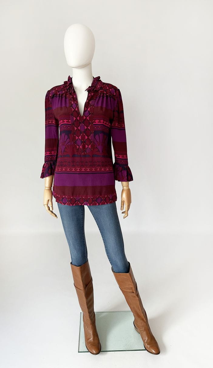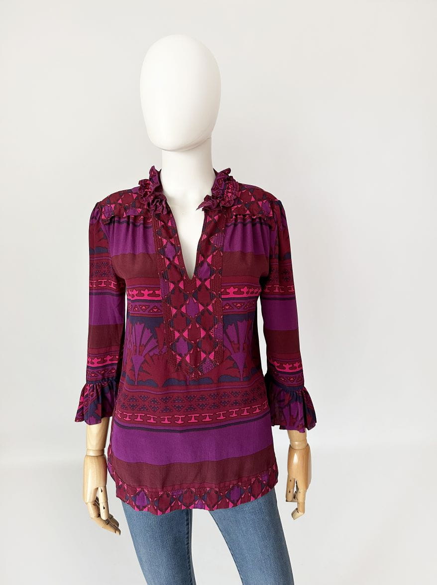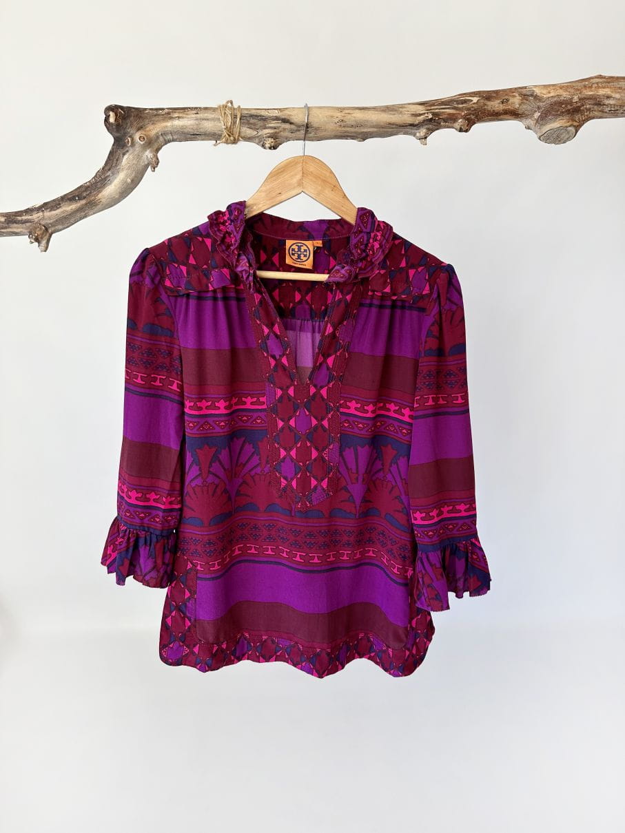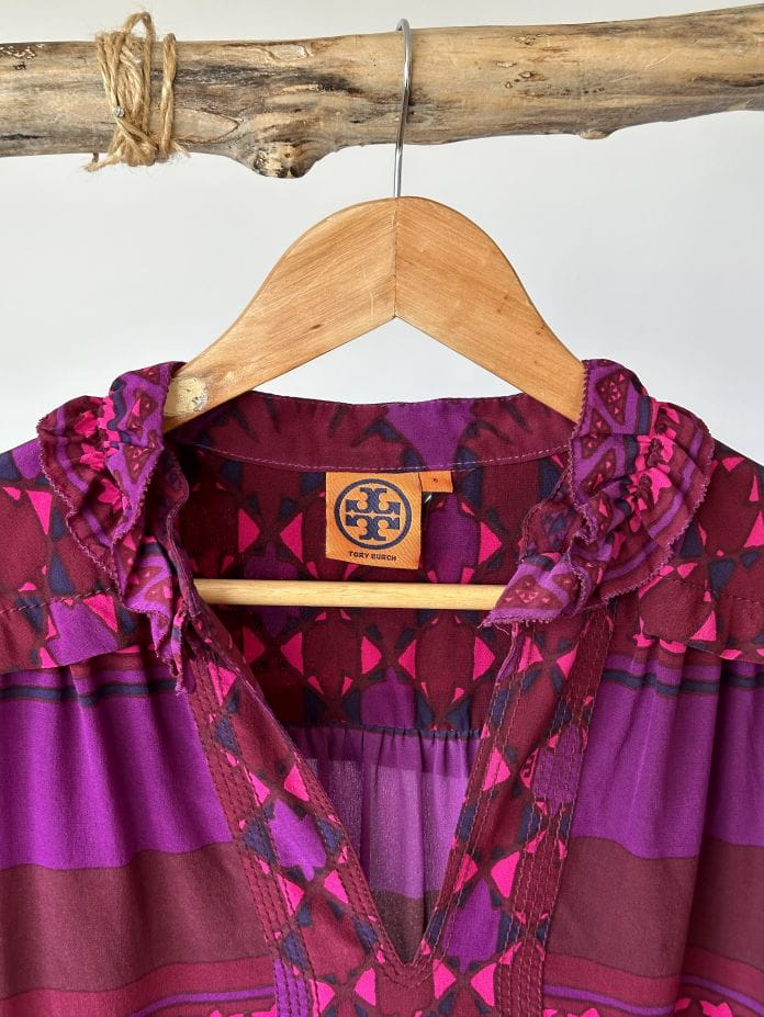Koszulowa bluzka luksusowej amerykańskiej marki Tory Burch. Wykonana z naturalnego jedwabiu energetycznych kolorach. Prosty swobodny fason z rękawami 3/4 i dekoltem v-neck i dekoracyjną riuszką.