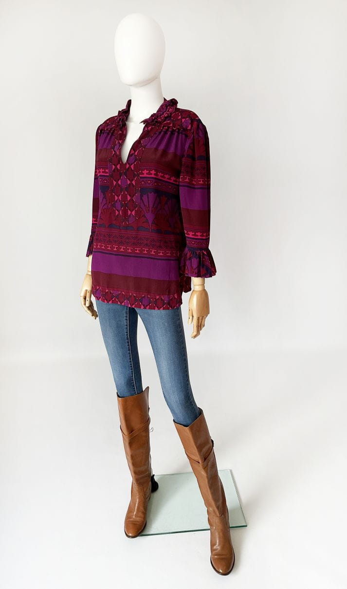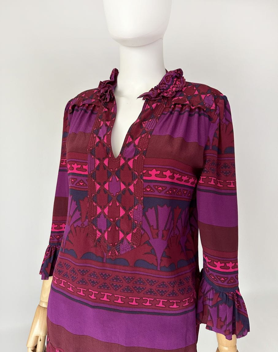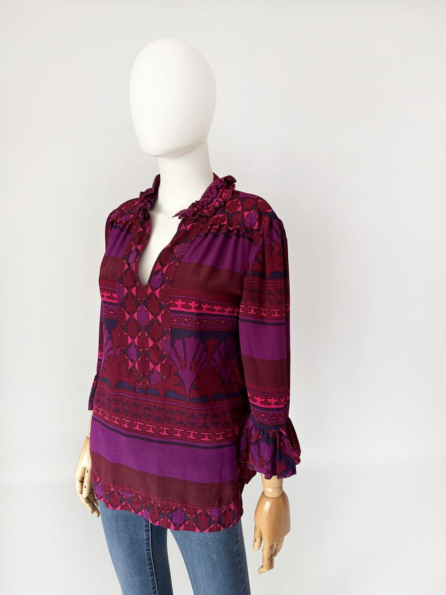 Koszulowa bluzka luksusowej amerykańskiej marki Tory Burch. Wykonana z naturalnego jedwabiu energetycznych kolorach. Prosty swobodny fason z rękawami 3/4 i dekoltem v-neck i dekoracyjną riuszką.