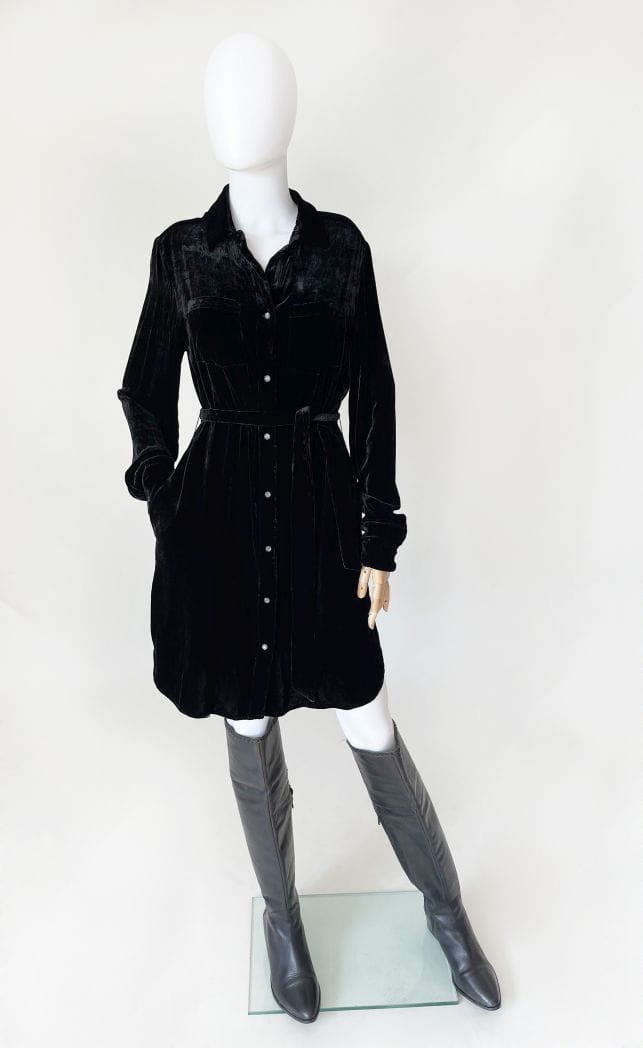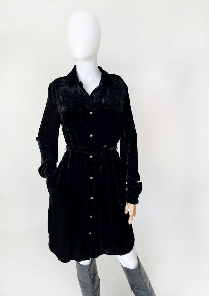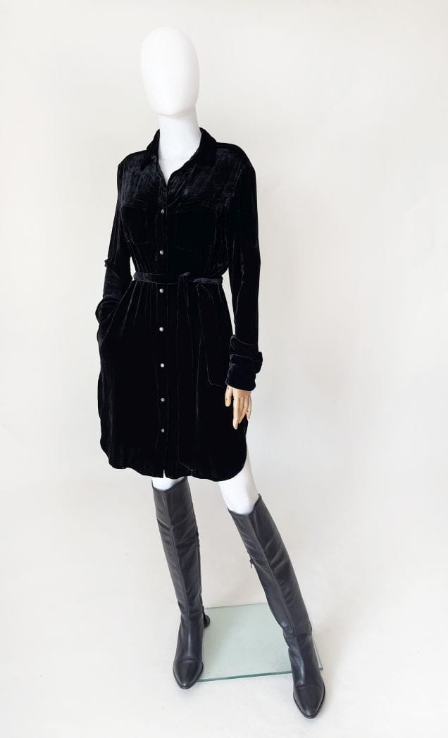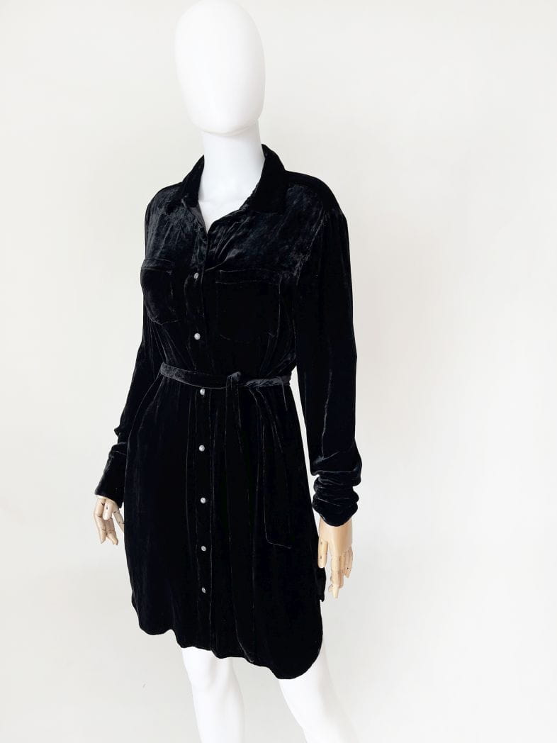 Rozpinana midi sukienka luksusowej amerykańskiej marki True Religion. Wykonana z miękkiej aksamitnej tkaniny w kolorze czarnym. Koszulowa góra z długimi rękawami i kołnierzem. Zapinana na całości na logowane napy. W talii przewiązywana materiałowym paskiem. Boczne szwy kryją wsuwane kieszenie. Oryginalna z kompletem metek wewnętrznych. Cena sklepowa nowej ok 1200 zł.