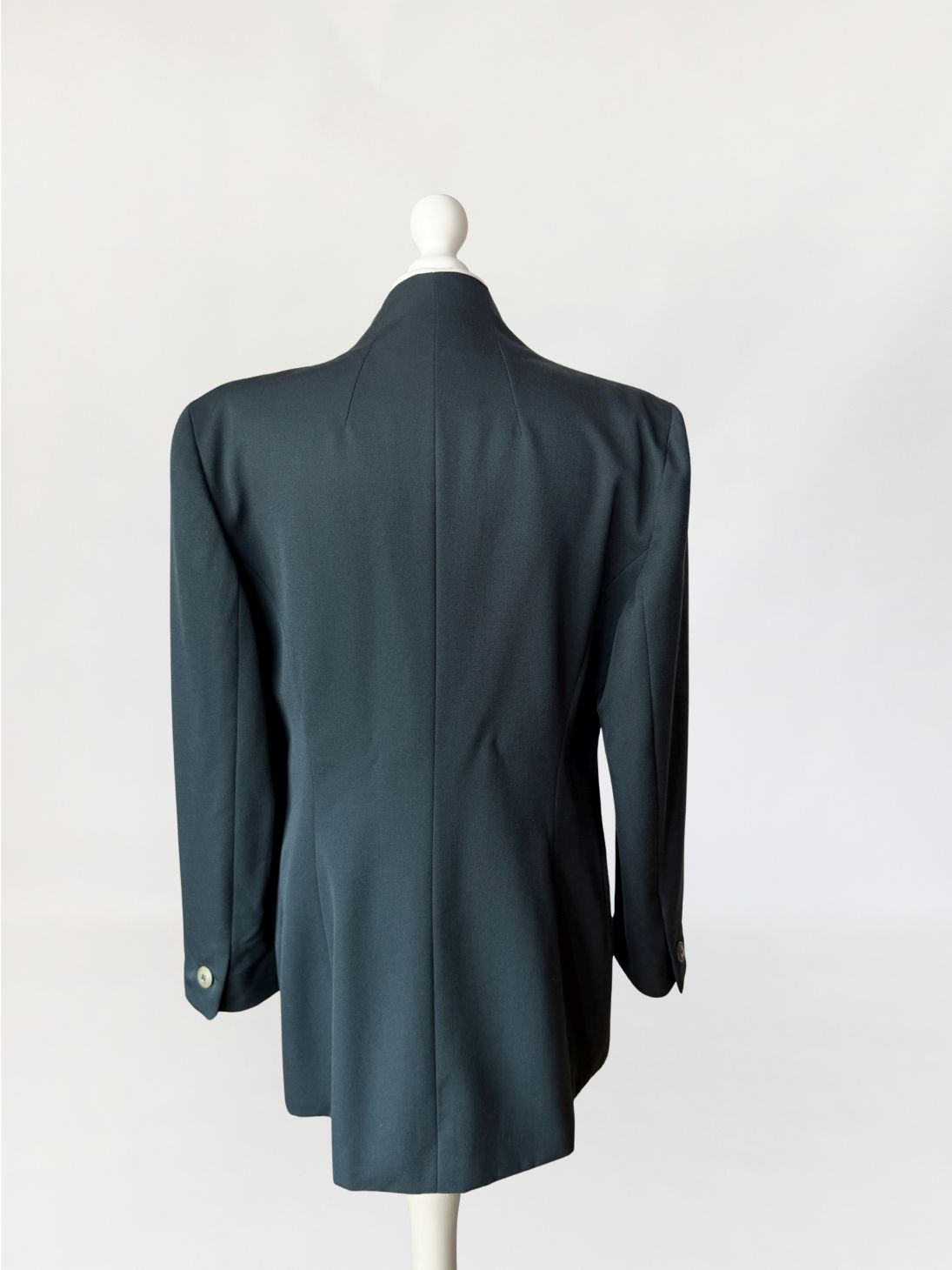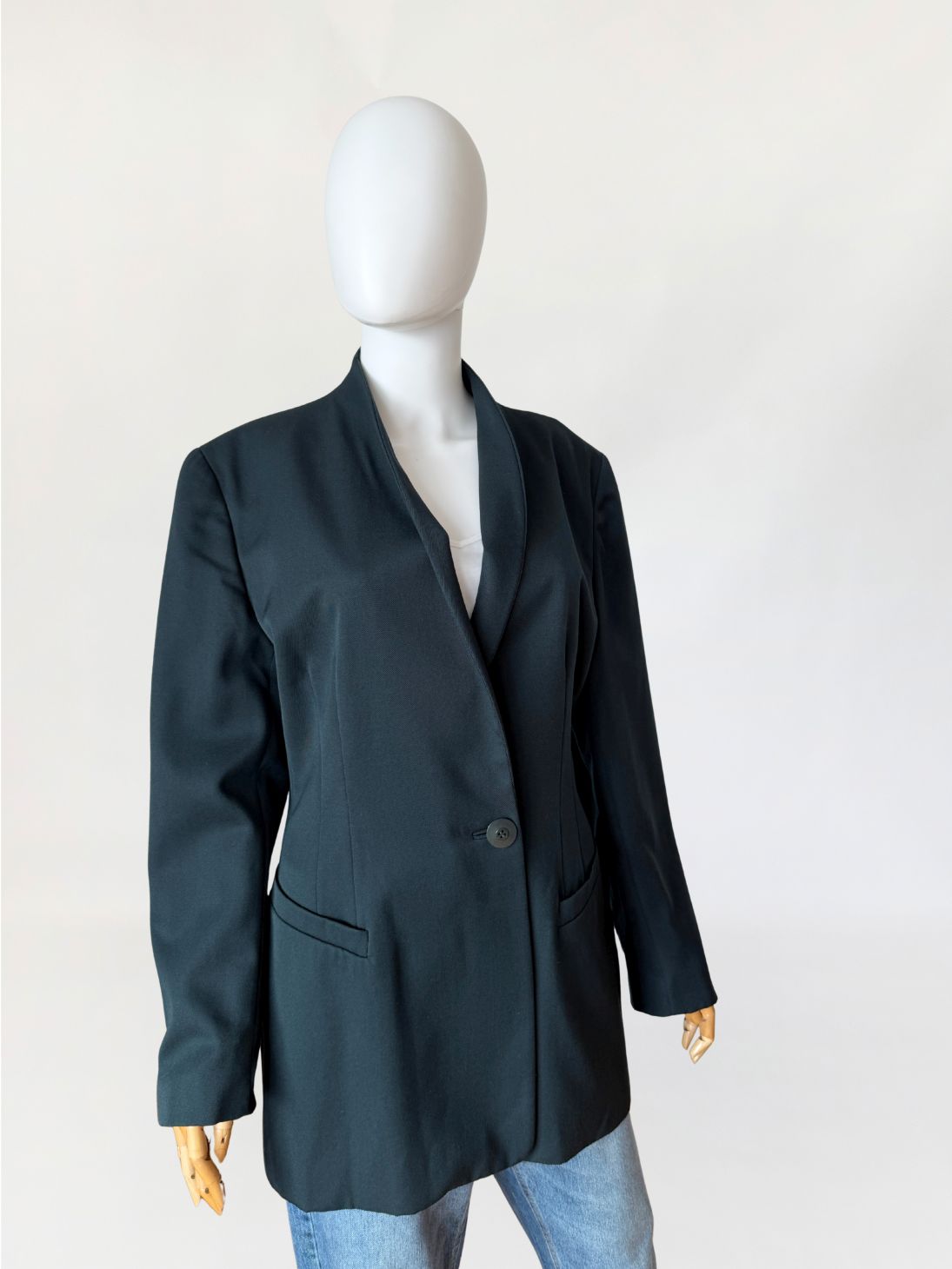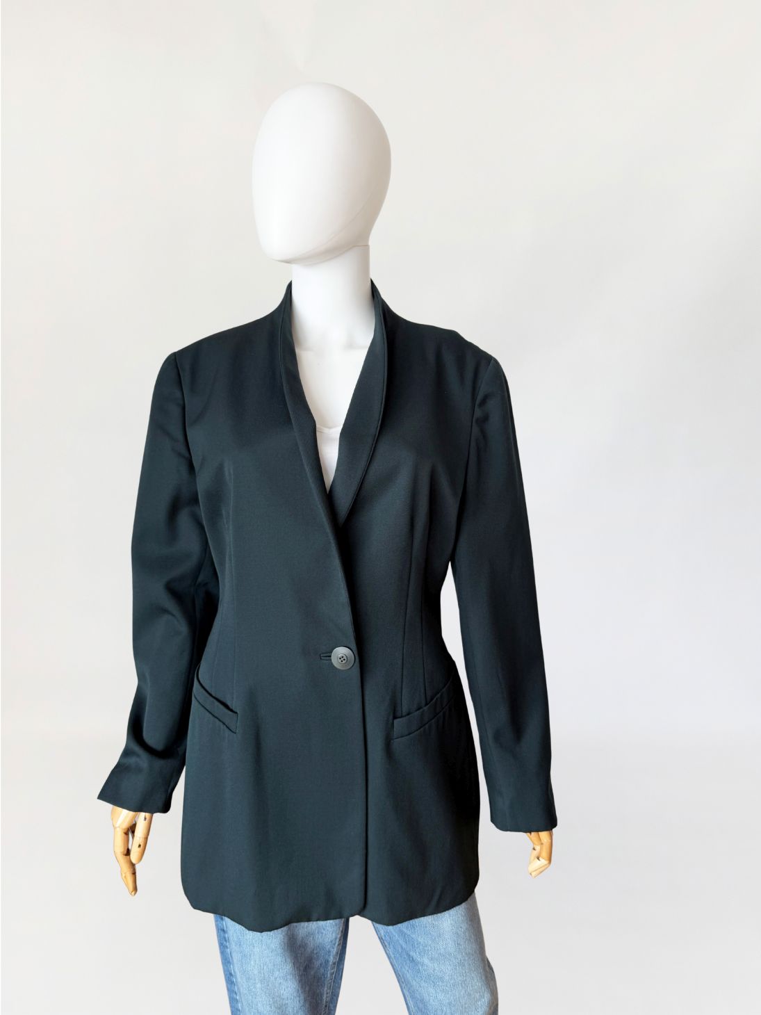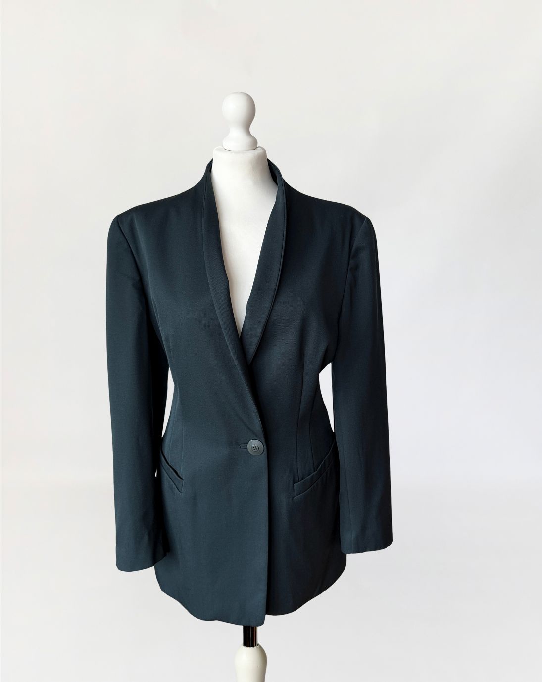 Minimalistyczna marynarka vintage marki Trussardi wykonana z wełnianej tkaniny w odcieniu butelkowej zieleni. Dłuższy fason, dopasowany poprzez pionowe cięcia modelujące w części tylnej i bocznej. Długie proste rękawy, zakończone mankietami z pojedynczym guzikiem. Przód z zapięciem na jeden guzik na wysokości pasa. Dekolt wykończony szeroką, miękko układającą się szalową formą bez klasycznych klap. Po bokach kieszenie wpuszczane z listewkami. Tył gładki, z centralnym szwem konstrukcyjnym.