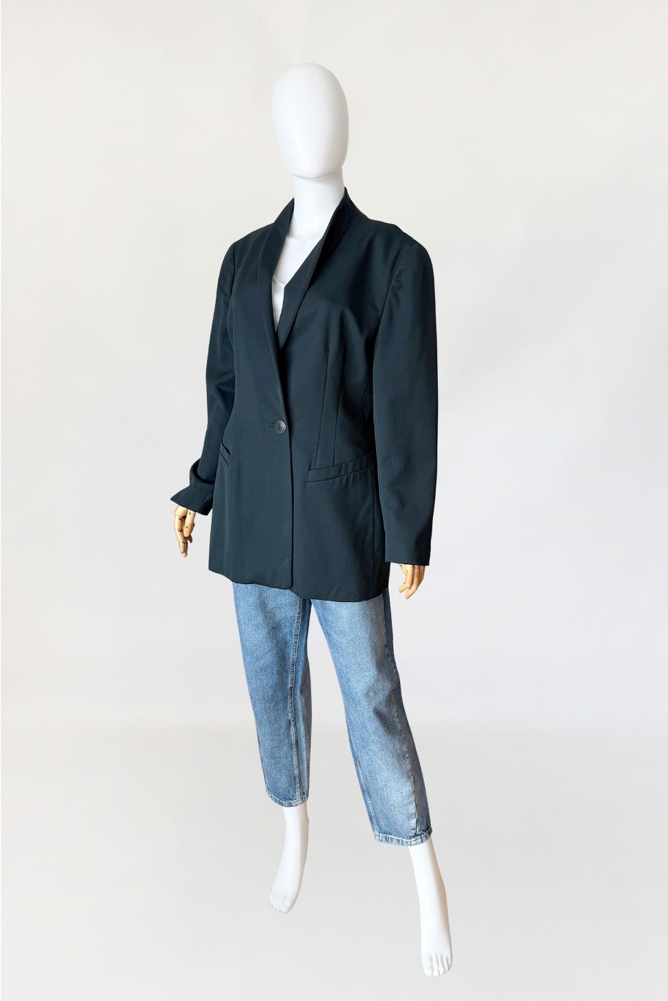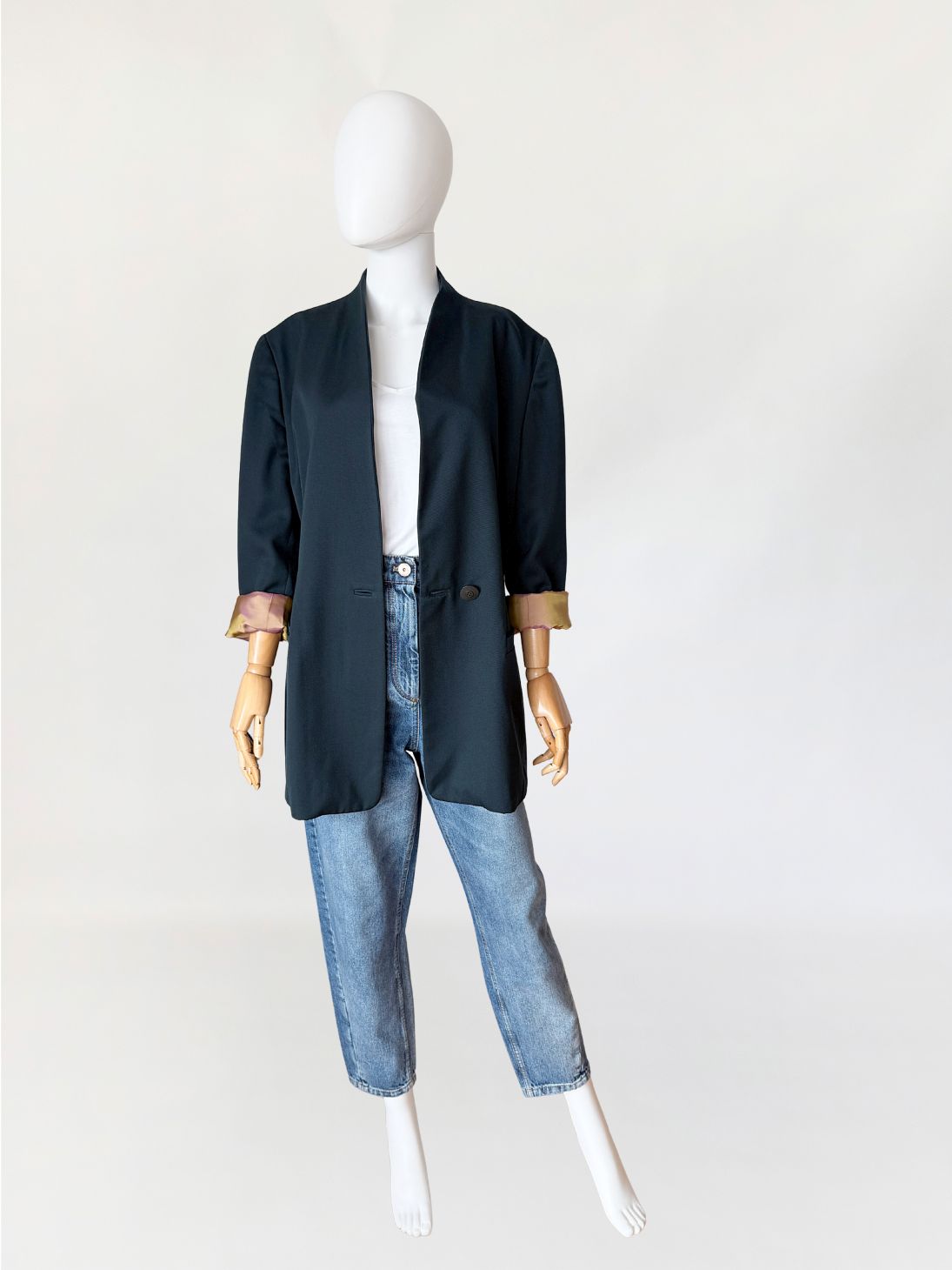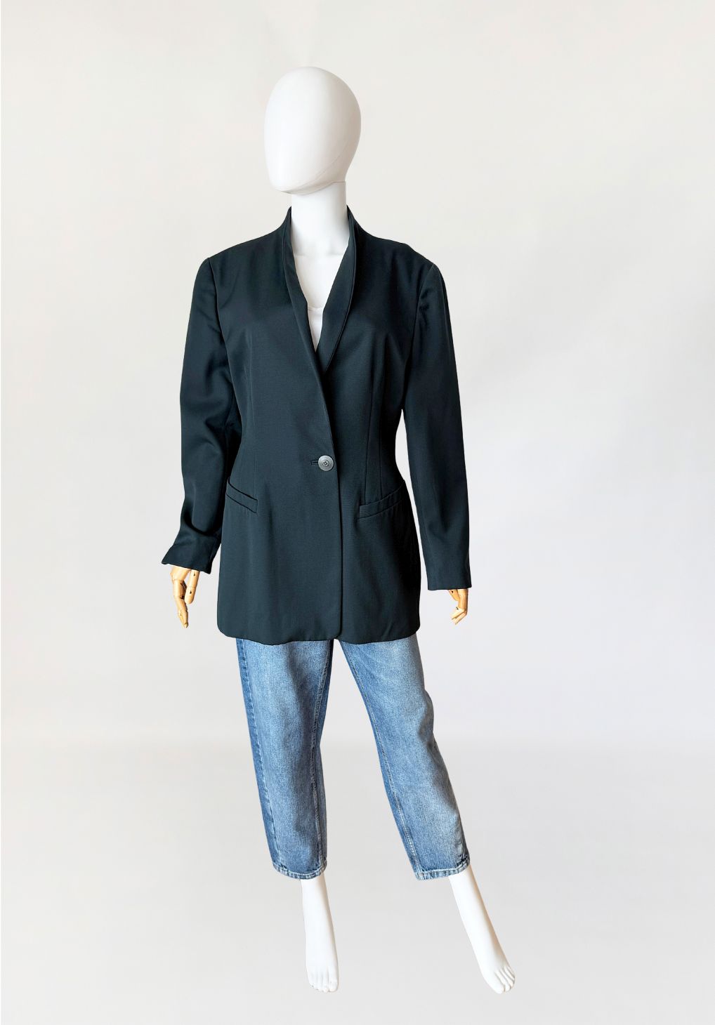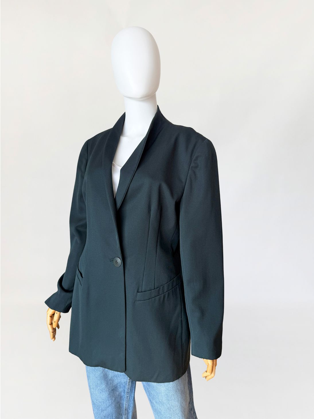 Minimalistyczna marynarka vintage marki Trussardi wykonana z wełnianej tkaniny w odcieniu butelkowej zieleni. Dłuższy fason, dopasowany poprzez pionowe cięcia modelujące w części tylnej i bocznej. Długie proste rękawy, zakończone mankietami z pojedynczym guzikiem. Przód z zapięciem na jeden guzik na wysokości pasa. Dekolt wykończony szeroką, miękko układającą się szalową formą bez klasycznych klap. Po bokach kieszenie wpuszczane z listewkami. Tył gładki, z centralnym szwem konstrukcyjnym.