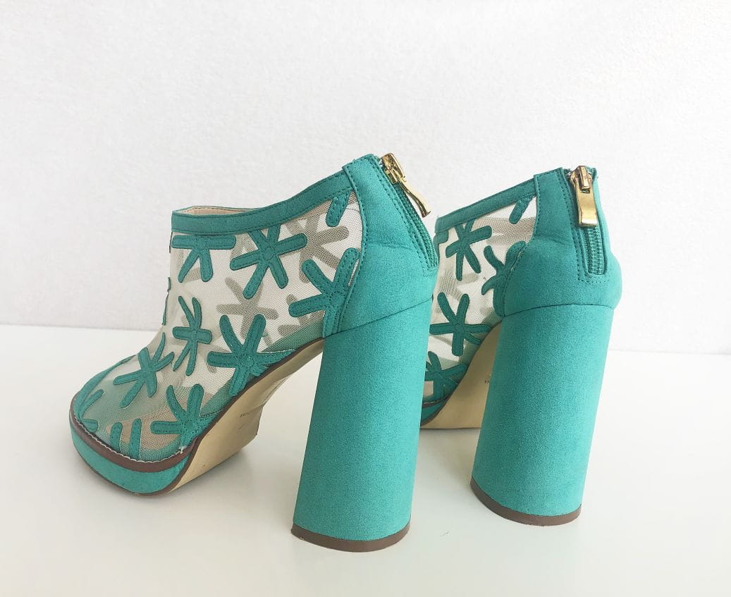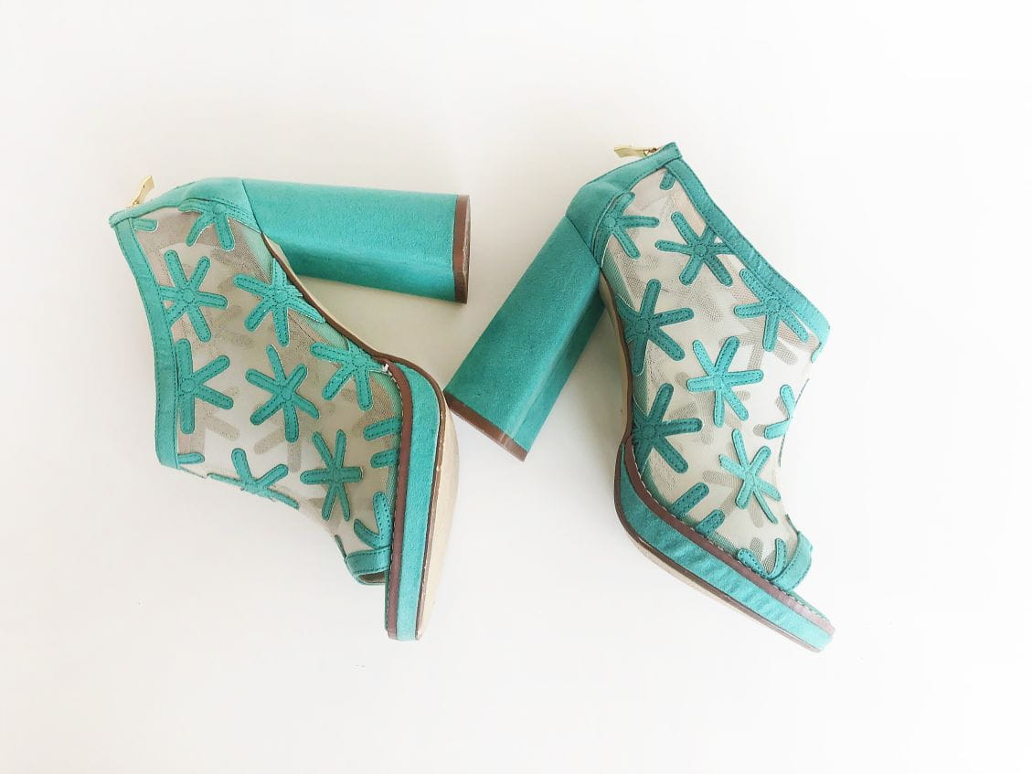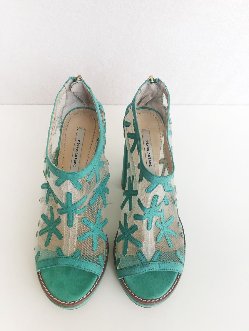 Turkusowe botki marki River Island. Górna część z siateczki obszytej ozdobnymi aplikacjami. Wykonane z tworzywa przypominającego zamsz. Model w stylu retro. Odkryte palce, osadzone na stabilnym szerokim słupku.