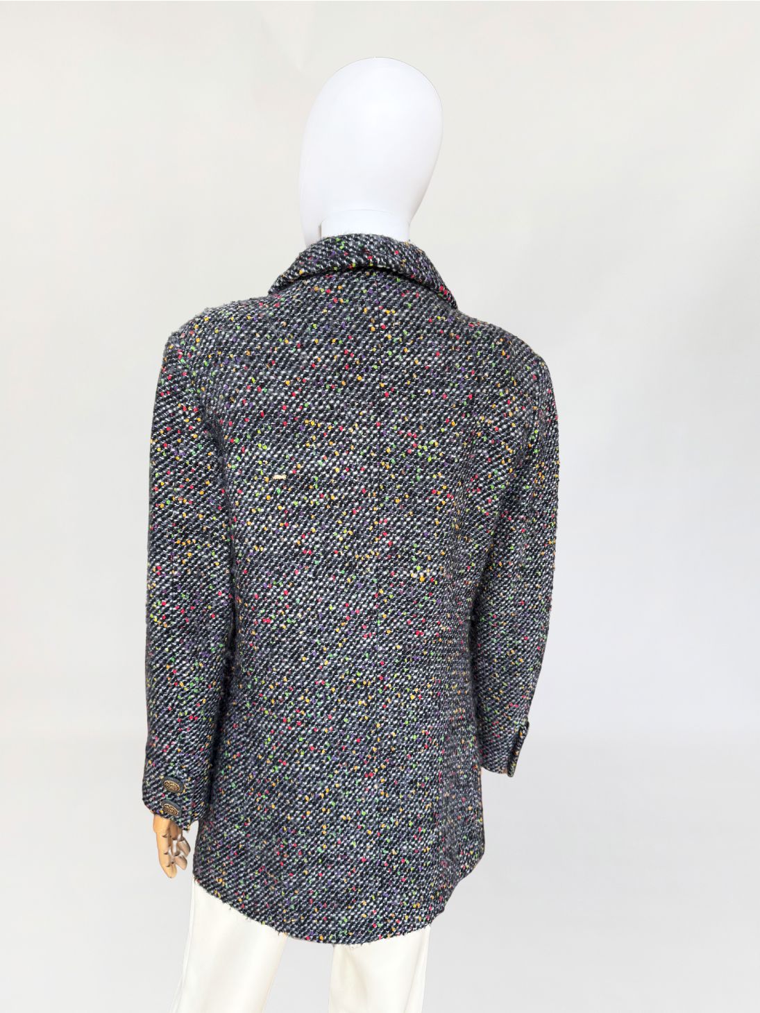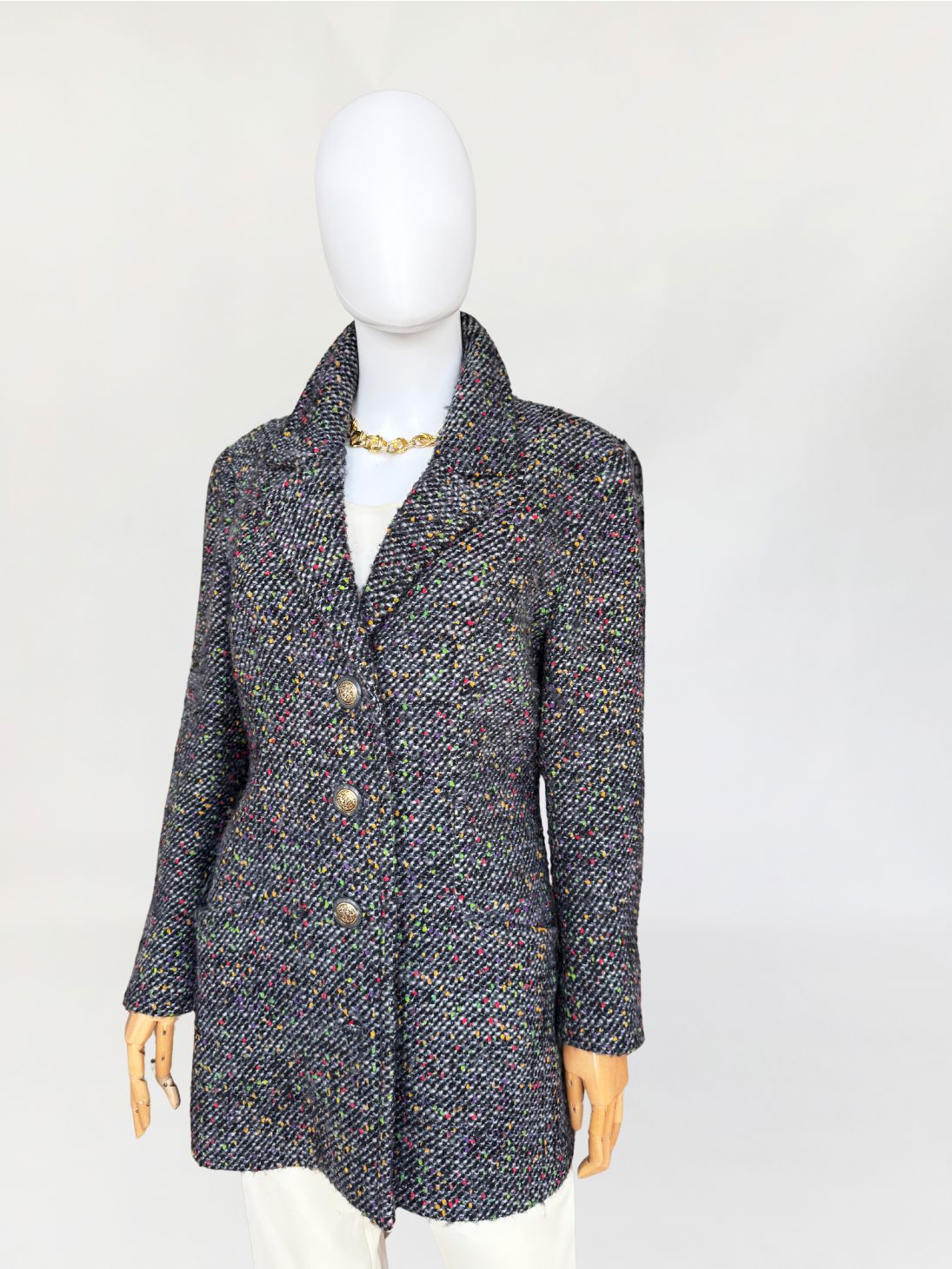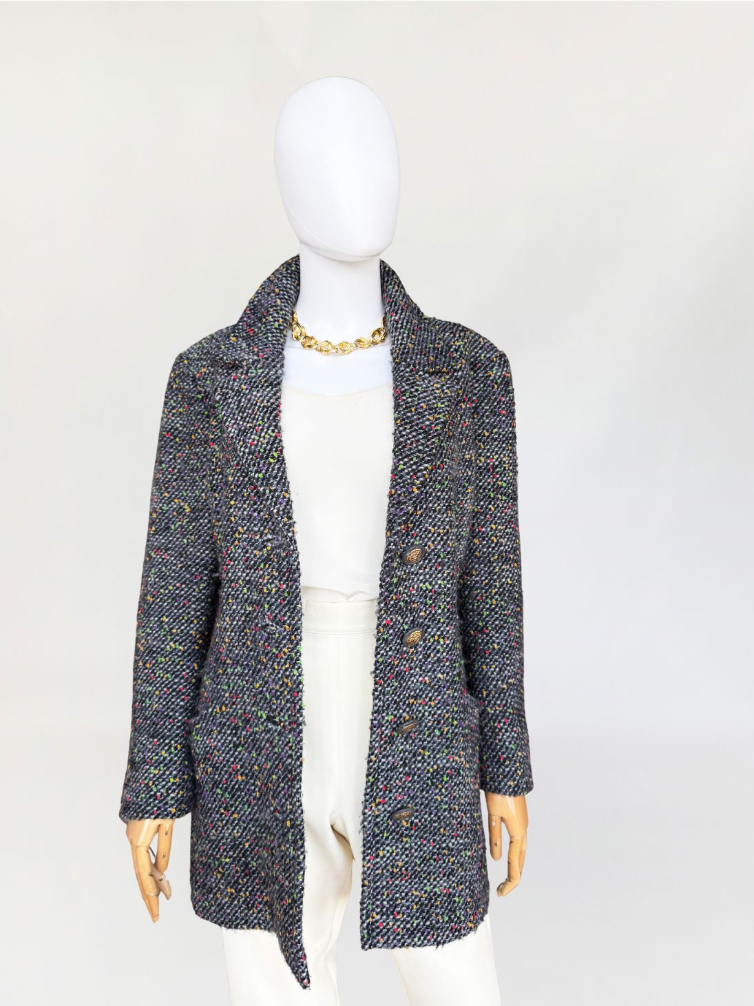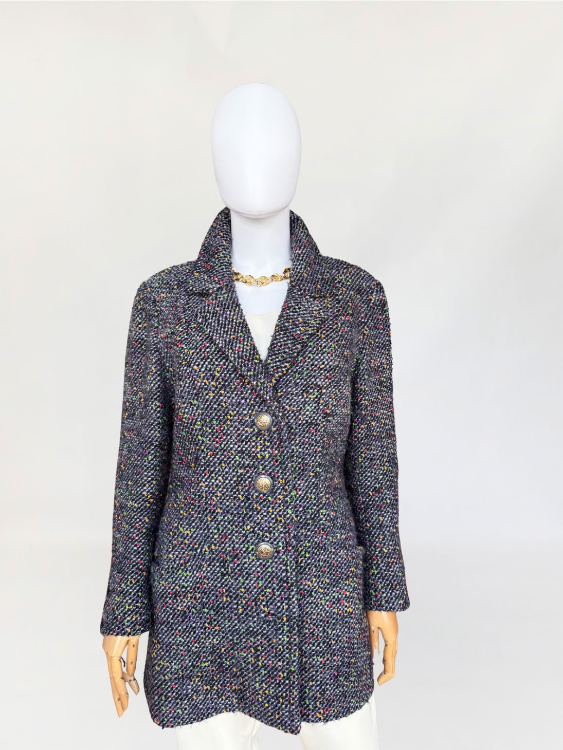 Marynarka vintage wykonana z grubszego tweedu o wyraźnym, przestrzennym splocie. Tkanina utrzymana w odcieniu grafitu z wielobarwnymi akcentami wplecionymi w strukturę przędzy. Model o wydłużonej, lekko taliowanej linii z szerokim kołnierzem z klapami, zapinany na cztery ozdobne guziki. Kieszenie z patkami, rękawy proste.