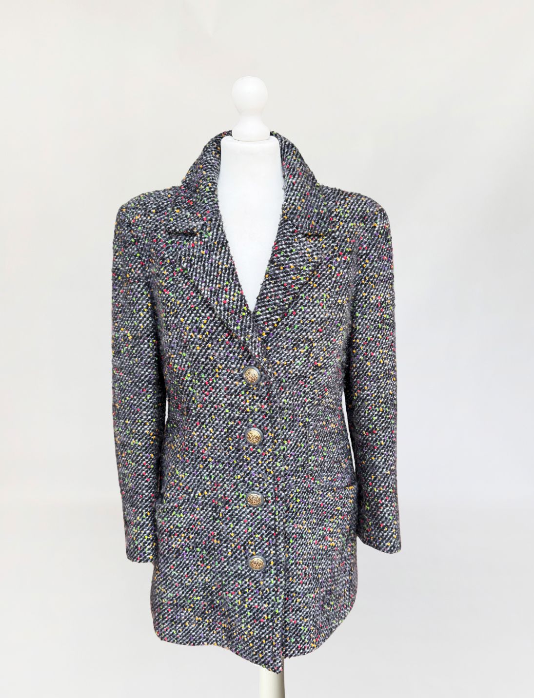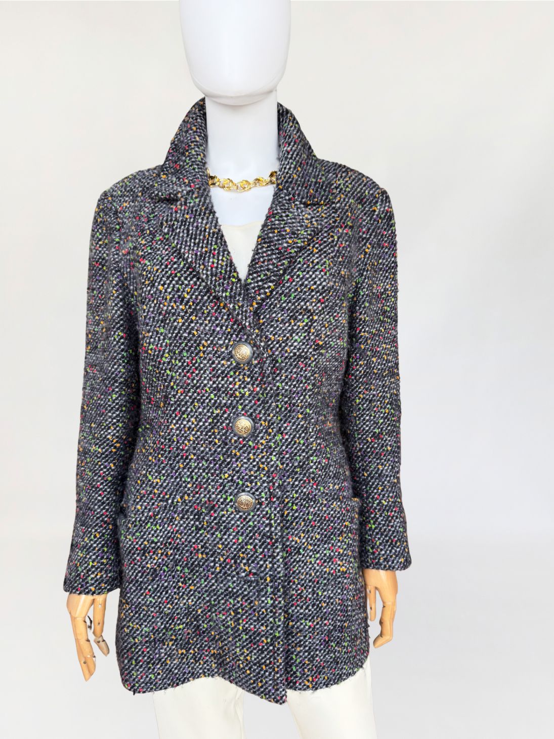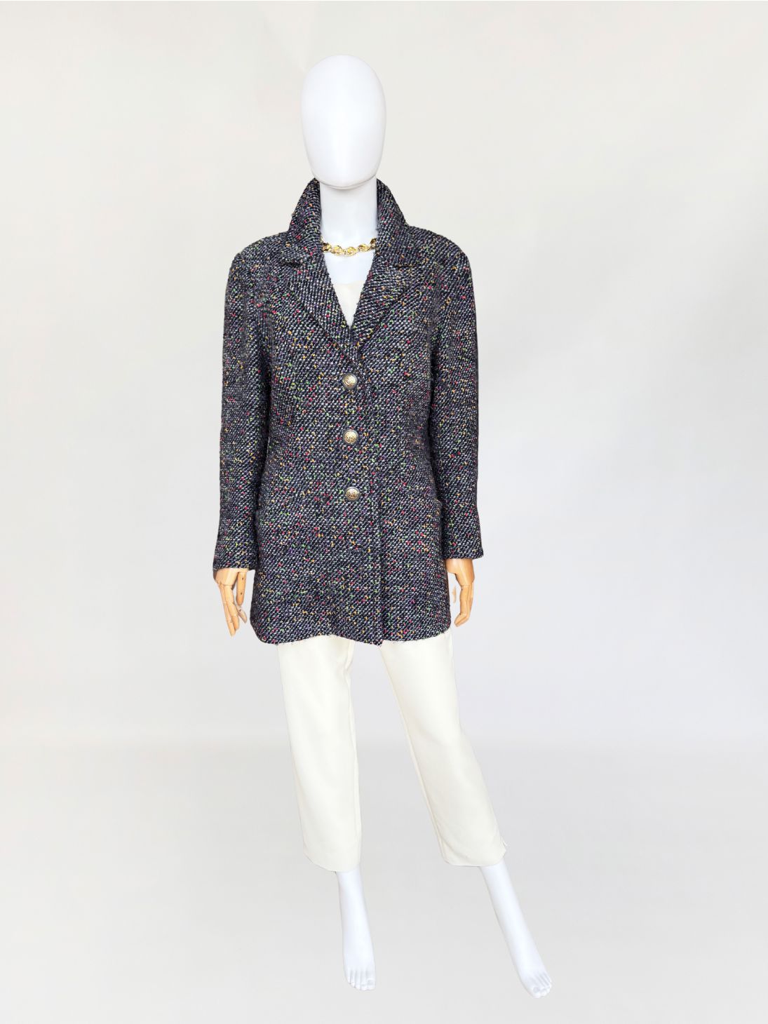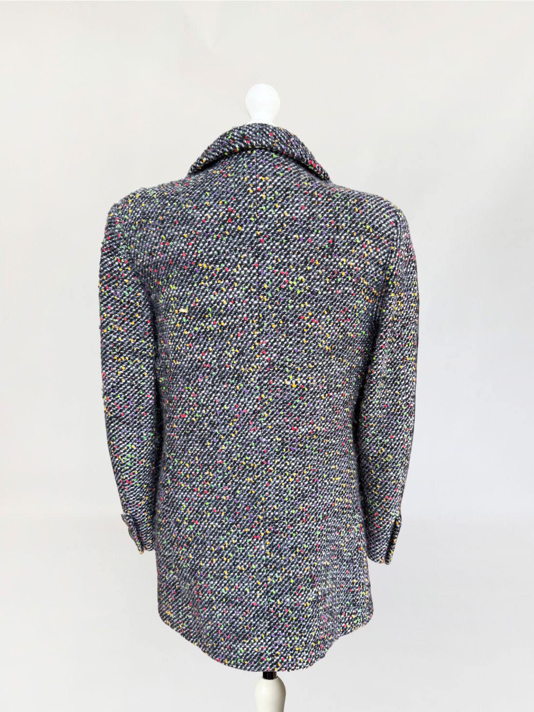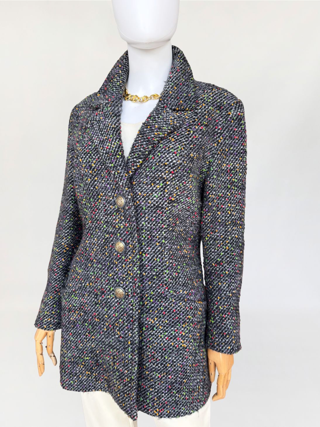 Marynarka vintage wykonana z grubszego tweedu o wyraźnym, przestrzennym splocie. Tkanina utrzymana w odcieniu grafitu z wielobarwnymi akcentami wplecionymi w strukturę przędzy. Model o wydłużonej, lekko taliowanej linii z szerokim kołnierzem z klapami, zapinany na cztery ozdobne guziki. Kieszenie z patkami, rękawy proste.