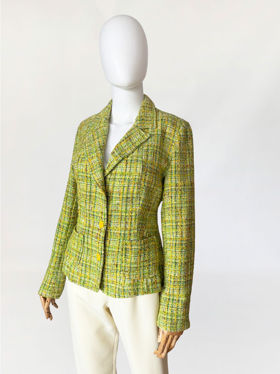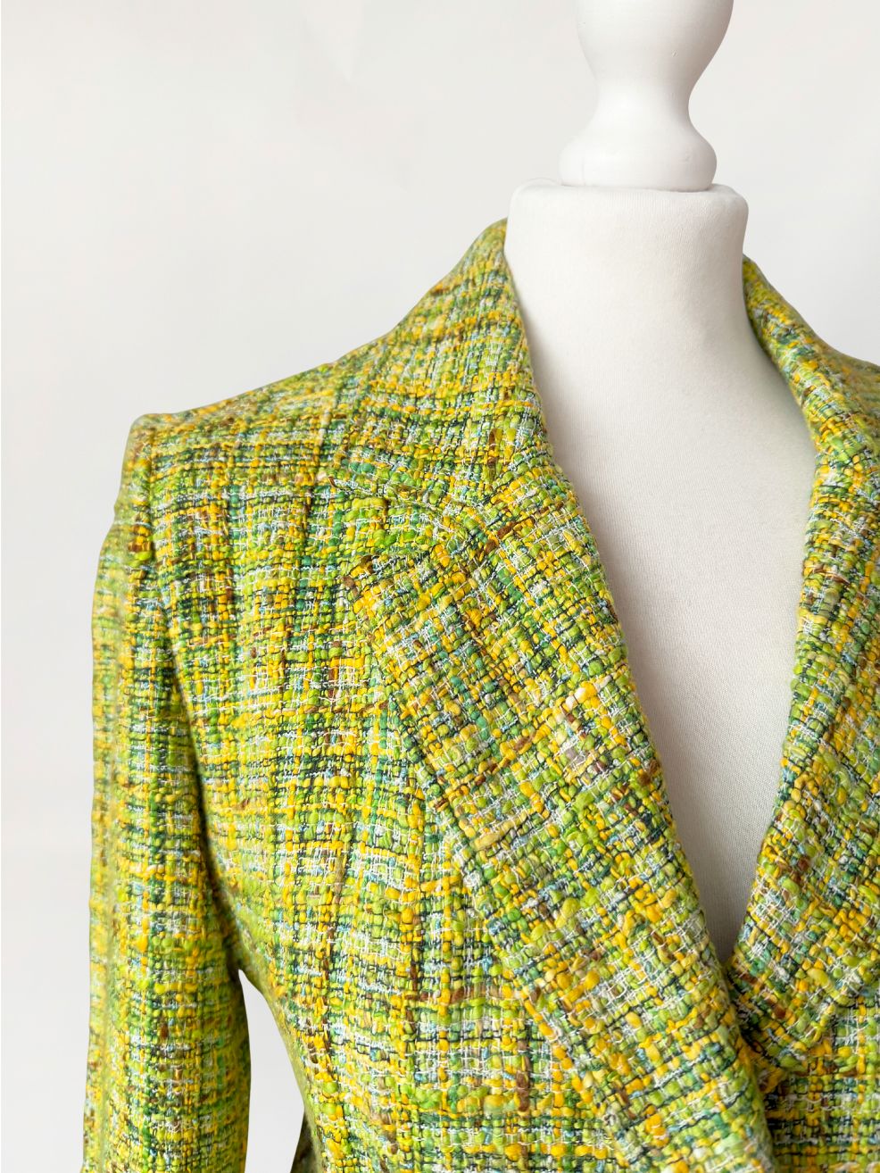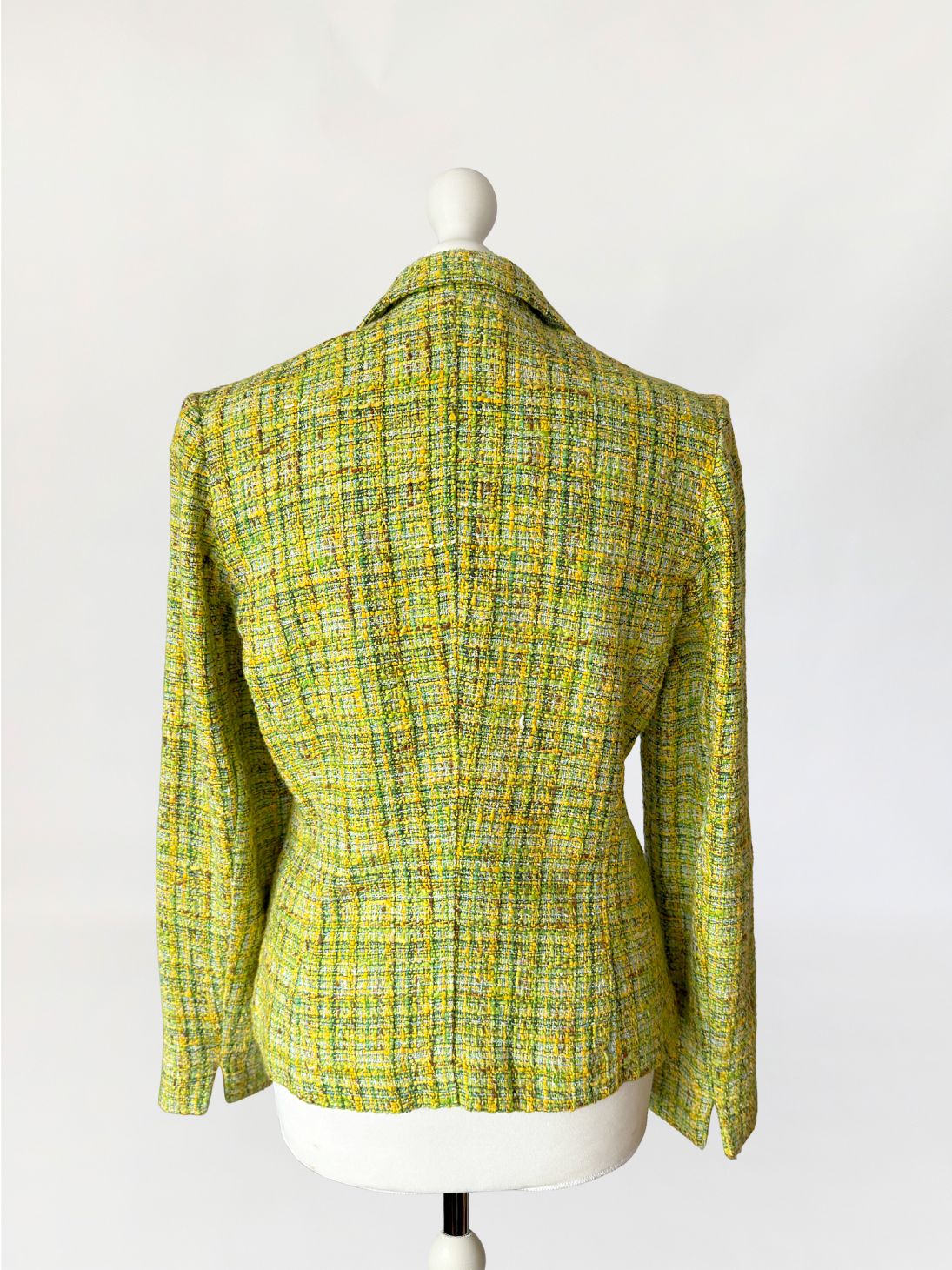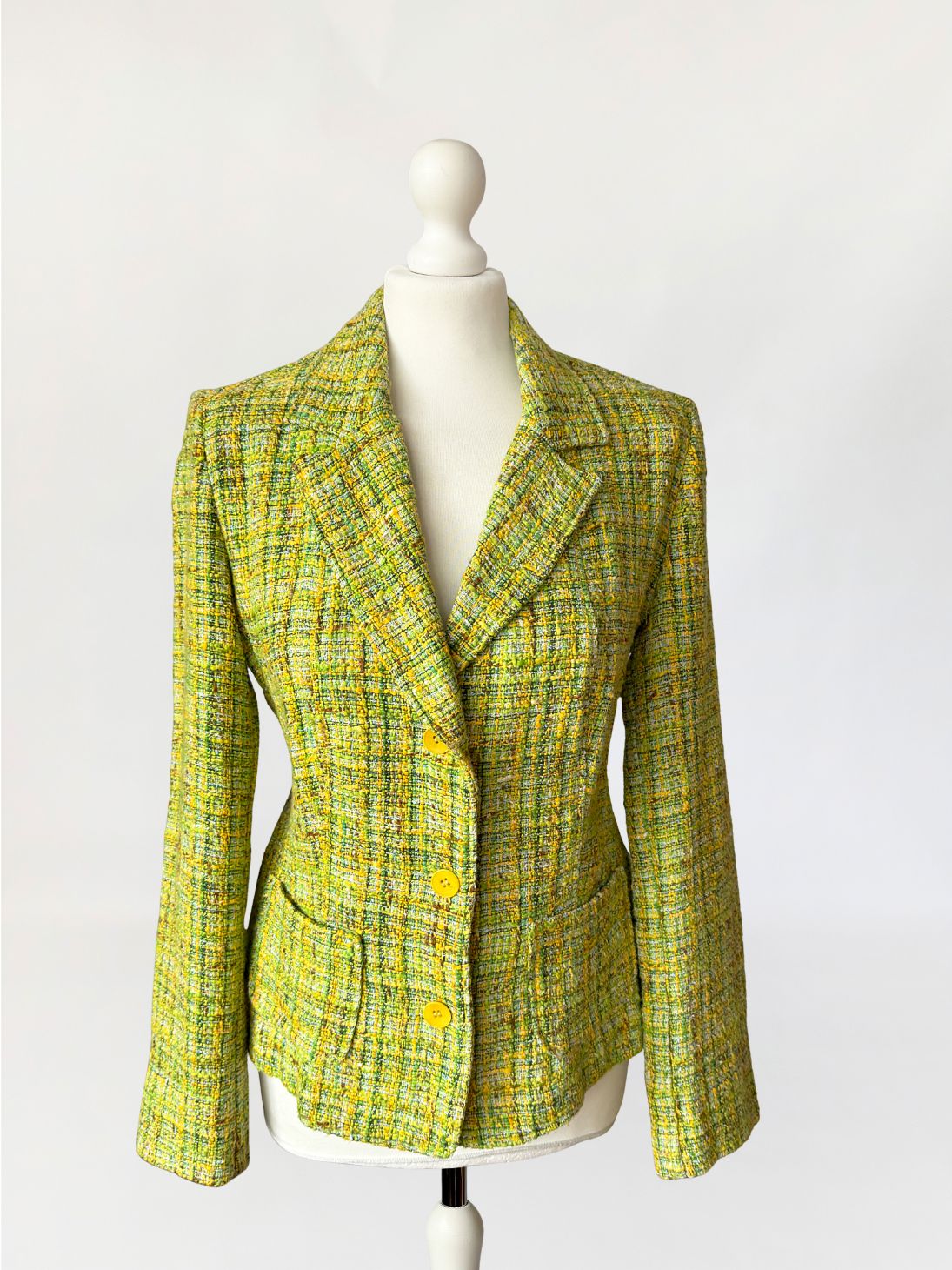 Marynarka vintage wykonana z bawełnianego tweedu w soczystej tonacji żółci, zieleni i drobnych przełamań bieli. Dopasowany, taliowany fason z klasycznie wszytymi długimi rękawami i wyraźnie zarysowaną linią ramion. Kołnierz z szerokimi rewersami, front zapinany na trzy guziki w intensywnie żółtym kolorze. W dolnej części naszyte nieduże kieszenie o miękko zaokrąglonych krawędziach, zintegrowane z linią konstrukcyjną przodu. Tył modelowany pionowymi cięciami.