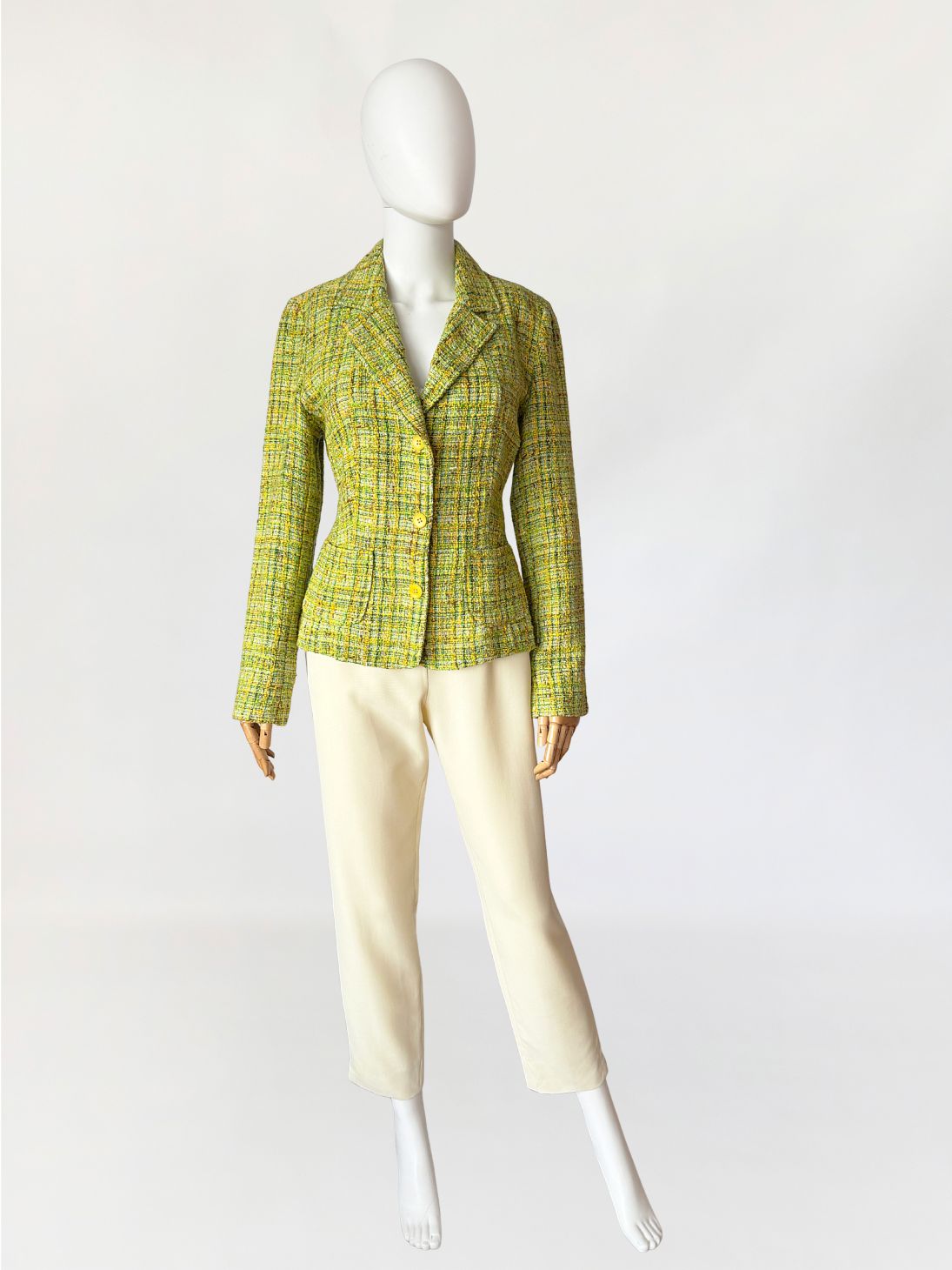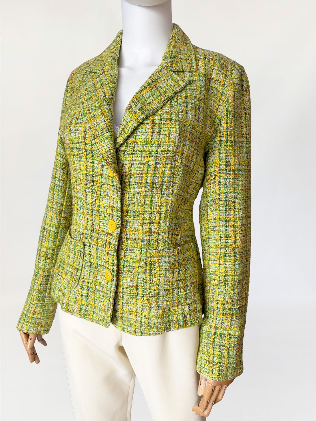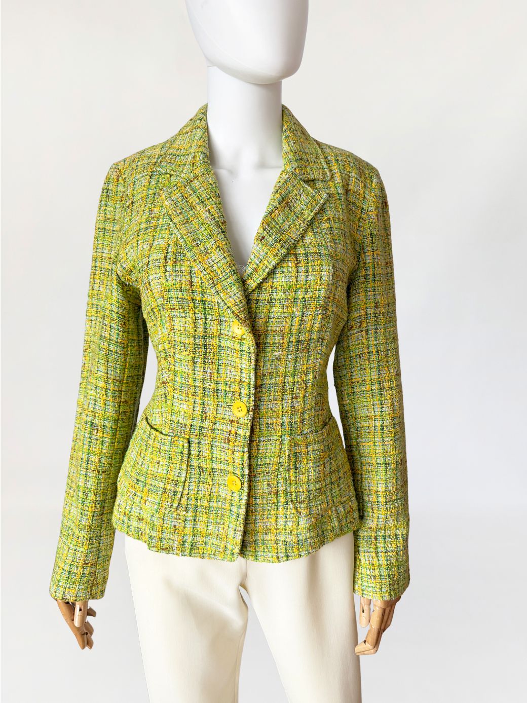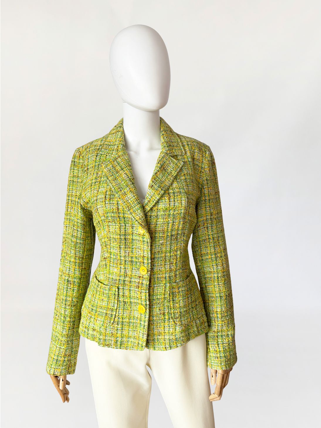 Marynarka vintage wykonana z bawełnianego tweedu w soczystej tonacji żółci, zieleni i drobnych przełamań bieli. Dopasowany, taliowany fason z klasycznie wszytymi długimi rękawami i wyraźnie zarysowaną linią ramion. Kołnierz z szerokimi rewersami, front zapinany na trzy guziki w intensywnie żółtym kolorze. W dolnej części naszyte nieduże kieszenie o miękko zaokrąglonych krawędziach, zintegrowane z linią konstrukcyjną przodu. Tył modelowany pionowymi cięciami.