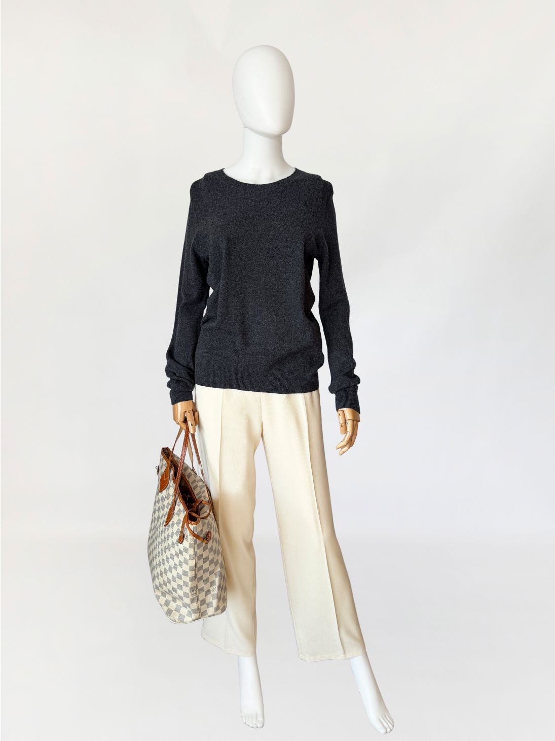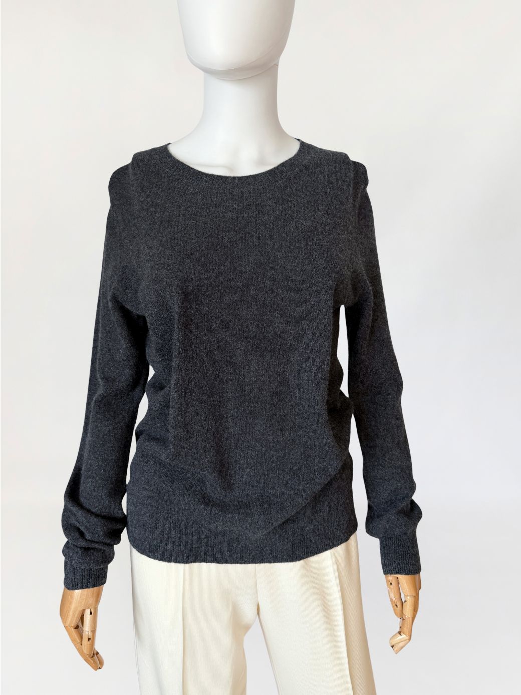 Sweter japońskiej marki Uniqlo wykonany w 100% z miękkiego kaszmiru w grafitowym kolorze. Klasyczny fason z okrągłym dekoltem. Długie rękawy wszywane klasycznie. Wykończenie przy dekolcie, mankietach i dolnej krawędzi w formie ściągacza.