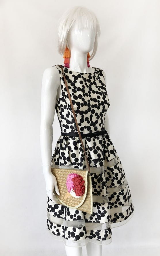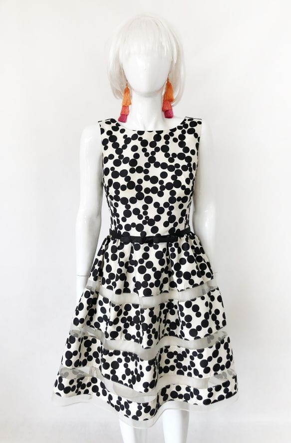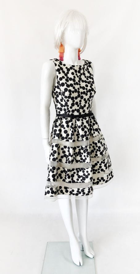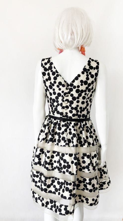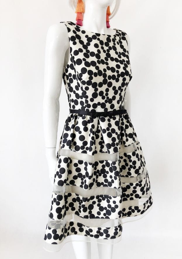 Jedwabna sukienka renomowanej marki Untold. Rozkloszowany fason, u dołu wstawki - pasy z przezroczystej organy. Plecy rozpinane, dół rozsuwany. W talii wszyty cienki czarny pasek z niewielką kokardą. Model z podszewką.