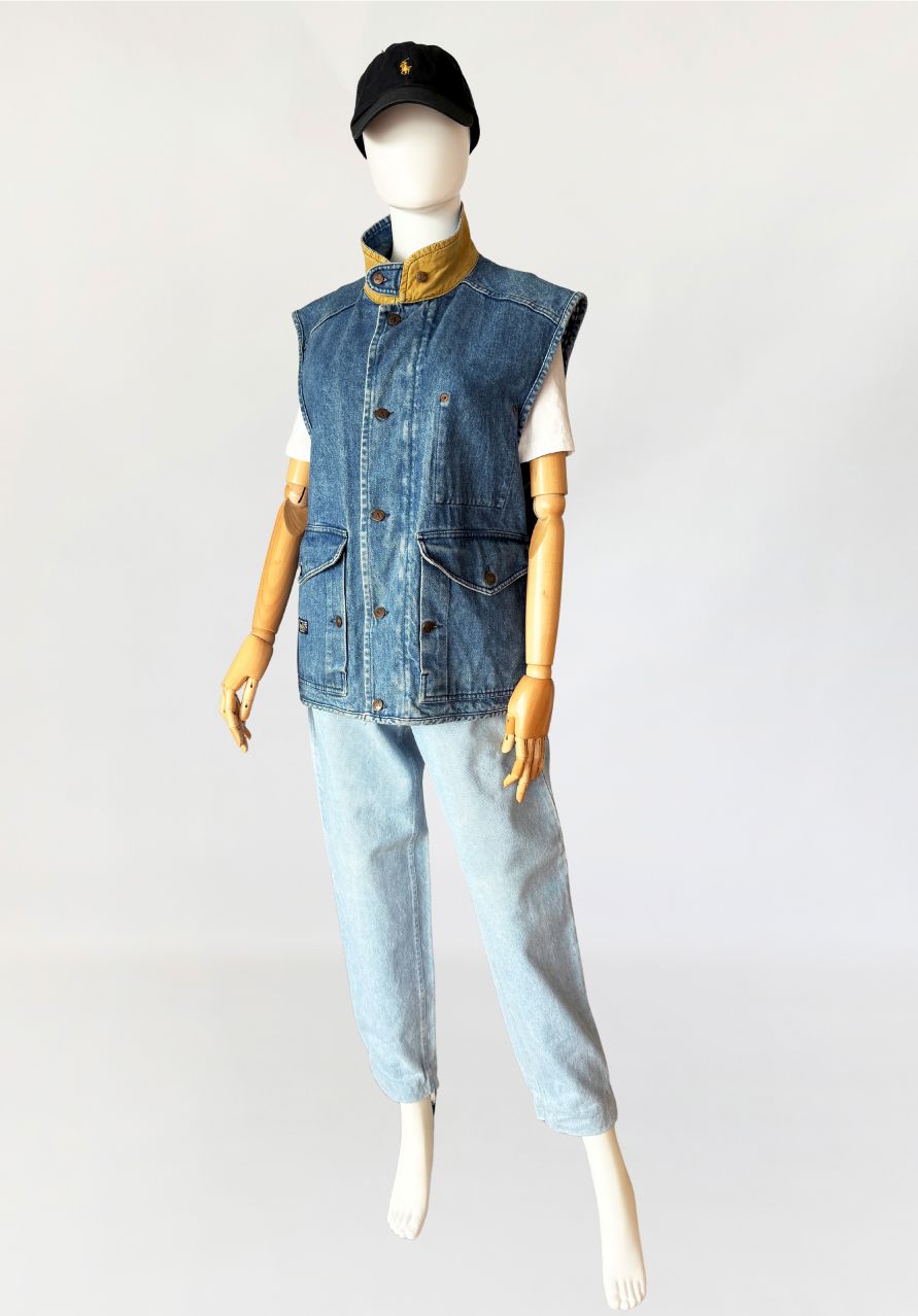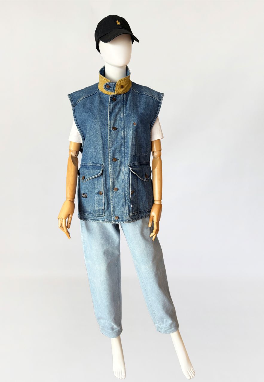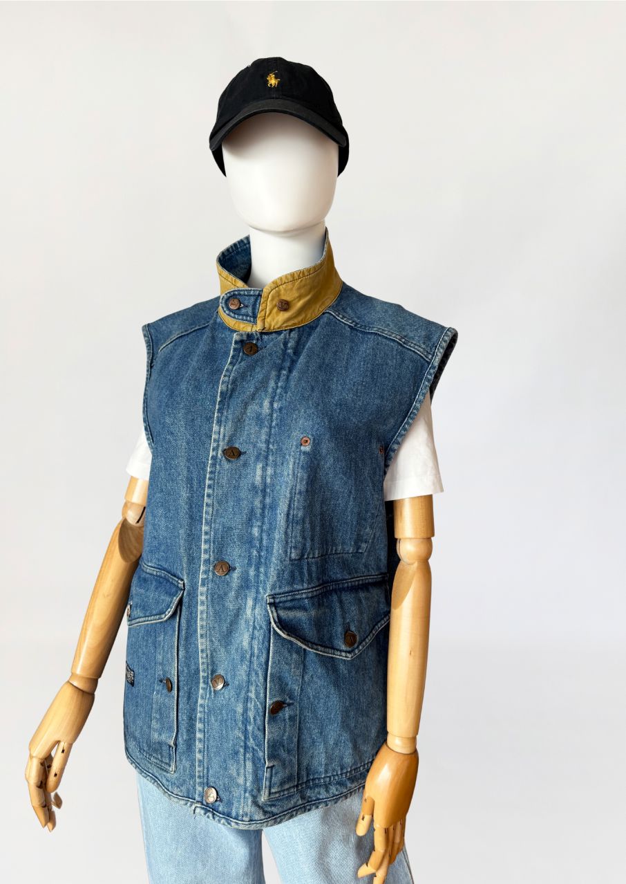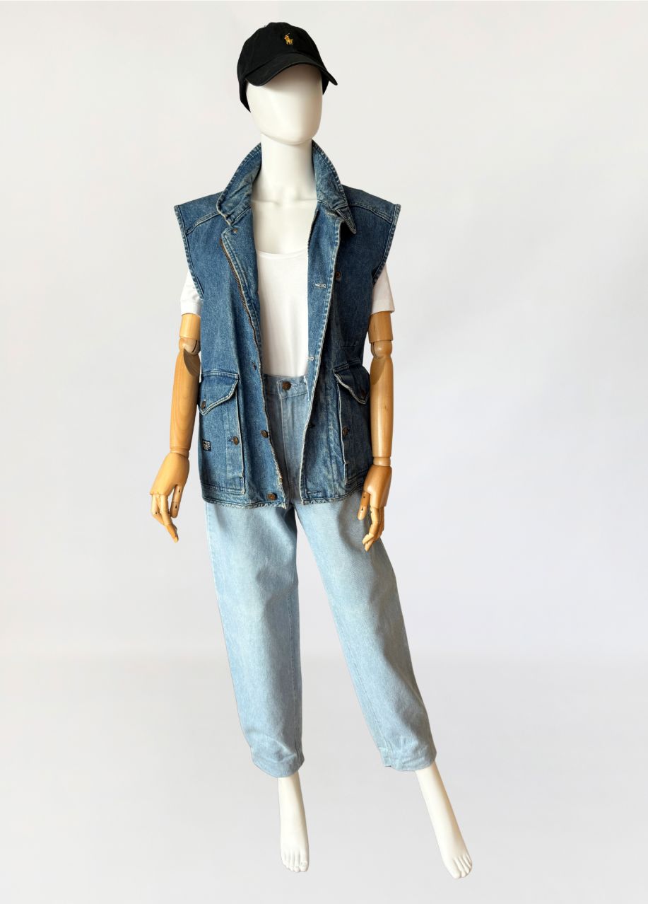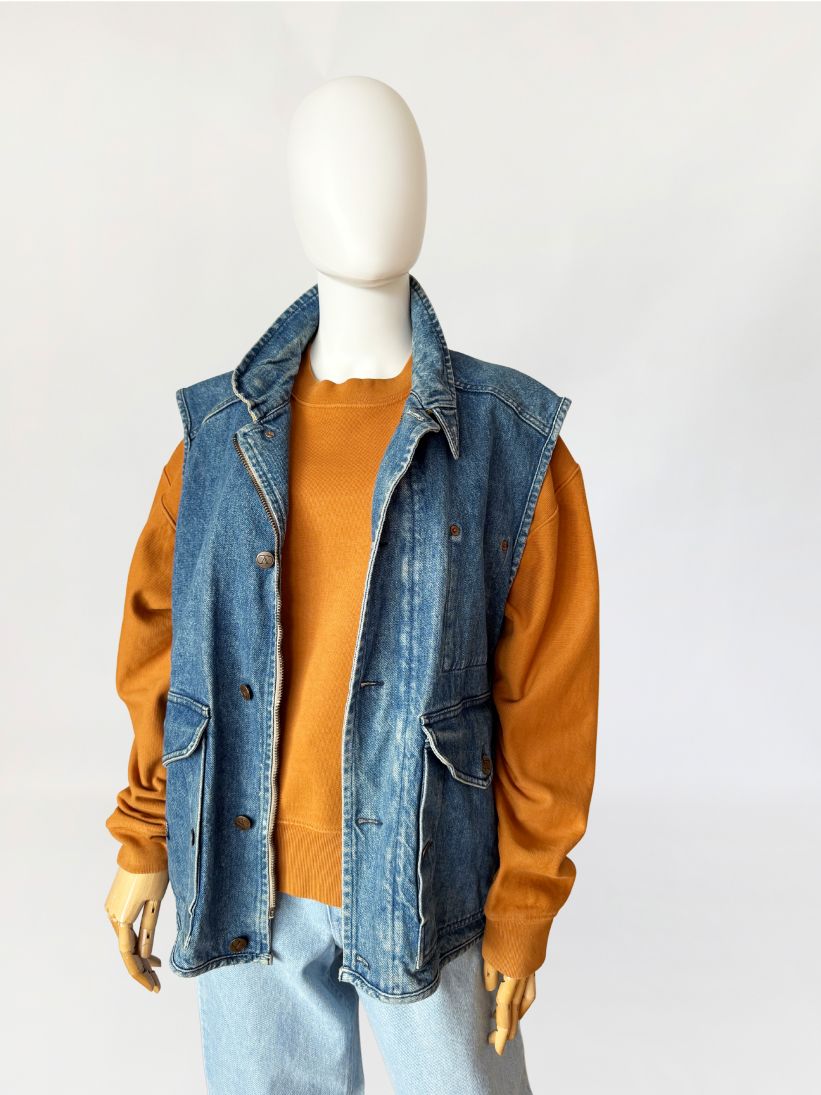 Rzadki egzemplarz z przełomu lat 80-tych/90-tych marki Valentino. Kamizelka wykonana w całości z mocnego denimu w spokojnym niebieskim kolorze. Prosty fason z wysoką stójką. dół regulowany po bokach przepięciem na guzik. Zasuwana na zamek i przepinana na duże metalowe logowane guziki. Od wewnątrz na bawełnianej kraciastej podszewce z haftowanymi inicjałami marki. Model unisex. W dolnej części naszyte duże kieszenie z klapami.