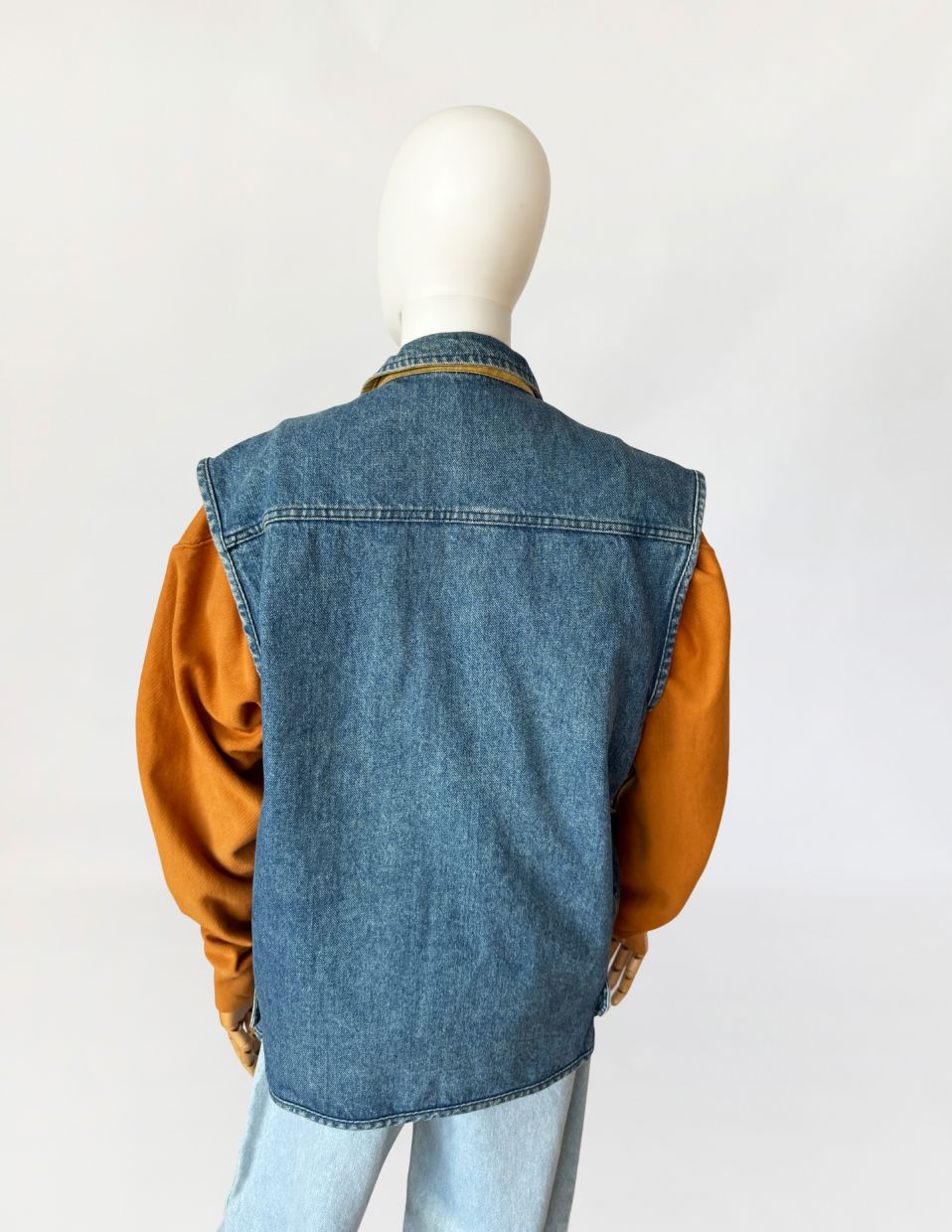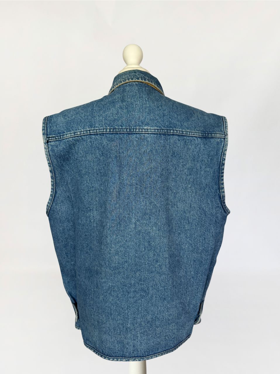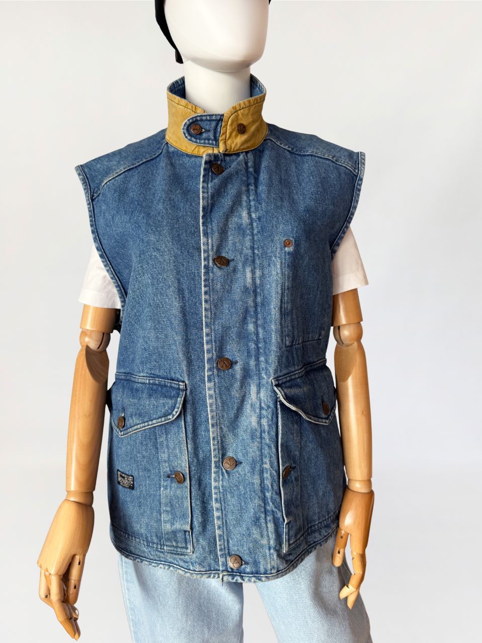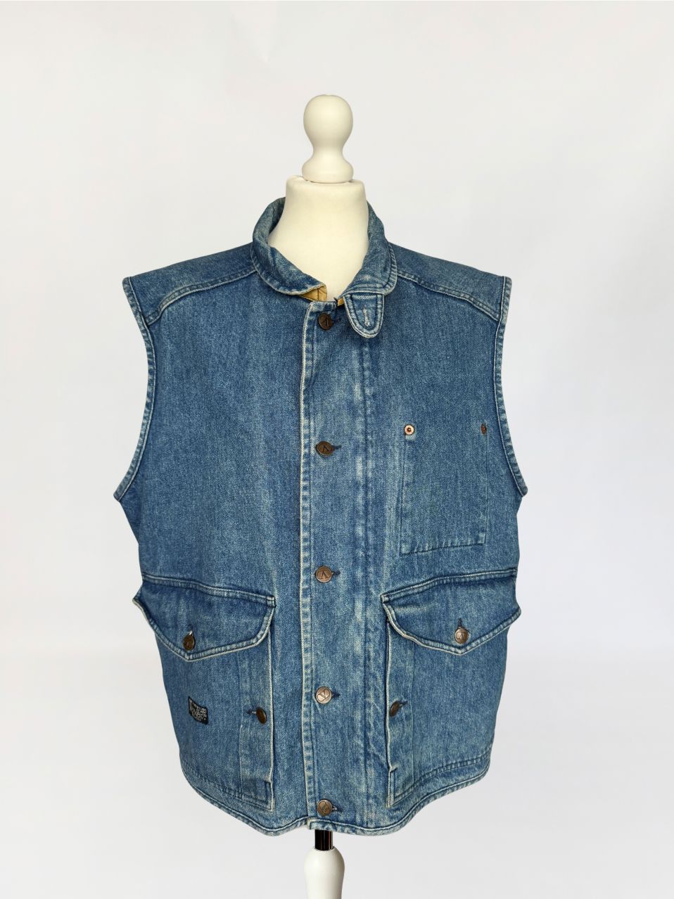 Rzadki egzemplarz z przełomu lat 80-tych/90-tych marki Valentino. Kamizelka wykonana w całości z mocnego denimu w spokojnym niebieskim kolorze. Prosty fason z wysoką stójką. dół regulowany po bokach przepięciem na guzik. Zasuwana na zamek i przepinana na duże metalowe logowane guziki. Od wewnątrz na bawełnianej kraciastej podszewce z haftowanymi inicjałami marki. Model unisex. W dolnej części naszyte duże kieszenie z klapami.